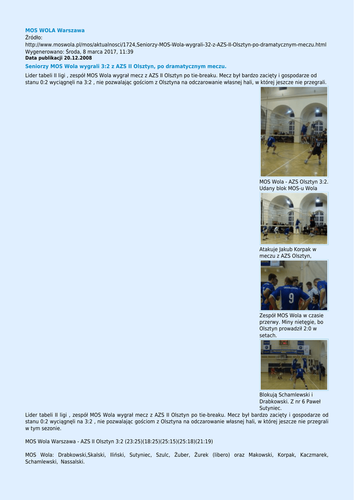 MOS WOLA Warszawa Źródło: http://www.moswola.pl/mos/aktualnosci/1724,Seniorzy-MOS-Wola-wygrali-32-z-AZS-II-Olsztyn-po-dramatycznym-meczu.html Wygenerowano: Środa, 8 marca 2017, 11:39 Data publikacji 20.12.2008 Seniorzy MOS Wola wygrali 3:2 z AZS II Olsztyn, po dramatycznym meczu. Lider tabeli II ligi , zespół MOS Wola wygrał mecz z AZS II Olsztyn po tie-breaku. Mecz był bardzo zacięty i gospodarze od stanu 0:2 wyciągnęli na 3:2 , nie pozwalając gościom z Olsztyna na odczarowanie własnej hali, w której jeszcze nie przegrali. MOS Wola - AZS Olsztyn 3:2. Udany blok MOS-u Wola Atakuje Jakub Korpak w meczu z AZS Olsztyn, Zespół MOS Wola w czasie przerwy. Miny nietęgie, bo Olsztyn prowadził 2:0 w setach. Blokują Schamlewski i Drabkowski. Z nr 6 Paweł Sutyniec. Lider tabeli II ligi , zespół MOS Wola wygrał mecz z AZS II Olsztyn po tie-breaku. Mecz był bardzo zacięty i gospodarze od stanu 0:2 wyciągnęli na 3:2 , nie pozwalając gościom z Olsztyna na odczarowanie własnej hali, w której jeszcze nie przegrali w tym sezonie. MOS Wola Warszawa - AZS II Olsztyn 3:2 (23:25)(18:25)(25:15)(25:18)(21:19) MOS Wola: Drabkowski,Skalski, Iliński, Sutyniec, Szulc, Żuber, Żurek (libero) oraz Makowski, Korpak, Kaczmarek, Schamlewski, Nassalski. AZS II Olsztyn : Pietkiewicz, Krzan, Piłat, Szablewski, Wiśniewski, Kowzowicz, Nawrocki (libero) oraz Pichłacz, Tański, Michalski. W pierwszym secie gra była ciekawa i stała na niezłym poziomie. Widać było, że zawodnicy z Olsztyna przyjechali walczyć i od początku grali odważnie w ataku , bardzo dobrze w obronie i skutecznie blokiem. Olsztynianie prowadzili 8:4 (trener Szulc poprosił o czas), ale MOS Wola zmobilizował się i po okresie dobrej gry gospodarze wyrównali na 9:9. Potem często wynik był remisowy, a publiczność oglądała ładne akcje z obu stron. Pod koniec seta MOS Wola prowadził 22:19, 23:21, ale sama końcówka należała do gości , którzy po kilku bardzo pięknych akcjach zdobyli w jednym ustawieniu cztery punkty i wygrali seta 25:23. W drugiej partii AZS Olsztyn poszedł " za ciosem" i grając momentami doskonale uzyskał bardzo wysokie prowadzenie. Goście prowadzili 5:0, 11:3, 16:8. Trener Piotr Szulc brał czasy, dokonywał zmian zawodników, ale olsztynianie wysoko prowadzili. Było już 20:10, a MOS Wola w jednym ustawieniu zdobył sześć punktów i zmniejszył różnicę do rywali oraz ostudził grę AZS Olsztyn. Goście wygrali seta 25:18. Trzeci set rozpoczął się wyrównaną walką do stanu 4:4, ale potem MOS Wola grając bardzo konsekwentnie, systematycznie zwiększał przewagę. Siatkarze z Woli prowadzili 10:7, 15:8 , 16:9 i grając coraz lepiej wygrali bardzo wysoko seta 25:15. W czwartym secie MOS Wola nadal grał dobrze , coraz lepiej blokiem i gospodarze prowadzili 9:5, 11:6, 16:11. Goście stracili impet z pierwszych setów, gospodarze zaś grali uważnie, skutecznie i kontrolowali przebieg wydarzeń na boisku. W ważnych momentach ciężar gry brał na siebie doświadczony Piotr Szulc. Dobrze przyjmowali zagrywkę grający od drugiego seta Jakub Korpak oraz libero Michał Żurek, nieźle spisywali się środkowi Mariusz Schamlewski i Robert Iliński , których świetnie obsługiwał Marcin Drabkowski. Seta wygrali gospodarze 25:18 i o wszystkim miał zadecydować tie-break. Piąta partia to prawdziwy horror. Obydwa zespoły nie zamierzały skapitulować i trwała zażarta walka. Świetnie rozpoczęli gospodarze od stanu 3:0, ale AZS Olsztyn nadal walczył. MOS Wola prowadził 6:4, 8:5, ale olsztynianie po świetnych kontratakach wyrównali na 9:9 i od tego momentu trwała niesamowita walka. Było 12:12, 13:13 , a następnie AZS Olsztyn wyszedł na prowadzenie 14:13 , miał, piłkę meczową , ale MOS Wola wyrównał na 14:14. Olsztynianie protestowali, że siatkarze z Woli mieli cztery odbiacia. Walka trwała nadal , a AZS prowadził jeszcze 15:14, 16:15, 17:16 , 18:17, 19:18, ale MOS Wola nie poddawał się i walczył z determinacją. Wreszcie gospodarze wyrównali na 19:19 , a następnie zdobyli dwa kolejne punkty i wygrali tego dramatycznego seta 21:19. Olsztynianom nie udało się więc odczarować hali MOS Wola i gospodarze są nadal niepokonaną drużyną we własnej hali. w tym sezonie. Komentarz (0) dodaj komentarz Brak komentarzy dodaj komentarz