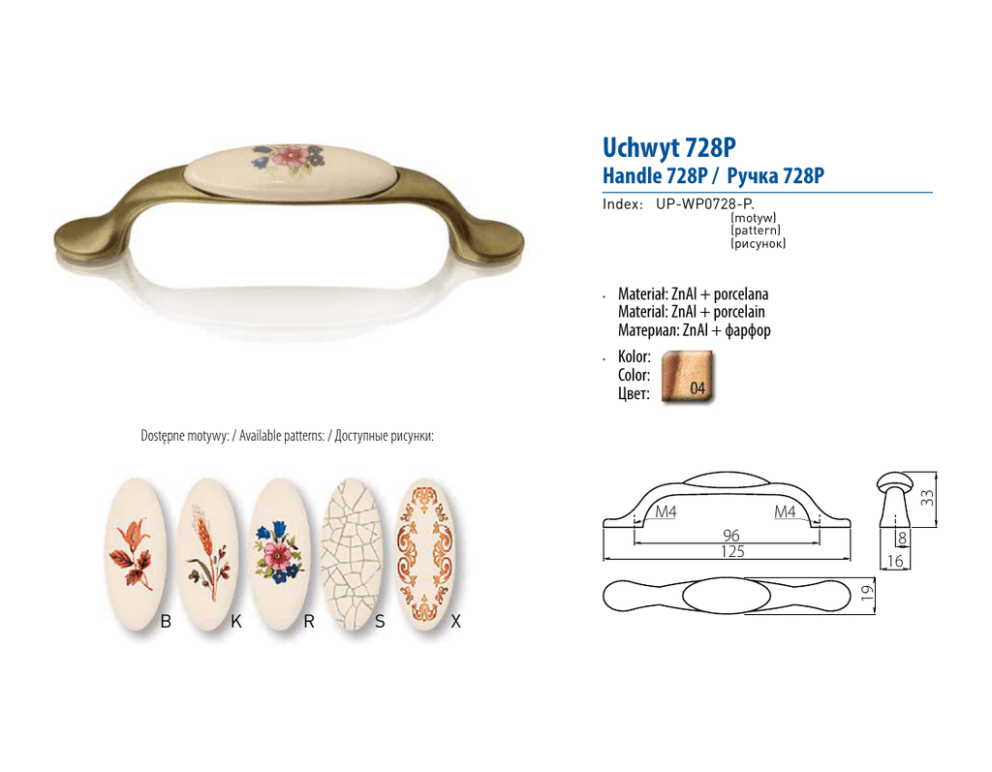 Uchwyt 728P Handle 728P / Ручка 728P Index: UP-WP0728-P. (motyw) (pattern) (рисунок) Materiał: ZnAl + porcelana Material: ZnAl + porcelain Материал: ZnAl + фарфор • Kolor: Color: Цвет: • M4 33 Dostępne motywy: / Available patterns: / Доступные рисунки: M4 96 125 19 8 16 B K R S X
