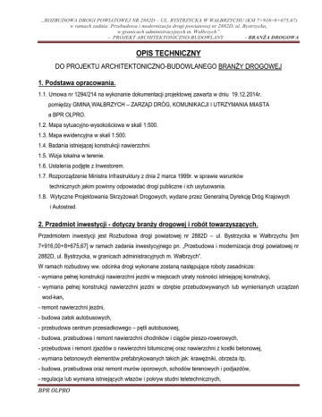 „ROZBUDOWA DROGI POWIATOWEJ NR 2882D – UL. BYSTRZYCKA W WAŁBRZYCHU (KM 7+916÷8+675,67) w ramach zadnia: Przebudowa i modernizacja drogi powiatowej nr 2882D, ul. Bystrzycka, w granicach administracyjnych m. Wałbrzych” - PROJEKT ARCHITEKTONICZNO-BUDOWLANY - BRANŻA DROGOWA OPIS TECHNICZNY DO PROJEKTU ARCHITEKTONICZNO-BUDOWLANEGO BRANśY DROGOWEJ 1. Podstawa opracowania. 1.1. Umowa nr 1294/214 na wykonanie dokumentacji projektowej zawarta w dniu 19.12.2014r. pomiędzy GMINĄ WAŁBRZYCH – ZARZĄD DRÓG, KOMUNIKACJI I UTRZYMANIA MIASTA a BPR OLPRO. 1.2. Mapa sytuacyjno-wysokościowa w skali 1:500. 1.3. Mapa ewidencyjna w skali 1:500. 1.4. Badania istniejącej konstrukcji nawierzchni. 1.5. Wizja lokalna w terenie. 1.6. Ustalenia podjęte z Inwestorem. 1.7. Rozporządzenie Ministra Infrastruktury z dnia 2 marca 1999r. w sprawie warunków technicznych jakim powinny odpowiadać drogi publiczne i ich usytuowania. 1.8. Wytyczne Projektowania SkrzyŜowań Drogowych, wydane przez Generalną Dyrekcję Dróg Krajowych i Autostrad. 2. Przedmiot inwestycji - dotyczy branŜy drogowej i robót towarzyszących. Przedmiotem inwestycji jest Rozbudowa drogi powiatowej nr 2882D – ul. Bystrzycka w Wałbrzychu [km 7+916,00÷8+675,67] w ramach zadania inwestycyjnego pn. „Przebudowa i modernizacja drogi powiatowej nr 2882D, ul. Bystrzycka, w granicach administracyjnych m. Wałbrzych”. W ramach rozbudowy ww. odcinka drogi wykonane zostaną następujące roboty zasadnicze: - wymiana pełnej konstrukcji nawierzchni jezdni w miejscach utraty nośności istniejącej konstrukcji, - wymiana pełnej konstrukcji nawierzchni jezdni w obrębie przebudowywanych lub wymienianych urządzeń wod-kan, - remont nawierzchni jezdni, - budowa zatok autobusowych, - przebudowa centrum przesiadkowego – pętli autobusowej, - budowa, przebudowa i remont nawierzchni chodników i ciągów pieszo-rowerowych, - przebudowa i remont zjazdów o nawierzchni bitumicznej oraz nawierzchni z kostki betonowej, - wymiana betonowych elementów prefabrykowanych takich jak: krawęŜniki, obrzeŜa itp. - budowa, przebudowa oraz remont murów oporowych, schodów terenowych i podjazdów, - regulacja lub wymiana istniejących włazów i pokryw studni teletechnicznych, BPR OLPRO „ROZBUDOWA DROGI POWIATOWEJ NR 2882D – UL. BYSTRZYCKA W WAŁBRZYCHU (KM 7+916÷8+675,67) w ramach zadnia: Przebudowa i modernizacja drogi powiatowej nr 2882D, ul. Bystrzycka, w granicach administracyjnych m. Wałbrzych” - PROJEKT ARCHITEKTONICZNO-BUDOWLANY - BRANŻA DROGOWA - ustawienie wiat autobusowych, - wymiana istniejącego oznakowania pionowego i poziomego, - wycinka drzew i krzewów, - rekultywacja istniejących terenów zielonych, - wykonanie wszystkich niezbędnych robót budowlanych zapewniających prawidłowe połączenie przebudowywanych nawierzchni z nawierzchniami istniejącymi nie podlegającymi wymianie lub remoncie (np. na granicy pasa drogowego), połączenia remontowanych/przebudowywanych nawierzchni z istniejącymi wejściami do budynków, wjazdami na posesję itp. oraz wszystkich robót niezbędnych do prawidłowego funkcjonowania przebudowanego układu komunikacyjnego. Zakres robót obejmuje działki (działki przeznaczone do podziału pokazane zostały podkreśloną czcionką): 105/6, 106/11, 114/2, 115, 116/6, 116/7, 116/9, 116/10, 117/1 - obręb 36; 15/2, 17/29, 19, 25/1, 154/2, 154/3, 154/4, 154/5, 155/2, 156, 159/1, 159/2, 160, 161/9, 161/10, 162/2, 244/7 obręb 37; W wyniku podziału uzyskano następujące działki (działki przeznaczone pod pas drogowy pokazane zostały pogrubioną czcionką): - 17/29 (17/30, 17/31); 19 (19/1, 19/2); 114/2 (114/4, 114/5); 115 (115/1, 115/2); 116/6 (116/18, 116/19, 116/20); 116/7 (116/16, 116/17); 116/9 (116/14, 116/15); 116/10 (116/12, 116/13); 117/1 (117/2, 117/3); 155/2 (155/7, 155/8); 159/1 (159/3, 159/4); 3. Opis stanu istniejącego. Teren objęty opracowaniem znajduje się we wschodniej części miasta Wałbrzych, stanowi pas drogowy ul. Bystrzyckiej, ul. Głuszyckiej, ul. Osiedle Górnicze w Wałbrzychu wraz z terenami bezpośrednio przylegającymi. Odcinek ulicy Bystrzyckiej objęty niniejszym opracowaniem, jest ciągiem komunikacyjnym o istotnym znaczeniu poniewaŜ zapewnia połączenie miasta z miejscowościami ościennymi np. Dziećmorowice. Zasadniczo ulica Bystrzycka zbudowana została w przekroju drogowym i jest wyposaŜona w jezdnię o nawierzchni bitumicznej o szerokości około 6m oraz pobocza gruntowe o zmiennej szerokości. Na odcinku od pętli autobusowej do końca opracowania, ulica Bystrzycka posiada przekór półuliczny i jest wyposaŜona w jednostronny chodnik dla pieszych o zmiennej szerokości. Na całym odcinku drogi objętym opracowaniem, zlokalizowanych jest sześć przystanków autobusowych (bez zatok). Nawierzchnia ulic odwadniania jest powierzchniowo, za pomocą istniejącej kanalizacji ogólnospławnej a takŜe na przylegające tereny zielone. Istniejące odwodnienie ulicy nie spełnia w sposób prawidłowy swoich funkcji i w związku z tym w czasie intensywnych opadów atmosferycznych, na jezdni tworzą się zastoiska wody stwarzające powaŜne zagroŜenia w ruchu BPR OLPRO „ROZBUDOWA DROGI POWIATOWEJ NR 2882D – UL. BYSTRZYCKA W WAŁBRZYCHU (KM 7+916÷8+675,67) w ramach zadnia: Przebudowa i modernizacja drogi powiatowej nr 2882D, ul. Bystrzycka, w granicach administracyjnych m. Wałbrzych” - PROJEKT ARCHITEKTONICZNO-BUDOWLANY - BRANŻA DROGOWA kołowym. Na całej długości rozbudowywanego odcinka ulicy, funkcjonuje oświetlenie drogowe realizowane za pomocą opraw wyposaŜonych w sodowe źródła światła. Stan techniczny wszystkich nawierzchni komunikacyjnych w obrębie planowanej inwestycji naleŜy określić jako zły a lokalnie jako bardzo zły (stwarzający zagroŜenie w ruchu drogowym). Na podstawie wykonanych badań konstrukcji istniejącej nawierzchni (wykonano 6 otworów do głębokości 1,0m ppt.) ustalono, Ŝe nawierzchnia jezdni zbudowana jest z w