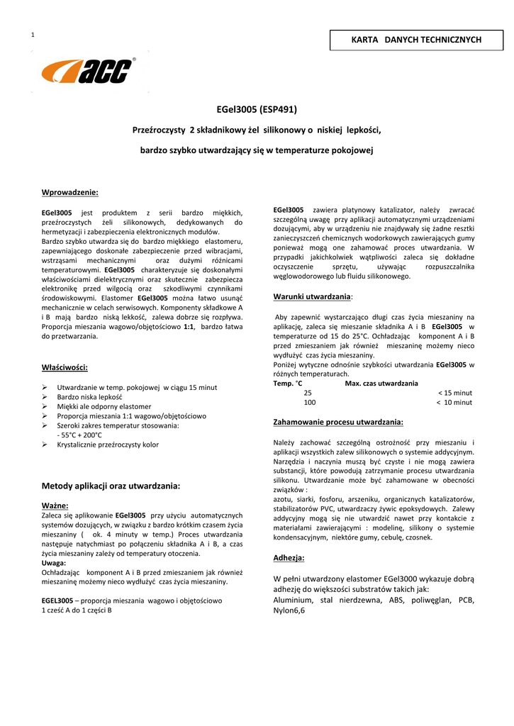 1 KARTA DANYCH TECHNICZNYCH EGel3005 (ESP491) Przeźroczysty 2 składnikowy żel silikonowy o niskiej lepkości, bardzo szybko utwardzający się w temperaturze pokojowej Wprowadzenie: EGel3005 jest produktem z serii bardzo miękkich, przeźroczystych żeli silikonowych, dedykowanych do hermetyzacji i zabezpieczenia elektronicznych modułów. Bardzo szybko utwardza się do bardzo miękkiego elastomeru, zapewniającego doskonałe zabezpieczenie przed wibracjami, wstrząsami mechanicznymi oraz dużymi różnicami temperaturowymi. EGel3005 charakteryzuje się doskonałymi właściwościami dielektrycznymi oraz skutecznie zabezpiecza elektronikę przed wilgocią oraz szkodliwymi czynnikami środowiskowymi. Elastomer EGel3005 można łatwo usunąć mechanicznie w celach serwisowych. Komponenty składkowe A i B mają bardzo niską lekkość, zalewa dobrze się rozpływa. Proporcja mieszania wagowo/objętościowo 1:1, bardzo łatwa do przetwarzania. Właściwości: Utwardzanie w temp. pokojowej w ciągu 15 minut Bardzo niska lepkość Miękki ale odporny elastomer Proporcja mieszania 1:1 wagowo/objętościowo Szeroki zakres temperatur stosowania: - 55°C + 200°C Krystalicznie przeźroczysty kolor Metody aplikacji oraz utwardzania: Ważne: Zaleca się aplikowanie EGel3005 przy użyciu automatycznych systemów dozujących, w związku z bardzo krótkim czasem życia mieszaniny ( ok. 4 minuty w temp.) Proces utwardzania następuje natychmiast po połączeniu składnika A i B, a czas życia mieszaniny zależy od temperatury otoczenia. Uwaga: Ochładzając komponent A i B przed zmieszaniem jak również mieszaninę możemy nieco wydłużyć czas życia mieszaniny. EGEL3005 – proporcja mieszania wagowo i objętościowo 1 cześć A do 1 części B EGel3005 zawiera platynowy katalizator, należy zwracać szczególną uwagę przy aplikacji automatycznymi urządzeniami dozującymi, aby w urządzeniu nie znajdywały się żadne resztki zanieczyszczeń chemicznych wodorkowych zawierających gumy ponieważ mogą one zahamować proces utwardzania. W przypadki jakichkolwiek wątpliwości zaleca się dokładne oczyszczenie sprzętu, używając rozpuszczalnika węglowodorowego lub fluidu silikonowego. Warunki utwardzania: Aby zapewnić wystarczająco długi czas życia mieszaniny na aplikację, zaleca się mieszanie składnika A i B EGel3005 w temperaturze od 15 do 25°C. Ochładzając komponent A i B przed zmieszaniem jak również mieszaninę możemy nieco wydłużyć czas życia mieszaniny. Poniżej wytyczne odnośnie szybkości utwardzania EGel3005 w różnych temperaturach. Temp. °C Max. czas utwardzania 25 < 15 minut 100 < 10 minut Zahamowanie procesu utwardzania: Należy zachować szczególną ostrożność przy mieszaniu i aplikacji wszystkich zalew silikonowych o systemie addycyjnym. Narzędzia i naczynia muszą być czyste i nie mogą zawiera substancji, które powodują zatrzymanie procesu utwardzania silikonu. Utwardzanie może być zahamowane w obecności związków : azotu, siarki, fosforu, arszeniku, organicznych katalizatorów, stabilizatorów PVC, utwardzaczy żywic epoksydowych. Zalewy addycyjny mogą się nie utwardzić nawet przy kontakcie z materiałami zawierającymi : modelinę, silikony o systemie kondensacyjnym, niektóre gumy, cebulę, czosnek. Adhezja: W pełni utwardzony elastomer EGel3000 wykazuje dobrą adhezję do większości substratów takich jak: Aluminium, stal nierdzewna, ABS, poliwęglan, PCB, Nylon6,6 2 Właściwości Metoda testu Wartość Przed utwardzeniem: Kolor - Składnik A Kolor - Składnik B Konsystencja Lepkość - Składnik A( mPas) Brookfield Lepkość - Składnik B( mPas) Brookfield Lepkość po zmieszaniu (mPas) Brookfield Czas życia (25oC, 65% wilgotność względna) Po utwardzeniu: przeźroczysty przeźroczysty ciecz 630 630 630 4 minuty o Po 7 dniach w temp 23 C i 60 +/-5 % wilgotność Kolor Penetracja stożka o Gęstość( 25 C g/ml) ASTM D70 Zakres temp. pracy Współczynnik rozszerzalności cieplnej: Objętościowy Liniowy Niepalność UL94V0 Opakowania standardowe: 2 kg kit - plastikowe kanistry 10 kg kit - plastikowe kanistry 40 kg kit – plastikowe beczki Możliwe jest dostosowanie wielkości opakowań do wymagań klienta. Data ostatniej rewizji: 01-02-2011 przeźroczysty 19,5/6,5mm 0,97 o o -55 C +200 C Dane kontaktowe producent: o 930 ppm/ C o 310 ppm/ C Nie ACC Silicones Ltd. Amber House Shownground Road, Bridgewater, Somerset, UK Tel. +44(0)1278 411400 Fax: +44(001278 411444 ww.acc-silicones.com Parametry elektryczne Rezystancja objętościowa ASTM D-257 Wytrzymałość elektryczna ( napięcie przebicia) ASTM D149 2,0 E+15 Ω.cm >18,5 kV/mm Przechowywanie. Trwałość: Termin przydatności zawsze znajduje się na etykiecie nalepionej na produkcie, i jest nie krótszy niż 12 miesięcy od Dane kontaktowe dystrybutor: Firma Handlowo Usługowa Blelektronik Barbara Ligenza Ul. Chełmońskiego 72c/10 31-340 Kraków, Polska Tel/ Fax: +48 12 394 58 66 Mobile: +48 696 483 020 www.blelektronik.com.pl daty produkcji, fabrycznie zapakowane kontenery w o temp. poniżej 30 C. Muszą być zachowane specjalne środki ostrożności, aby zapobiec dostępowi wilgoci do tych produktów. Pojemniki powinny być szczelnie zamknięte, bez dostępu powietrza. Bezpieczeństwo i higiena. Dane zawarte w oddzielnej Karcie Bezpieczeństwo i Higiena (MSDS). Uwaga do Użytkownika Informacje zawarte w niniejszej karcie są oparte o wiedzę, którą dysponujemy na dzień opracowywania ostatniej wersji karty. Niniejszego dokumentu nie wolno utożsamiać z gwarancją dowolnej specyficznej właściwości produktu. Użytkownik powinien przeprowadzić własne testy aby sprawdzić przydatność produktu do swoich konkretnych warunków. Niniejsza instrukcja użytkowania produktu nie może być rozumiana jako zalecenie do naruszenia jakiegokolwiek patentu. Nie ponosimy odpowiedzialności za naruszenia wynikające z jakiegokolwiek wykorzystania praw patentowych.