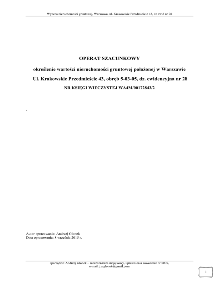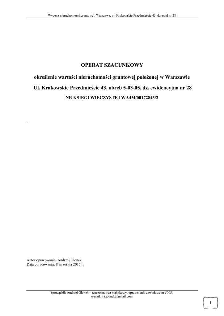 Wycena nieruchomości gruntowej, Warszawa, ul. Krakowskie Przedmieście 43, dz ewid nr 28 OPERAT SZACUNKOWY określenie wartości nieruchomości gruntowej położonej w Warszawie Ul. Krakowskie Przedmieście 43, obręb 5-03-05, dz. ewidencyjna nr 28 NR KSIĘGI WIECZYSTEJ WA4M/00172843/2 . Autor opracowania: Andrzej Glonek Data opracowania: 8 września 2015 r. sporządził: Andrzej Glonek – rzeczoznawca majątkowy, uprawnienia zawodowe nr 5005, e-mail: [email protected] 1 Wycena nieruchomości gruntowej, Warszawa, ul. Krakowskie Przedmieście 43, dz ewid nr 28 WYCIĄG Z OPERATU SZACUNKOWEGO Opis nieruchomości Cel wyceny Metoda wyceny Właściciel praw do nieruchomości Adres: Ul. Krakowskie Przedmieście 43 Dzielnica: Śródmieście Działki/a: nr 28 Obręb: 5-03-05 Powierzchnia nieruchomości: 171 m2 Kw: WA4M/00172843/2 Określenie wartości prawa własności gruntu oddanego w użytkowanie wieczyste w celu aktualizacji opłaty z tytułu użytkowania wieczystego Podejście porównawcze, metoda porównywania parami Właściciel: Miasto Stołeczne Warszawa Użytkownik wieczysty: Osoby fizyczne Wartość rynkowa prawa własności nieruchomości gruntowej 875 942 zł Słownie Osiemset siedemdziesiąt pięć tysięcy dziewięćset czterdzieści dwa złote Wartość rynkowa 1 m2 prawa własności 5 122,47 zł Daty istotne dla operatu Autor operatu szacunkowego Data sporządzenia wyceny: 8 września 2015 r. Data, na którą określono wartość przedmiotu wyceny: 3 września 2015 r. Data, na którą określono i uwzględniono w wycenie stan przedmiotu wyceny: 3 września 2015 r. Data oględzin: 3 września 2015 r. Andrzej Glonek Uprawnienia nr 5005 Pieczęć i podpis rzeczoznawcy majątkowego sporządził: Andrzej Glonek – rzeczoznawca majątkowy, uprawnienia zawodowe nr 5005, e-mail: [email protected] 2 Wycena nieruchomości gruntowej, Warszawa, ul. Krakowskie Przedmieście 43, dz ewid nr 28 SPIS TREŚCI 1. PRZEDMIOT I ZAKRES WYCENY .................................................................................................................................................. 4 1.1. 1.2. PRZEDMIOT I ZAKRES WYCENY ................................................................................................................................................ 4 ZAKRES WYCENY .................................................................................................................................................................... 4 2. CEL WYCENY ................................................................................................................................................................................... 4 3. PODSTAWY OPRACOWANIA OPERATU SZACUNKOWEGO ................................................................................................... 4 3.1. 3.2. 3.3. 3.4. PODSTAWA FORMALNA WYCENY ............................................................................................................................................. 4 PODSTAWY PRAWNE WYCENY ................................................................................................................................................. 4 PODSTAWY METODOLOGICZNE................................................................................................................................................ 4 ŹRÓDŁA DANYCH MERYTORYCZNYCH ..................................................................................................................................... 5 4. DATY ISTOTNE DLA OPERATU SZACUNKOWEGO .................................................................................................................. 5 5. OPIS I OKREŚLENIE STANU NIERUCHOMOŚCI ......................................................................................................................... 5 5.1. 5.2. 5.3. 5.4. STAN PRAWNY ........................................................................................................................................................................ 5 STAN TECHNICZNO-UŻYTKOWY .............................................................................................................................................. 6 STAN OTOCZENIA.................................................................................................................................................................... 7 OTOCZENIE SZCZEGÓŁOWE ..................................................................................................................................................... 8 6. PRZEZNACZENIE NIERUCHOMOŚCI W PLANIE MIEJSCOWYM ............................................................................................ 8 7. OKREŚLENIE SPOSOBU WYCENY ................................................................................................................................................ 9 7.1. 7.2. WSKAZANIE RODZAJU OKREŚLANEJ WARTOŚCI........................................................................................................................ 9 WYBÓR PODEJŚCIA, METODY I TECHNIKI WYCENY ................................................................................................................... 9 8. ANALIZA I CHARAKTERYSTYKA RYNKU NIERUCHOMOŚCI ............................................................................................. 10 8.1. 8.2. SPECYFIKACJA BADANEGO RYNKU LOKALNEGO .................................................................................................................... 10 ANALIZA, CHARAKTERYSTYKA I UWARUNKOWANIA BADANEGO RYNKU ................................................................................ 11 9. OKREŚLENIE CECH RYNKOWYCH DLA WYCENIANEJ NIERUCHOMOŚCI ....................................................................... 13 10. WYZNACZENIE WAG POSZCZEGÓLNYCH CECH I OKREŚLENIE CECH DLA NIERUCHOMOŚCI BĘDĄCEJ PRZEDMIOTEM WYCENY......................................................................