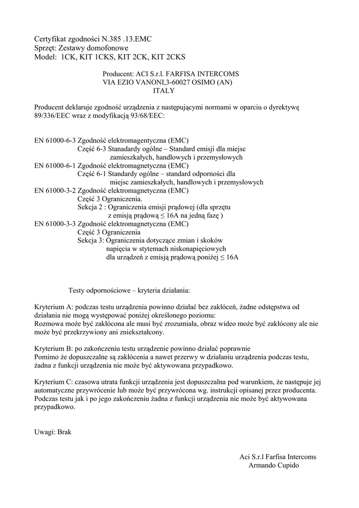 Certyfikat zgodności N.385 .13.EMC Sprzęt: Zestawy domofonowe Model: 1CK, KIT 1CKS, KIT 2CK, KIT 2CKS Producent: ACI S.r.l. FARFISA INTERCOMS VIA EZIO VANONI,3-60027 OSIMO (AN) ITALY Producent deklaruje zgodność urządzenia z następującymi normami w oparciu o dyrektywę 89/336/EEC wraz z modyfikacją 93/68/EEC: EN 61000-6-3 Zgodność elektromagentyczna (EMC) Część 6-3 Stanadardy ogólne – Standard emisji dla miejsc zamieszkałych, handlowych i przemysłowych EN 61000-6-1 Zgodność elektromagnetyczna (EMC) Część 6-1 Standardy ogólne – standard odporności dla miejsc zamieszkałych, handlowych i przemysłowych EN 61000-3-2 Zgodność elektromagnetyczna (EMC) Część 3 Ograniczenia. Sekcja 2 : Ograniczenia emisji prądowej (dla sprzętu z emisją prądową ≤ 16A na jedną fazę ) EN 61000-3-3 Zgodność elektromagnetyczna (EMC) Część 3 Ograniczenia Sekcja 3: Ograniczenia dotyczące zmian i skoków napięcia w stytemach niskonapięciowych dla urządzeń z emisją prądową poniżej ≤ 16A Testy odpornościowe – kryteria działania: Kryterium A: podczas testu urządzenia powinno działać bez zakłóceń, żadne odstępstwa od działania nie mogą występować poniżej określonego poziomu: Rozmowa może być zakłócona ale musi być zrozumiała, obraz wideo może być zakłócony ale nie może być przekrzywiony ani zniekształcony. Kryterium B: po zakończeniu testu urządzenie powinno działać poprawnie Pomimo że dopuszczalne są zakłócenia a nawet przerwy w działaniu urządzenia podczas testu, żadna z funkcji urządzenia nie może być aktywowana przypadkowo. Kryterium C: czasowa utrata funkcji urządzenia jest dopuszczalna pod warunkiem, że następuje jej automatyczne przywrócenie lub może być przywrócona wg. instrukcji opisanej przez producenta. Podczas testu jak i po jego zakończeniu żadna z funkcji urządzenia nie może być aktywowana przypadkowo. Uwagi: Brak Aci S.r.l Farfisa Intercoms Armando Cupido