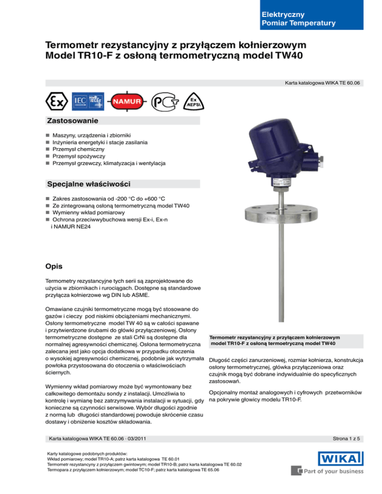 Elektryczny Pomiar Temperatury Termometr rezystancyjny z przyłączem kołnierzowym Model TR10-F z osłoną termometryczną model TW40 Karta katalogowa WIKA TE 60.06 Zastosowanie Maszyny, urządzenia i zbiorniki Inżynieria energetyki i stacje zasilania Przemysł chemiczny Przemysł spożywczy Przemysł grzewczy, klimatyzacja i wentylacja Specjalne właściwości Zakres zastosowania od -200 °C do +600 °C Ze zintegrowaną osłoną termometryczną model TW40 Wymienny wkład pomiarowy Ochrona przeciwwybuchowa wersji Ex-i, Ex-n i NAMUR NE24 Opis Termometry rezystancyjne tych serii są zaprojektowane do użycia w zbiornikach i rurociągach. Dostępne są standardowe przyłącza kołnierzowe wg DIN lub ASME. Omawiane czujniki termometryczne mogą być stosowane do gazów i cieczy pod niskimi obciążeniami mechanicznymi. Osłony termometryczne model TW 40 są w całości spawane i przytwierdzone śrubami do główki przyłączeniowej. Osłony termometryczne dostępne ze stali CrNi są dostępne dla normalnej agresywności chemicznej. Osłona termometryczna zalecana jest jako opcja dodatkowa w przypadku otoczenia o wysokiej agresywności chemicznej, podobnie jak wytrzymała powłoka przystosowana do otoczenia o właściwościach ściernych. Termometr rezystancyjny z przyłączem kołnierzowym model TR10-F z osłoną termoetryczną model TW40 Długość części zanurzeniowej, rozmiar kołnierza, konstrukcja osłony termometrycznej, główka przyłączeniowa oraz czujnik mogą być dobrane indywidualnie do specyficznych zastosowań. Wymienny wkład pomiarowy może być wymontowany bez Opcjonalny montaż analogowych i cyfrowych przetworników całkowitego demontażu sondy z instalacji. Umożliwia to kontrolę i wymianę bez zatrzymywania instalacji w sytuacji, gdy na pokrywie głowicy modelu TR10-F. konieczne są czynności serwisowe. Wybór długości zgodnie z normą lub długości standardowej powoduje skrócenie czasu dostawy i obniżenie kosztów składowania. Karta katalogowa WIKA TE 60.06 · 03/2011 Karty katalogowe podobnych produktów: Wkład pomiarowy; model TR10-A; patrz karta katalogowa TE 60.01 Termometr rezystancyny z przyłączem gwintowym; model TR10-B; patrz karta katalogowa TE 60.02 Termopara z przyłączem kołnierzowym; model TC10-F; patrz karta katalogowa TE 65.06 Strona 1 z 5 Sensor Wkład pomiarowy Sensor znajduję się w wymiennym wkładzie pomiarowym który jest utrzymywany przez sprężynę. Wkład pomiarowy jest odporny na wibrację, wykonany w technologi MI. Średnica wkładu pomiarowego powinna być mniejsza o ok. 1 mm niż wewnętrzna średnica osłony termometrycznej. Przestrzeń większa niż 0,5 mm pomiędzy osłoną termometrczną a wkładem pomiarowym wprowadza negatywny efekt przepływu ciepła, a tym samym wydłuża czas odpowiedzi. Sposób przyłączenie sensora 2 - przewodowy: błąd w rezystancji przewodu 3 - przewodowy: w przypadku kabli o długości ok. 30 m lub więcej mogą wystąpić błędy pomiaru 4 - przewodowy: wewnętrzna rezystancja kabla podłączonych przwodów jest nieistotna Ważne jest, aby przy montażu osłony termometrycznej ustalić odowiedną długość części zanurzalnej (= grubość dna długość osłony termometrcznej ≤ 5,5 mm). Należy pamiętać, że wewnątrz czujnika znajduję się sprężyna (ruch sprężyny max. 10 mm), która umożliwia szczelne dociśnięcie czujnika do osłony termometrycznej. Błąd graniczny sensora wg DIN EN 60 751 Klasa B Klasa A Klasa AA Kombinacja 2 - przewodowa jest nie możłiwa w klasie A i klasie AA ponieważ rezystancja przewodu czujnika mieści się poza skalą dokładności sensora. Standardowym materiałem na osłonę wkładu pomiarowego jest stal CrNi. Inne materiały dostęne są na zapytanie. Szczegółowa specyfikacja sensora Pt100, patrz informacja techniczna IN 00.17 na stronie internetowej. Standarowa długość wkładu pomiarowego Ø wkładu pomiarowego w mm 3 6 8 Standardowa długość wkładu pomiarowego w mm 275 275 275 315 315 315 345 345 375 375 375 405 405 435 435 435 525 525 555 555 585 585 655 655 735 735 W tableli podane są standardowe długości wkładów pomiarowych. Inne długości też są możliwe. Możliwe kombinacje z średnicą wkładu pomiarowego, liczbą sensorów i sposobem połączenia sensorów Ø wkładu pomiarowego Sensor / sposób połączenia 1 x Pt100 Sensor / sposób połączenia 2 x Pt100 3 6 8 x x x x x x w mm 2 przewodowy 3 przewodowy 4 przewodowy 2 przewodowy 3 przewodowy 4 przewodowy x x x x x x x x x x x Legenda: 3176488.03 Elementy modelu TR10-F Główka przyłączeniowa Osłona termometryczna TW40 Przyłącze procesowe (kołnierz) Wkład pomiarowy Przetwornik (opcjonalnie) Szyjka przedłużeniowa NL Długość nominalna l5 Długość wkładu pomiarowego U1 Długość zanurzeniowa F1 Ø osłony termometrycznej MH Długość szyjki M Długość szyjki z gwintem Strona 2 z 5 Karta katalogowa WIKA TE 60.06 · 03/2011 Główki przyłączeniowe BS BSZ Typ Materiał BSZ-H BSZ-HK BSS BSS-H BSK BSK-H BVS Wejście kabla Stopień ochrony Pokrywa Wykończenie powierzchni 1) BS aluminium M 20 x 1,5 IP65 pokrywa z dwoma wkrętami niebieskie, malowane2) 1) BSZ aluminium M 20 x 1,5 IP65 pokrywa uchylna ze śrubą niebieskie, malowane2) 1) BSZ-H aluminium M 20 x 1,5 IP65 pokrywa uchylna ze śrubą niebieskie, malowane 2) 1) BSZ-HK plastik M 20 x 1,5 IP65 pokrywa uchylna ze śrubączarne BSS aluminium M 20 x 1,51) IP65 pokrywa uchylna z zatrzaskiem niebieskie, malowane2) 1) BSS-H aluminium M 20 x 1,5 IP65 pokrywa uchylna z zatrzaskiem niebieskie, malowane2) 1) BSK plastki M 20 x 1,5 IP54 pokrywa przykręcana czarne BSK-H plastik M 20 x 1,51) IP54 pokrywa przykręcana czarne BVS stal CrNi M 20 x 1,51) IP65 pokrywa przykręcana naturalne, elektropolerowana Główka przyłączeniowa z cyfrowym wyświetlaczem (opcjonalnie) Termometr ten może być opcjonalnie stosowany z cyfrowym wyświetlaczem DIH 10. Zastosowana główka przyłączeniowa jest podobna do główki 