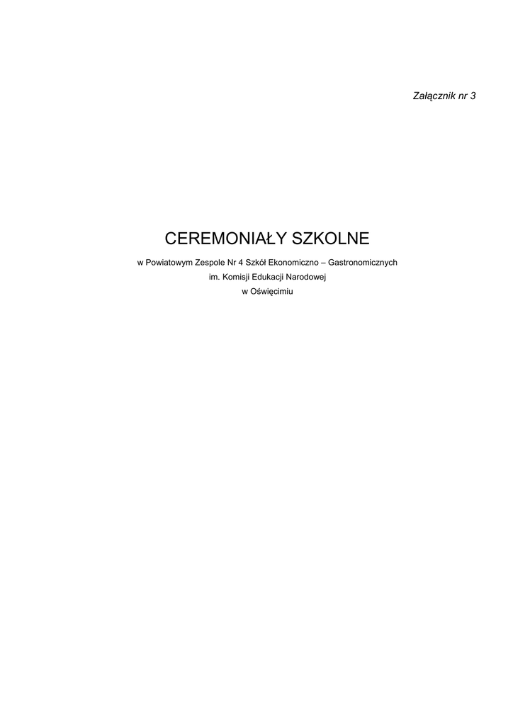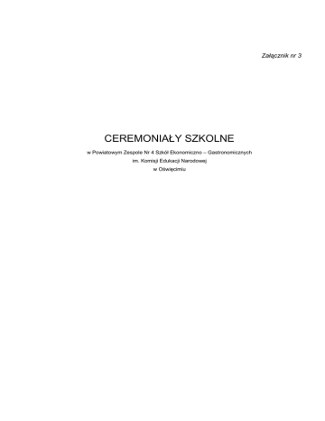 Załącznik nr 3 CEREMONIAŁY SZKOLNE w Powiatowym Zespole Nr 4 Szkół Ekonomiczno – Gastronomicznych im. Komisji Edukacji Narodowej w Oświęcimiu Ceremoniały Szkolne 1. UROCZYSTOŚCI, SYMBOLE I TRADYCJE SZKOLNE 1.1. Do najwaŜniejszych uroczystości tworzących ceremoniał szkolny są zaliczane: a) rozpoczęcie i zakończenie roku szkolnego, b) uroczystości szkolne odbywające się z udziałem sztandaru Szkoły: • przyjęcie w poczet społeczności uczniowskiej uczniów klas pierwszych, • poŜegnanie nauczycieli – emerytów, • wręczenie stypendiów Prezesa Rady Ministrów, • uroczystości związane z Patronem Szkoły – Komisją Edukacji Narodowej, • poŜegnanie uczniów ostatnich klas, • uhonorowanie najlepszego absolwenta Szkoły wpisaniem do Złotej Księgi, c) uroczystości nawiązujące do rocznic waŜnych wydarzeń historycznych: • 11 Listopada (święto narodowe), • 27 Stycznia (rocznica wyzwolenia Oświęcimia), • 2 Maja (święto flagi), • 3 Maja (święto narodowe). 1.2. Do najwaŜniejszych symboli szkolnych naleŜą: a) sztandar Szkoły, b) logo Szkoły. 1.3. Sztandar Szkoły stanowi prostokątny płat tkaniny obszyty złotymi frędzlami. Po prawej stronie na tle barw narodowych, umieszczone jest godło państwowe, na lewej stronie, na białym tle znajduje się napis z nazwą Szkoły oraz herb miasta Oświęcim. 1.4. Logo Szkoły jest znakiem rozpoznawczym placówki. Stanowi go rycina budynku szkolnego. NaleŜy je eksponować podczas uroczystości, na dyplomach, oficjalnych pismach urzędowych Szkoły, znaczkach, identyfikatorach. 1.5. Do tradycji Szkoły naleŜą: a) Wigilie klasowe, b) wyjazd do Sanktuarium Maryjnego w Częstochowie klas programowo najwyŜszych, c) „Dzień Wiosny” – turniej „La-La”, d) „Dzień Otwarty Szkoły”. 2. POCZET SZTANDAROWY W SZKOLE 2.1. Sztandarem Szkoły opiekuje się poczet sztandarowy, składający się z chorąŜego i asysty (łącznie trzy osoby), wybrany spośród uczniów zaproponowanych przez Samorząd Uczniowski. Obok zasadniczego składu powinien zostać wybrany skład rezerwowy. 2 Ceremoniały Szkolne 2.2. Poczet ze sztandarem uczestniczy w najwaŜniejszych uroczystościach szkolnych, a takŜe pozaszkolnych – na zaproszenie innych placówek i instytucji. 2.3. ChorąŜy i asysta powinni być ubrani odświętnie: a) uczeń – ciemny garnitur, biała koszula i krawat, b) uczennice – białe bluzki i ciemne spódnice. 2.4. Insygnia pocztu sztandarowego: a) biało – czerwone szarfy przewieszone przez prawe ramię, zwrócone kolorem białym w stronę kołnierza, spięte na lewym biodrze, b) białe rękawiczki. 2.5. Sztandar oraz insygnia pocztu sztandarowego przechowywane są w gabinecie Dyrektora Szkoły. Całością spraw organizacyjnych pocztu sztandarowego zajmuje się opiekun pocztu wyznaczony przez Dyrektora spośród nauczycieli Szkoły. 3. ZACHOWANIE UCZNIÓW SZKOŁY W TRAKCIE OFICJALNYCH UROCZYSTOŚCI 3.1. Wejście Dyrektora Szkoły na początku uroczystości do sali, gdzie zgromadzona jest młodzieŜ, powinno być zapowiedziane przez prowadzącego: „Szanowni zebrani: Dyrektor Powiatowego Zespołu Nr 4 Szkół Ekonomiczno – Gastronomicznych, Pan/Pani (nazwisko i imię)”, powinno to spowodować przyjęcie przez młodzieŜ postawy zasadniczej. 3.2. Osoba prowadząca uroczystość podaje komendy: „Baczność”, „Sztandar Szkoły wprowadzić”, uczniowie bez nakryć głowy zachowują postawę zasadniczą. 3.3. Poczet sztandarowy wchodzi na miejsce uroczystości. Jeśli droga przemarszu jest wąska, poczet moŜe iść „gęsiego”, przy czym osoba trzymająca sztandar idzie w środku. W trakcie przemarszu wszyscy stoją, a sztandar naleŜy pochylić pod kątem 45° do przodu. Poczet zajmuje miejsce po lewej lub prawej stronie sali, przodem do zgromadzonych i podnosi sztandar do pionu. 3.4. Po wprowadzeniu sztandaru prowadzący podaje kolejną komendę: „Do hymnu państwowego”, po której odśpiewany lub odtworzony zostaje hymn państwowy. Zgodnie z obowiązującym prawem jest to Mazurek Dąbrowskiego. W trakcie hymnu sztandar jest pochylony pod katem 45°. Po odśpiewaniu (wysłuchaniu) hymnu prowadzący podaje następną komendę: „Po hymnie”, po której uczestnicy uroczystości przyjmują postawę swobodną. 3.5. Na zakończenie oficjalnej części uroczystości prowadzący podaje komendę: „Sztandar Szkoły wyprowadzić”, zachowanie młodzieŜy i czynności pocztu są analogiczne do sytuacji wprowadzania pocztu do sali. 3 Ceremoniały Szkolne 4. SPOSÓB ZACHOWANIA POCZTU SZTANDAROWEGO 4.1. Sztandarem wykonuje się następujące chwyty: a) „Na ramię” – wykonując chwyt „Na ramię”, chorąŜy prawą ręką (pomagając sobie lewą) kładzie drzewce na prawe ramię i trzyma je pod kątem 45° (w stosunku do ramienia), b) „Prezentuj” – wykonując chwyt „Prezentuj” z połoŜenia „Do nogi”, chorąŜy podnosi sztandar prawą ręką pionowo do góry wzdłuŜ prawego ramienia, następnie lewą ręka chwyta drzewce sztandaru tuŜ pod prawą i opuszcza prawą rękę na całej długości, obejmując dolną cześć drzewca, asysta sztandaru w postawie zasadniczej, c) „Do nogi” – wykonując chwyt „Do nogi’ z połoŜenia „Prezentuj” lub z połoŜenia „Na ramię”, chorąŜy przenosi sztandar prawą ręką (pomagając sobie lewą) do nogi, chwyt „Do nogi” wykonuje się na komendę: „Baczność”, d) salutowanie sztandarem – wykonuje się z postawy „Prezentuj”; chorąŜy robi zwrot w prawo skos z równoczesnym wysunięciem lewej nogi do przodu na odległość jednej stopy i pochyla sztandar w przód do 45°, po czasie „salutowania” przenosi sztandar do postawy „Prezentuj”. Sztandar naleŜy równieŜ pochylić podczas wciągania flagi państwowej na maszt oraz w przypadku ogłoszenia minuty ciszy dla uczczenia czyjejś pamięci. 4.2. W przypadku, gdy poczet sztandarowy uczestniczy w uroczystościach pogrzebowych lub w