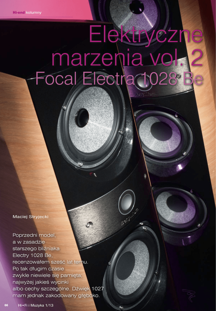 Hi-end kolumny Elektryczne marzenia vol. 2 Focal Electra 1028 Be Poprzedni model, a w zasadzie Electry 1028 Be, 66 Hi-end kolumny zadko się zdarza sprzęt na tyle dobry, aby mieć o nim jednoznacznie dobre zdanie. Nie to jest jednak najistotniejsze. Bardziej powszechna od wad jest nijakość. To ona powoduje, że niby wszystko jest OK, ale nie możemy się do końca przekonać, że dane kolumny można z czystym sumieniem polecić każdemu. Tymczasem Electry 1027 nie pozostawiły niedosytu i gdybym miał na nich grać na co dzień, czułbym się komfortowo. Propozycję opisania modelu 1028 Be przyjąłem z ciekawością, bo – jak pokazuje praktyka – nowe serie niekoniecznie dorównują starszym. Zdarza się, że „innowacyjne” rozwiązania psują sprawdzoną konstrukcję. Dlatego kiedy rozpakowałem pudełka, autentycznie się ucieszyłem, bo… … nowe kolumny prawie się nie różnią od Electry 1027. Nawet producent jest wyjątkowo oszczędny w opisach modyfikacji, a przecież nie należy do kniętą, ale tam głośnik dmuchał przez otwór w podłogę. W 1028 Be jest tak samo, a dodatkowy tunel ma charakter dopalacza, który poszerza pasmo przenoszenia z 30 do 28 Hz. Dla zainteresowanych, żaden instrument akustyczny nie sięga tak nisko; chyba tylko organy w 64-stopowych registrach. To rozciągnięcie dołu ma więc bardziej charakter zabarwienia, które doda tunel, niż wartość odczuwalną w praktyce. Kolejna różnica to zwiększenie średnicy berylowej kopułki z 25 do 27 mm. Jestem fanem berylowego tweetera Focala i uważam go za bardziej udany od diamentowych kopułek B&W. Być może to kwestia aplikacji, ale kiedy słyszę beryl, wiem, że czeka mnie góra o przejrzystości bliskiej tej ze słuchawek elektrostatycznych. Wprawdzie wrażenie czytelności może być podobne jak np. w Jecie Elaca, ale Focal daje przy tym poczucie niesłychanej kultury. Nie dziwię się, że w pewnym momencie ktoś powiedział „stop” i Francuzi przestali sprzedawać swoje przetworniki konkurencji. A nuż Ich skromne średnice w praktyce okazują się wystarczające. Zwrotnica składa się aż z 20 elementów. Focal, podobnie jak Audio Physic, nie uznaje bi-wiringu. Do dyspozycji jest para gniazd, za to najwyższej jakości. Pomimo zaawansowanych technologicznie przetworników największą część kosztów generuje obudowa. Francuzi są znani ze skąpstwa, więc nawet w kolumnach za 10000 zł można się natknąć na sztuczne okleiny. Tym razem niczego nie żałowali. Skrzynie są ciężkie i sklejone z grubego MDF-u. Nieregularny, zwężający się do tyłu kształt pomaga eliminować fale stojące, a zaokrąglone fronty niwelują ich załamania na krawędziach, tutaj nieobecnych. Głośniki basowe tkwią w wyżłobionych otworach dość głęboko, podobnie jak średniotonowy. Można je nakryć miniaturowymi maskownicami, które nie zaburzają eleganckiej obłej linii. firm, które swoje rozwiązania trzymają w tajemnicy. Kiedy Focal opracuje nowy przetwornik albo choćby wstawi beleczkę usztywniającą skrzynię, trąbi o tym jak o lądowaniu na Księżycu. Z kształtu rury bas-refleksu czy fałdki na membranie kocha zrobić Nowy Genialny System Poprawy Dźwięku (w skrócie NGSPD). A tu proszę – nowa Electra pojawia się cichutko i skromnie, jak na damę z wyższych sfer przystało. Przed oględzinami 1028 Be uważnie obejrzałem zdjęcia 1027. Potem długo szukałem szczegółów różniących oba modele i znalazłem tylko szeroki port bas-refleksu wyprowadzony z tyłu. Byłaby to duża zmiana, gdyby poprzednika zaprojektowano jako konstrukcję zam- ktoś zrobi na ich głośnikach coś lepszego… To możliwe, natomiast to, że ktoś zrobi lepszy reproduktor, wymaga wielkich nakładów finansowych, na które niewielkich wytwórni nie stać. Dlatego Focal może sobie zostać z wybitnymi (a przynajmniej jedynymi w swoim rodzaju) wysokimi tonami jako znakiem firmowym. Reszta przetworników to już bardziej „zwyczajne” konstrukcje, choć nie należy zapominać, że do serii Electra trafiły w 1999 roku prosto z Utopii. Ich membrany mają strukturę kanapkową i składają się z warstw pianki, przedzielanej plecionką z włókna szklanego. Zarówno średniotonowy, jak i basowe mają średnicę 16,5 cm, a stożki wycina się laserem. Kopułka jest wysunięta do przodu (to raczej rzadko spotykane rozwiązanie) i przytwierdzona do ozdobnej blachy (kolor sugeruje, że to tytan). Dostępne są cztery wersje kolorystyczne. Naturalne forniry znajdują się jednak tylko po bokach, bo zarówno front, jak i górną ściankę pomalowano na wysoki połysk lakierem fortepianowym. Jakość wykończenia jest dokładnie taka, jakiej możemy oczekiwać, płacąc 28 kzł – luksusowa. Kolumny są okazałe i – co tu dużo mówić – piękne. A więc, podobnie jak starsze Electry 1027, mogą stanowić ozdobę gościnnego salonu niejednego krawaciarza, już po dorobku. Nawet nawiedzony „architekt wnętrz” nie powinien narzekać, o ile oczywiście Konstrukcja 67 Hi-end kolumny nie dojdzie do wniosku, że lepiej je wsadzić w dziury w ścianach, wydłubane na miarę. Tak, żeby tylko fronty wystawały. Z takim pomysłem „cenionego fachowca” spotkałem się całkiem niedawno. Elektry, podobnie jak 99 % kolumn wolnostojących, nie są sprzętem do zabudowy i powinny mieć wokół siebie sporo wolnego miejsca. Nie będzie to trudne, ponieważ przeznaczono je do sporych pokojów, rzędu 30 m2 i trochę więcej. U mnie pracowały w 24 metrach i nie zauważyłem problemów z basem ani przestrzenią. Czuło się jednak, że dodatkowe kilka metrów dałoby dźwiękowi jeszcze większą swobodę. Kolumny były chyba w ogóle świeże, bo z początku nie zachwycały. Z każdym dniem grały jednak zauważalnie lepiej, a po trzech tygodniach brzmienie zmieniło się dramatycznie. Oznacza to, że przetworniki potrzebują sporo czasu na wygrzanie. Wysoka skuteczność zapewnia za to łatwość doboru