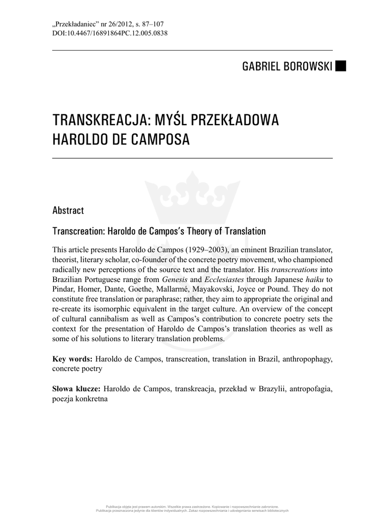 „Przekładaniec” nr 26/2012, s. 87–107 DOI:10.4467/16891864PC.12.005.0838 GABRIEL BOROWSKI TRANSKREACJA: MYŚL PRZEKŁADOWA HAROLDO DE CAMPOSA Abstract Transcreation: Haroldo de Campos’s Theory of Translation This article presents Haroldo de Campos (1929–2003), an eminent Brazilian translator, theorist, literary scholar, co-founder of the concrete poetry movement, who championed radically new perceptions of the source text and the translator. His transcreations into Brazilian Portuguese range from Genesis and Ecclesiastes through Japanese haiku to Pindar, Homer, Dante, Goethe, Mallarmé, Mayakovski, Joyce or Pound. They do not constitute free translation or paraphrase; rather, they aim to appropriate the original and re-create its isomorphic equivalent in the target culture. An overview of the concept of cultural cannibalism as well as Campos’s contribution to concrete poetry sets the context for the presentation of Haroldo de Campos’s translation theories as well as some of his solutions to literary translation problems. Key words: Haroldo de Campos, transcreation, translation in Brazil, anthropophagy, concrete poetry Słowa klucze: Haroldo de Campos, transkreacja, przekład w Brazylii, antropofagia, poezja konkretna Publikacja objęta jest prawem autorskim. Wszelkie prawa zastrzeżone. Kopiowanie i rozpowszechnianie zabronione. Publikacja przeznaczona jedynie dla klientów indywidualnych. Zakaz rozpowszechniania i udostępniania serwisach bibliotecznych ■ 88 GABRIEL BOROWSKI Zarówno Ameryka Łacińska jak i przekład [są] wynikami kulturowych przemieszczeń prowadzących do spotkania z tekstową obcością. Else Ribeiro Pires Vieira (1996: 63) Ludożerstwo. Pochłonięcie świętego wroga. Żeby stał się totemem. Oswald de Andrade (1928: 7)1 Jedną z istotnych przemian w refleksji przekładoznawczej ostatnich dekad jest podkreślenie roli tłumaczy w kształtowaniu obrazu kultury obcej w przestrzeni języka docelowego, jak również w formowaniu tej przestrzeni poprzez działalność krytyczną2. Dochodzi więc do przesunięcia akcentu „z tekstów na ludzi”, jak to ujmuje Magda Heydel (2009: 23), co skłania nie tylko do dyskusji nad konkretnymi rozwiązaniami tłumaczeniowymi dostrzegalnymi w pracy mistrzów, lecz również do decentralizacji badań nad przekładem, skupionych w środowisku europocentrycznym. Obserwuje się więc proces stopniowego otwarcia dyscypliny na propozycje teoretyczne niesprowadzalne do zachodniego paradygmatu nauki, czemu towarzyszy sukcesywne włączanie metadyskursów zakorzenionych w kulturach dotychczas uznawanych za zależne od europejskich centrów wiedzy. Istotnym elementem tego zjawiska jest więc nie tylko „tłumaczenie tłumaczy” w świetle konkretnych uwarunkowań ich działalności, lecz również „przekład przekładoznawstwa” zakotwiczonego w językach i kulturach o słabszej obecności w przestrzeni lokalnej humanistyki. Szkic ma charakter przyczynkowy3; jego celem jest nakreślenie sylwetki Haroldo de Camposa (1929–2003), wybitnego brazylijskiego tłumacza, teoretyka literatury i przekładu, współzałożyciela poetyckiej szkoły konkretystów oraz wielkiego rzecznika konieczności ponownej refleksji nad sposobem istnienia tekstu tłumaczonego i postacią tłumacza. Postrze1 O ile nie zaznaczono inaczej, wszystkie przekłady zamieszczone w artykule są autorstwa G.B. 2 Przykładem niech będzie wydany niedawno tom Agents of Translation pod red. Johna Miltona i Paula Bandii (2009), na który składa się kilkanaście esejów poświęconych postaciom tłumaczy jako jednostkom aktywnie wpływającym na własną kulturę poprzez przekład, w tym cytowane w dalszej części studium o Haroldo de Camposie. 3 Ze względu na kontekst i rozmiary tej publikacji oraz domniemany brak wcześniejszych opracowań na temat twórczości Haroldo de Camposa w języku polskim, ognisko zainteresowania stanowić będzie jedynie jego działalność przekładowa (w szczególności: zasadnicza koncepcja „transkreacji”), poprzedzona zwięzłym ukazaniem dwóch istotnych dla niej kontekstów, mocno osadzonych w kulturze brazylijskiej, tj. kanibalizmu kulturowego oraz poezji konkretnej. Publikacja objęta jest prawem autorskim. Wszelkie prawa zastrzeżone. Kopiowanie i rozpowszechnianie zabronione. Publikacja przeznaczona jedynie dla klientów indywidualnych. Zakaz rozpowszechniania i udostępniania serwisach bibliotecznych