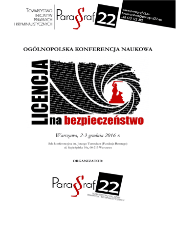 OGÓLNOPOLSKA KONFERENCJA NAUKOWA Warszawa, 2-3 grudnia 2016 r. Sala konferencyjna im. Jerzego Turowicza (Fundacja Batorego) ul. Sapieżyńska 10a, 00-215 Warszawa ORGANIZATOR: PROJEKT WSPÓŁFINANSOWANY PRZEZ: Pierwszy dzień konferencji jest częścią projektu „Paragraf bliżej ludzi: kierunek bezpieczeństwo” współfinansowanego z Funduszu Inicjatyw Obywatelskich w ramach programu „Aktywne obywatelstwo”, organizowanego przez Ministerstwo Rodziny, Pracy i Polityki Społecznej. PATRONAT HONOROWY: MARSZAŁEK WOJEWÓDZTWA MAZOWIECKIEGO PATRONAT: PATRONAT MEDIALNY: LICENCJA NA BEZPIECZEŃSTWO Towarzystwo Inicjatyw Prawnych i Kryminalistycznych Paragraf 22 ma zaszczyt zaprosić na Ogólnopolską Konferencję Naukową „Licencja na bezpieczeństwo”, która odbędzie się w dniach 2-3 grudnia 2016 r. w Warszawie, w sali im. Jerzego Turowicza w siedzibie Fundacji Batorego przy ul. Sapieżyńskiej 10a. Udział w wydarzeniu (zarówno czynny, jak i bierny) jest bezpłatny, po uprzedniej rejestracji. Wydarzenie zostanie podzielone na dwie części: ekspercką i studencko-doktorancką. Ich wspólnym mianownikiem będzie problematyka szeroko rozumianego bezpieczeństwa osób w życiu codziennym. Świadomie pomijając zagadnienia zwalczania zagrożeń na szczeblu państwowym i globalnym, organizatorzy skupiają się na przedstawieniu tematu w ujęciu zawodowym, rodzinnym i osobistym. Prelegenci poruszą m. in. tematykę przestępczości wymierzonej w określone grupy wiekowe lub zbiorowości społeczne, zagrożeń związanych z korzystaniem z Internetu czy bezpieczeństwa konsumentów. Omówiona zostanie profilaktyka i przeciwdziałanie powstawaniu zagrożeń, a także sposoby minimalizowania ich ewentualnych skutków. Podział Konferencji na dwie części pozwoli omówić kluczowe zagadnienia z odmiennych perspektyw. Panele pierwszego dnia prowadzone będą przez ekspertów zajmujących się badaniem istniejących problemów w sferze bezpieczeństwa oraz przygotowywaniem nowoczesnych rozwiązań służących ich pokonywaniu. Będzie to doskonała okazja do przedstawienia konkretnych narzędzi stosowanych przez poszczególne instytucje na poziomie lokalnym i ogólnopolskim oraz do podzielenia się rezultatami ich funkcjonowania czy też planami zmian. Zwieńczeniem tego dnia będzie podsumowanie realizowanego przez Organizatora projektu Paragraf bliżej ludzi: kierunek bezpieczeństwo, który polega na stworzeniu kompleksowej platformy wymiany informacji na rzecz poprawy bezpieczeństwa osobistego poprzez świadczenie poradnictwa prawnego, działania edukacyjne, informacyjne i szkoleniowe. Druga część będzie miała z kolei charakter studencko-doktorancki. Osoby zajmujące się naukowo lub zawodowo zagadnieniami z pogranicza prawa i bezpieczeństwa będą miały okazję wygłosić referaty i zabrać głos w sprawie poszczególnych aspektów bezpieczeństwa członków społeczności. Organizatorom zależy na tym, by prelekcje te miały charakter case study i nastawione były przede wszystkim na omówienie realnych problemów i zaprezentowanie ich możliwych rozwiązań. Konferencja będzie więc miała praktyczno-naukowy charakter, co pozwoli nie tylko na omówienie aktualnego stanu bezpieczeństwa w kraju, ale również na wypracowanie skuteczniejszych rozwiązań, korespondujących z realnymi potrzebami. Możliwość zaprezentowania i skonfrontowania różnorodnych doświadczeń i punktów widzenia stanowi jeden z głównych atutów przedsięwzięcia. Wierzymy, że wydarzenie będzie doskonałą okazją do wymiany poglądów przedstawicieli różnych środowisk, m. in. służb mundurowych, zawodów prawniczych czy nauk humanistycznych. Osoby zainteresowane biernym uczestnictwem w konferencji zapraszamy do rejestrowania się za pośrednictwem formularza dostępnego na stronie internetowej Organizatora (http://paragraf22.eu) oraz tutaj https://goo.gl/forms/7RpeNQ2q9O162FYw2 RAMOWY PROGRAM KONFERENCJI: 2 GRUDNIA 2016 R. - DZIEŃ EKSPERCKI 8:00 Rejestracja uczestników konferencji 9:00 Otwarcie pierwszego dnia konferencji i rozpoczęcie obrad 9:00 - 11:30 PANEL I. Analiza współczesnych zagrożeń dla bezpieczeństwa osobistego Wystąpienia zaproszonych ekspertów: dr Paweł Ostaszewski Instytut Wymiaru Sprawiedliwości Jak mierzyć lęk przed przestępczością? Bartłomiej Zieliński I Zastępca Komendanta Straży Miejskiej m. st. Warszawy Bieżące trendy w przestępczości pospolitej dr Dagmara Woźniakowska-Fajst Instytut Profilaktyki Społecznej i Resocjalizacji Uniwersytetu Warszawskiego Cudzoziemcy jako sprawcy poważnych przestępstw 11:30 - 12:00 Przerwa 12:00 - 14:30 PANEL II. Innowacyjne narzędzia w służbie ochrony bezpieczeństwa Wystąpienia zaproszonych ekspertów: Dr Kacper Gradoń Katedra Kryminalistyki Wydziału Prawa i Administracji Uniwersytetu Warszawskiego Biały wywiad i analiza informacji dostępnych w sieci Internet Dr hab. Paweł Waszkiewicz Katedra Kryminalistyki Wydziału Prawa i Administracji Uniwersytetu Warszawskiego Projektowanie przestrzeni miejskiej i hot spot policing Asp. Krzysztof Biskup Centralne Laboratorium Kryminalistyczne Policji Współczesne zabezpieczenia pojazdów i mieszkań 14:30 - 15:00 Przerwa obiadowa 15:00 - 16:00 PANEL III. Prezentacja efektów projektu Paragraf bliżej ludzi: kierunek bezpieczeństwo i podsumowanie dotychczasowych działań 16:00 - 16:15 Podsumowanie obrad i zamknięcie pierwszego dnia konferencji 3 GRUDNIA 2016 R. - DZIEŃ STUDENCKO-DOKTORANCKI 8:00 Rejestracja uczestników konferencji 9:00 Otwarcie drugiego dnia konferencji i rozpoczęcie obrad 9:00 - 10:45 PANEL I. Bezpieczeństwo w praktyce mgr Daniel Chmur Uniwersytet w Białymstoku Dostęp do broni palnej w sektorze cywilnym – zagrożeniem czy gwarancją bezpieczeństwa jednostki? mgr Konrad Wnorowski Uniwersytet w Białymstoku Bezpieczeństwo czasu czy czas bezpieczeństwa? Liczniki czasu na skrzyżowaniach w ujęciu prawnym i praktycznym Gracjan Miernick