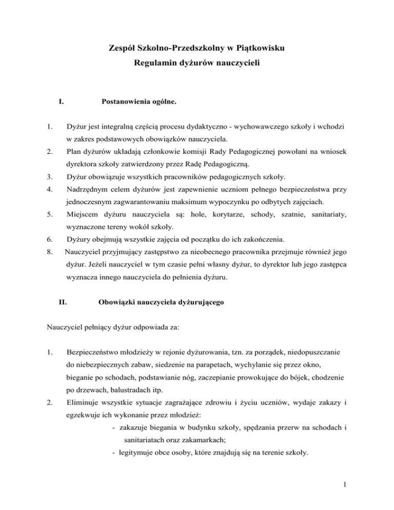Zespół Szkolno-Przedszkolny w Piątkowisku Regulamin dyżurów nauczycieli Postanowienia ogólne. I. 1. Dyżur jest integralną częścią procesu dydaktyczno - wychowawczego szkoły i wchodzi w zakres podstawowych obowiązków nauczyciela. 2. Plan dyżurów układają członkowie komisji Rady Pedagogicznej powołani na wniosek dyrektora szkoły zatwierdzony przez Radę Pedagogiczną. 3. Dyżur obowiązuje wszystkich pracowników pedagogicznych szkoły. 4. Nadrzędnym celem dyżurów jest zapewnienie uczniom pełnego bezpieczeństwa przy jednoczesnym zagwarantowaniu maksimum wypoczynku po odbytych zajęciach. 5. Miejscem dyżuru nauczyciela są: hole, korytarze, schody, szatnie, sanitariaty, wyznaczone tereny wokół szkoły. 6. Dyżury obejmują wszystkie zajęcia od początku do ich zakończenia. 8. Nauczyciel przyjmujący zastępstwo za nieobecnego pracownika przejmuje również jego dyżur. Jeżeli nauczyciel w tym czasie pełni własny dyżur, to dyrektor lub jego zastępca wyznacza innego nauczyciela do pełnienia dyżuru. II. Obowiązki nauczyciela dyżurującego Nauczyciel pełniący dyżur odpowiada za: 1. Bezpieczeństwo młodzieży w rejonie dyżurowania, tzn. za porządek, niedopuszczanie do niebezpiecznych zabaw, siedzenie na parapetach, wychylanie się przez okno, bieganie po schodach, podstawianie nóg, zaczepianie prowokujące do bójek, chodzenie po drzewach, balustradach itp. 2. Eliminuje wszystkie sytuacje zagrażające zdrowiu i życiu uczniów, wydaje zakazy i egzekwuje ich wykonanie przez młodzież: - zakazuje biegania w budynku szkoły, spędzania przerw na schodach i sanitariatach oraz zakamarkach; - legitymuje obce osoby, które znajdują się na terenie szkoły. 1 3. Nauczyciel dyżurujący jest cały czas czynny, nie zajmuje się sprawami postronnymi, jak: przeprowadzanie rozmów z rodzicami, nauczycielami dyżurującymi oraz innymi osobami i czynnościami, które przeszkadzają w rzetelnym pełnieniu dyżurów. 4. Nauczyciel nie może pod żadnym pozorem zejść z dyżuru bez ustalenia zastępstwa i poinformowania o tym fakcie dyrektora. 5. Nauczyciel ma obowiązek jednocześnie z dzwonkiem znaleźć się na swoim stanowisku ,po odłożeniu dziennika lekcyjnego w pokoju nauczycielskim,i opuścić je po dzwonku na lekcję, sprawdzając stan rejonu, w którym dyżurował (porządek itp.). 6. Obowiązkowo i natychmiast zgłasza dyrektorowi szkoły zauważone zagrożenie, którego nie jest w stanie sam usunąć. 7. Przed rozpoczęciem zajęć jest zobowiązany do sprawdzenia swojego miejsca pracy pod względem bhp. 8. Każdy nauczyciel zgłasza natychmiast dyrekcji szkoły fakt zaistnienia wypadku i podejmuje działania zmierzające do udzielenia pierwszej pomocy i zapewnienia dalszej opieki. 2