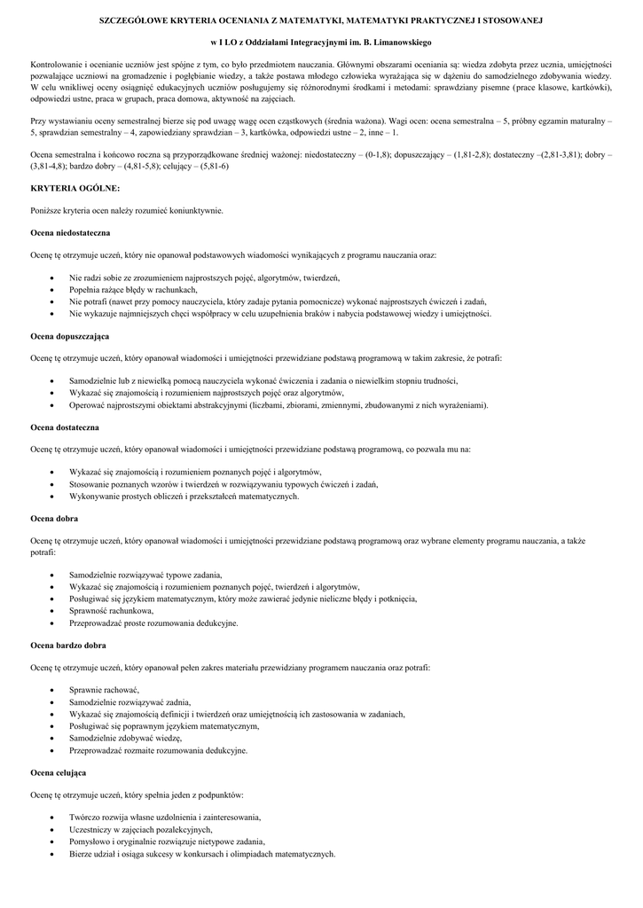 SZCZEGÓŁOWE KRYTERIA OCENIANIA Z MATEMATYKI, MATEMATYKI PRAKTYCZNEJ I STOSOWANEJ w I LO z Oddziałami Integracyjnymi im. B. Limanowskiego Kontrolowanie i ocenianie uczniów jest spójne z tym, co było przedmiotem nauczania. Głównymi obszarami oceniania są: wiedza zdobyta przez ucznia, umiejętności pozwalające uczniowi na gromadzenie i pogłębianie wiedzy, a także postawa młodego człowieka wyrażająca się w dążeniu do samodzielnego zdobywania wiedzy. W celu wnikliwej oceny osiągnięć edukacyjnych uczniów posługujemy się różnorodnymi środkami i metodami: sprawdziany pisemne (prace klasowe, kartkówki), odpowiedzi ustne, praca w grupach, praca domowa, aktywność na zajęciach. Przy wystawianiu oceny semestralnej bierze się pod uwagę wagę ocen cząstkowych (średnia ważona). Wagi ocen: ocena semestralna – 5, próbny egzamin maturalny – 5, sprawdzian semestralny – 4, zapowiedziany sprawdzian – 3, kartkówka, odpowiedzi ustne – 2, inne – 1. Ocena semestralna i końcowo roczna są przyporządkowane średniej ważonej: niedostateczny – (0-1,8); dopuszczający – (1,81-2,8); dostateczny –(2,81-3,81); dobry – (3,81-4,8); bardzo dobry – (4,81-5,8); celujący – (5,81-6) KRYTERIA OGÓLNE: Poniższe kryteria ocen należy rozumieć koniunktywnie. Ocena niedostateczna Ocenę tę otrzymuje uczeń, który nie opanował podstawowych wiadomości wynikających z programu nauczania oraz: Nie radzi sobie ze zrozumieniem najprostszych pojęć, algorytmów, twierdzeń, Popełnia rażące błędy w rachunkach, Nie potrafi (nawet przy pomocy nauczyciela, który zadaje pytania pomocnicze) wykonać najprostszych ćwiczeń i zadań, Nie wykazuje najmniejszych chęci współpracy w celu uzupełnienia braków i nabycia podstawowej wiedzy i umiejętności. Ocena dopuszczająca Ocenę tę otrzymuje uczeń, który opanował wiadomości i umiejętności przewidziane podstawą programową w takim zakresie, że potrafi: Samodzielnie lub z niewielką pomocą nauczyciela wykonać ćwiczenia i zadania o niewielkim stopniu trudności, Wykazać się znajomością i rozumieniem najprostszych pojęć oraz algorytmów, Operować najprostszymi obiektami abstrakcyjnymi (liczbami, zbiorami, zmiennymi, zbudowanymi z nich wyrażeniami). Ocena dostateczna Ocenę tę otrzymuje uczeń, który opanował wiadomości i umiejętności przewidziane podstawą programową, co pozwala mu na: Wykazać się znajomością i rozumieniem poznanych pojęć i algorytmów, Stosowanie poznanych wzorów i twierdzeń w rozwiązywaniu typowych ćwiczeń i zadań, Wykonywanie prostych obliczeń i przekształceń matematycznych. Ocena dobra Ocenę tę otrzymuje uczeń, który opanował wiadomości i umiejętności przewidziane podstawą programową oraz wybrane elementy programu nauczania, a także potrafi: Samodzielnie rozwiązywać typowe zadania, Wykazać się znajomością i rozumieniem poznanych pojęć, twierdzeń i algorytmów, Posługiwać się językiem matematycznym, który może zawierać jedynie nieliczne błędy i potknięcia, Sprawność rachunkowa, Przeprowadzać proste rozumowania dedukcyjne. Ocena bardzo dobra Ocenę tę otrzymuje uczeń, który opanował pełen zakres materiału przewidziany programem nauczania oraz potrafi: Sprawnie rachować, Samodzielnie rozwiązywać zadnia, Wykazać się znajomością definicji i twierdzeń oraz umiejętnością ich zastosowania w zadaniach, Posługiwać się poprawnym językiem matematycznym, Samodzielnie zdobywać wiedzę, Przeprowadzać rozmaite rozumowania dedukcyjne. Ocena celująca Ocenę tę otrzymuje uczeń, który spełnia jeden z podpunktów: Twórczo rozwija własne uzdolnienia i zainteresowania, Uczestniczy w zajęciach pozalekcyjnych, Pomysłowo i oryginalnie rozwiązuje nietypowe zadania, Bierze udział i osiąga sukcesy w konkursach i olimpiadach matematycznych. KRYTERIA SZCZEGÓŁOWE: Uczeń otrzymuje w ciągu semestru minimum 3 oceny cząstkowe. Na lekcji uczeń może być oceniony za: odpowiedź, aktywność, wykonywane ćwiczenia lub brak pracy. Po dłuższej nieobecności w szkole (powyżej 1 tygodnia) uczeń ma prawo nie być oceniany (nie dotyczy prac klasowych). Uczeń ma prawo dwa razy w semestrze być nieprzygotowany do lekcji, ale ma obowiązek o tym poinformować nauczyciela na początku lekcji, zgłoszenie nieprzygotowania zwalnia ucznia z pisania niezapowiedzianego sprawdzianu. Każde następne nieprzygotowanie skutkuje oceną niedostateczną. Sprawdziany niezapowiedziane sprawdzają opanowanie materiału z ostatnich lekcji. Trwają od 5 do 20 minut. Obejmują nie więcej niż 3 poprzednie jednostki lekcyjne. Nauczyciel po przeprowadzeniu takiego sprawdzianu może dokonać sprawdzenia jedynie kilku wybranych losowo prac. Wówczas taka praca jest równa odpowiedzi ustnej. Nie można ich poprawiać. Prace klasowe przeprowadzane są po zakończeniu realizacji danego działu materiału, zapowiadane są przynajmniej z dwutygodniowym wyprzedzeniem. Uczeń ma prawo wybrać zastaw rozwiązywanych zadań dwupoziomowej pracy klasowej (dwa zestawy – część łatwa/część trudna). Uczeń ma obowiązek napisania pracy klasowej w ustalonym terminie. W przypadku uzasadnionej nieobecności (zgłoszonej nauczycielowi, co najmniej w dzień poprzedzający termin klasówki lub okazania dłuższego zwolnienia) uczeń ma prawo napisać pracę klasową w dzień ustalony przez nauczyciela (termin jest wspólny dla wszystkich uczniów z danej klasy). Nie napisanie klasówki skutkuje cząstkową oceną niedostateczną. Uczeń ma możliwość poprawy każdej oceny z pracy klasowej w terminie wyznaczonym przez nauczyciela, uczeń może poprawić ją tylko jeden raz. Czas na poprawę oceny nie powinien przekroczyć dwóch tygodni od momentu jej wystawienia. Uczeń, który nie poprawił oceny w wyznaczonym terminie traci prawo do następnych poprawek tej pracy. Uczeń, który unika pisania pracy klasowej, nie przychodzi w określone dni do szkoły, p
