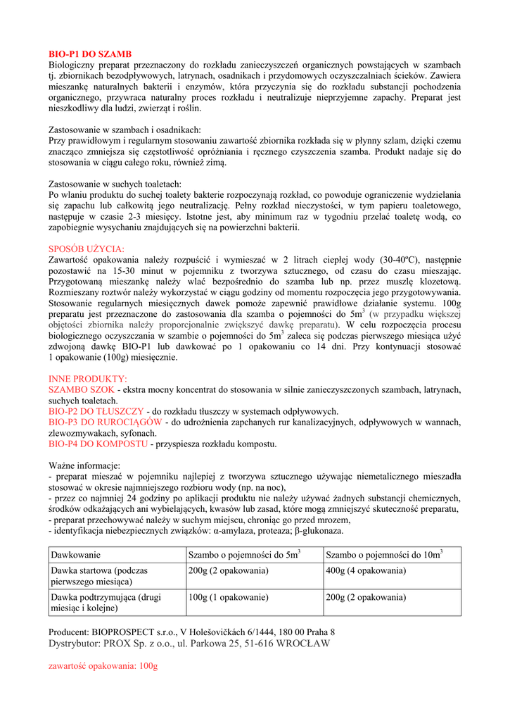 BIO-P1 DO SZAMB Biologiczny preparat przeznaczony do rozkładu zanieczyszczeń organicznych powstających w szambach tj. zbiornikach bezodpływowych, latrynach, osadnikach i przydomowych oczyszczalniach ścieków. Zawiera mieszankę naturalnych bakterii i enzymów, która przyczynia się do rozkładu substancji pochodzenia organicznego, przywraca naturalny proces rozkładu i neutralizuje nieprzyjemne zapachy. Preparat jest nieszkodliwy dla ludzi, zwierząt i roślin. Zastosowanie w szambach i osadnikach: Przy prawidłowym i regularnym stosowaniu zawartość zbiornika rozkłada się w płynny szlam, dzięki czemu znacząco zmniejsza się częstotliwość opróżniania i ręcznego czyszczenia szamba. Produkt nadaje się do stosowania w ciągu całego roku, również zimą. Zastosowanie w suchych toaletach: Po wlaniu produktu do suchej toalety bakterie rozpoczynają rozkład, co powoduje ograniczenie wydzielania się zapachu lub całkowitą jego neutralizację. Pełny rozkład nieczystości, w tym papieru toaletowego, następuje w czasie 2-3 miesięcy. Istotne jest, aby minimum raz w tygodniu przelać toaletę wodą, co zapobiegnie wysychaniu znajdujących się na powierzchni bakterii. SPOSÓB UŻYCIA: Zawartość opakowania należy rozpuścić i wymieszać w 2 litrach ciepłej wody (30-40ºC), następnie pozostawić na 15-30 minut w pojemniku z tworzywa sztucznego, od czasu do czasu mieszając. Przygotowaną mieszankę należy wlać bezpośrednio do szamba lub np. przez muszlę klozetową. Rozmieszany roztwór należy wykorzystać w ciągu godziny od momentu rozpoczęcia jego przygotowywania. Stosowanie regularnych miesięcznych dawek pomoże zapewnić prawidłowe działanie systemu. 100g preparatu jest przeznaczone do zastosowania dla szamba o pojemności do 5m3 (w przypadku większej objętości zbiornika należy proporcjonalnie zwiększyć dawkę preparatu). W celu rozpoczęcia procesu biologicznego oczyszczania w szambie o pojemności do 5m3 zaleca się podczas pierwszego miesiąca użyć zdwojoną dawkę BIO-P1 lub dawkować po 1 opakowaniu co 14 dni. Przy kontynuacji stosować 1 opakowanie (100g) miesięcznie. INNE PRODUKTY: SZAMBO SZOK - ekstra mocny koncentrat do stosowania w silnie zanieczyszczonych szambach, latrynach, suchych toaletach. BIO-P2 DO TŁUSZCZY - do rozkładu tłuszczy w systemach odpływowych. BIO-P3 DO RUROCIĄGÓW - do udrożnienia zapchanych rur kanalizacyjnych, odpływowych w wannach, zlewozmywakach, syfonach. BIO-P4 DO KOMPOSTU - przyspiesza rozkładu kompostu. Ważne informacje: - preparat mieszać w pojemniku najlepiej z tworzywa sztucznego używając niemetalicznego mieszadła stosować w okresie najmniejszego rozbioru wody (np. na noc), - przez co najmniej 24 godziny po aplikacji produktu nie należy używać żadnych substancji chemicznych, środków odkażających ani wybielających, kwasów lub zasad, które mogą zmniejszyć skuteczność preparatu, - preparat przechowywać należy w suchym miejscu, chroniąc go przed mrozem, - identyfikacja niebezpiecznych związków: α-amylaza, proteaza; β-glukonaza. Dawkowanie Szambo o pojemności do 5m3 Szambo o pojemności do 10m3 Dawka startowa (podczas pierwszego miesiąca) 200g (2 opakowania) 400g (4 opakowania) Dawka podtrzymująca (drugi miesiąc i kolejne) 100g (1 opakowanie) 200g (2 opakowania) Producent: BIOPROSPECT s.r.o., V Holešovičkách 6/1444, 180 00 Praha 8 Dystrybutor: PROX Sp. z o.o., ul. Parkowa 25, 51-616 WROCŁAW zawartość opakowania: 100g