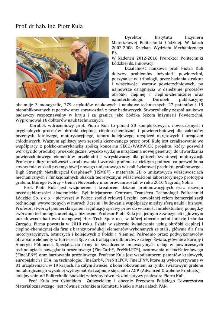 Prof. dr hab. inż. Piotr Kula Dyrektor Instytutu Inżynierii Materiałowej Politechniki Łódzkiej. W latach 2002-2008 Dziekan Wydziału Mechanicznego PŁ. W kadencji 2012-2016 Prorektor Politechniki Łódzkiej ds. Innowacji Działalność naukowa prof. Piotra Kuli dotyczy problemów inżynierii powierzchni, poczynając od tribologii, przez badania struktur i właściwości warstw powierzchniowych, po najnowsze osiągnięcia w dziedzinie procesów obróbki cieplnej i cieplno-chemicznej oraz nanotechnologii. Dorobek publikacyjny obejmuje 3 monografie, 279 artykułów naukowych i naukowo-technicznych, 27 patentów i 19 niepublikowanych raportów oraz sprawozdań z prac badawczych. Stworzył silny zespół naukowo badawczy rozpoznawalny w kraju i za granicą jako Łódzka Szkoła Inżynierii Powierzchni. Wypromował 16 doktorów nauk technicznych. Dorobek wdrożeniowy prof. Piotra Kuli to ponad 20 kompleksowych, nowoczesnych i oryginalnych procesów obróbki cieplnej, cieplno-chemicznej i powierzchniowej dla zakładów przemysłu lotniczego, motoryzacyjnego, taboru kolejowego, urządzeń okrętowych i urządzeń chłodniczych. Ważnym aplikacyjnym zespołu kierowanego przez prof. Kulę jest zrealizowanie we współpracy z polsko-amerykańską spółką koncernu SECO/WARWICK projektu, który pozwolił wdrożyć do produkcji proekologiczne, wysoko wydajne urządzenia nowej generacji do utwardzania powierzchniowego elementów przekładni i wtryskiwaczy dla potrzeb światowej motoryzacji. Profesor odkrył możliwości zarodkowania i wzrostu grafenu na ciekłym podłożu, co pozwoliło na stworzenie w skali przemysłowej nowego unikatowego w skali światowej produktu grafenowego High Strength Metallurgical Graphene® (HSMG®) - materiału 2D o unikatowych właściwościach mechanicznych i funkcjonalnych bliskich teoretycznym właściwościom laboratoryjnego prototypu grafenu, którego twórcy – Geim i Novosielov uhonorowani zostali w roku 2010 Nagrodą Nobla. Prof. Piotr Kula jest wizjonerem i kreatorem działań proinnowacyjnych oraz rozwoju przedsiębiorczości akademickiej. Był inicjatorem Centrum Transferu Technologii Politechniki Łódzkiej Sp. z o.o. - pierwszej w Polsce spółki celowej Uczelni, powołanej celem komercjalizacji technologii wytworzonych w murach Uczelni i budowania współpracy między sferą nauki i biznesu. Profesor, stworzył pionierski system regulujący sprawy praw do własności intelektualnej pomiędzy twórcami technologii, uczelnią, a biznesem. Profesor Piotr Kula jest jednym z założycieli i głównym udziałowcem hartowni usługowej Hart-Tech Sp. z o.o., w której obecnie pełni funkcję Członka Zarządu. Firma powstała w 2010 roku. Działa w zakresie świadczenia usług obróbki cieplnej i cieplno-chemicznej dla firm z branży produkcji elementów wykonanych ze stali , głównie dla firm motoryzacyjnych, lotniczych i kolejowych z Polski i Niemiec. Pośrednio przez podwykonawców obrabiane elementy w Hart-Tech Sp. z o.o. trafiają do odbiorców z całego Świata, głównie z Europy i Ameryki Północnej. Specjalizacja firmy to świadczenie innowacyjnych usług w nowoczesnych technologiach nawęglania próżniowego (FineCarb®, PreNitLPC®), azotowania niskociśnieniowego (FineLPN®) oraz hartowania próżniowego. Profesor Kula jest współautorem patentów krajowych, europejskich i USA, na technologie: FineCarb®, PreNitLPC®, FineLPN®, które są wykorzystywane w 81 urządzeniach, w 19 krajach, na całym świecie. Z kolei lokowaniem na rynku światowym grafenu metalurgicznego wysokiej wytrzymałości zajmuje się spółka AGP (Advanced Graphene Products) – kolejny spin-off Politechniki Łódzkiej założony również z inicjatywy profesora Piotra Kuli. Prof. Kula jest Członkiem Założycielem i obecnie Prezesem Polskiego Towarzystwa Materiałoznawczego. Jest również członkiem Komitetu Nauki o Materiałach PAN.