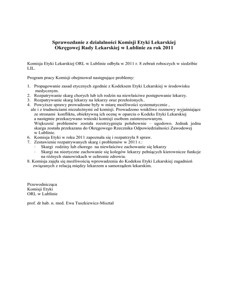 Sprawozdanie z działalności Komisji Etyki Lekarskiej Okręgowej Rady Lekarskiej w Lublinie za rok 2011 Komisja Etyki Lekarskiej ORL w Lublinie odbyła w 2011 r. 8 zebrań roboczych w siedzibie LIL. Program pracy Komisji obejmował następujące problemy: 1. Propagowanie zasad etycznych zgodnie z Kodeksem Etyki Lekarskiej w środowisku medycznym. 2. Rozpatrywanie skarg chorych lub ich rodzin na niewłaściwe postępowanie lekarzy. 3. Rozpatrywanie skarg lekarzy na lekarzy oraz przełożonych.. 4. Powyższe sprawy prowadzone były w miarę możliwości systematycznie , ale i z trudnościami niezależnymi od komisji. Prowadzono wnikliwe rozmowy wyjaśniające ze stronami konfliktu, obiektywną ich ocenę w oparciu o Kodeks Etyki Lekarskiej a następnie przekazywano wnioski komisji osobom zainteresowanym. Większość problemów została rozstrzygnięta polubownie – ugodowo. Jednak jedna skarga została przekazana do Okręgowego Rzecznika Odpowiedzialności Zawodowej w Lublinie. 6. Komisja Etyki w roku 2011 zapoznała się i rozpatrzyła 8 spraw. 7. Zestawienie rozpatrywanych skarg i problemów w 2011 r.: - Skargi rodziny lub chorego na niewłaściwe zachowanie się lekarzy - Skargi na nieetyczne zachowanie się kolegów lekarzy pełniących kierownicze funkcje na różnych stanowiskach w ochronie zdrowia. 8. Komisja zajęła się możliwością wprowadzenia do Kodeksu Etyki Lekarskiej zagadnień związanych z relacją między lekarzem a samorządem lekarskim. Przewodnicząca Komisji Etyki ORL w Lublinie prof. dr hab. n. med. Ewa Tuszkiewicz-Misztal