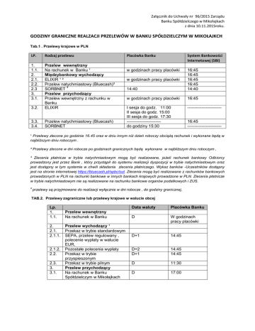 Załącznik do Uchwały nr 96/2015 Zarządu Banku Spółdzielczego w Mikołajkach z dnia 10.11.2015roku. GODZINY GRANICZNE REALZACJI PRZELEWÓW W BANKU SPÓŁDZIELCZYM W MIKOŁAJKCH Tab.1 . Przelewy krajowe w PLN LP. Rodzaj przelewu 1. 1.1. 2. 2.1. 2.2. 2.3 3. 3.1. 3.2. Przelew wewnętrzny Na rachunek w Banku ¹ Międzybankowy wychodzący ELIXIR ¹ ² Przelew natychmiastowy (Bluecash)³ 4 SORBNET Przelew przychodzący Przelew wewnętrzny z rachunku w Banku ELIXIR 3.3. 3.4. Przelew natychmiastowy (Bluecash) SORBNET Placówka Banku System Bankowości Internetowej (SBI) w godzinach pracy placówki 14:40 16:45 16:45 16:45 16:45 14:40 w godzinach pracy placówki 16:45 I sesja do godz. 11:00 II sesja do godz. 15:00 III sesja do godz. 17:30 -----------------------do godziny 15:30 ------------------------ w godzinach pracy placówki 16:45 ------------------------ ¹ Przelewy zlecone po godzinie 16.45 oraz w dniu innym niż dzień roboczy obciążą rachunek i wykonane będą w najbliższym dniu roboczym . ² Przelewy zlecone w dni robocze po godzinach granicznych będą wykonane w najbliższym dniu roboczym , ³ Zlecenia płatnicze w trybie natychmiastowym mogą być realizowane, jeżeli rachunek bankowy Odbiorcy prowadzony jest przez Bank , który przystąpił do systemu realizacji dyspozycji w trybie natychmiastowym oraz jest dostępny w tym systemie w chwili składania zlecenia płatniczego. Wykaz banków -Uczestników dostępny jest na stronie internetowej https://bluecash.pl/spbc/out. Zlecenia mogą być realizowane z rachunków bankowych prowadzonych w PLN na rachunki bankowe w innych bankach krajowych prowadzone w PLN. Zlecenia płatnicze w trybie natychmiastowym nie są realizowane na rachunku bankowe organów podatkowych i ZUS. 4 przelewy są przyjmowane do realizacji wyłącznie w dni robocze , do godziny granicznej, TAB.2. Przelewy zagraniczne lub przelewy krajowe w walucie obcej Lp. 1. 1.1. 2. 2.1. 2.1.1. 2.1.2. 2.2. 2.3. 3. 3.1. Przelew wewnętrzny Na rachunek w Banku Przelew wychodzący ¹ Przekaz w trybie standardowym SEPA, przelew regulowany , polecenie wypłaty w walucie EUR, Pozostałe polecenia wypłaty Przekaz w trybie przyspieszonym Przekaz w trybie pilnym Przelew przychodzący Na rachunek w Banku Spółdzielczym w Mikołajkach Data waluty Placówka Banku D W godzinach pracy placówki D+1 14:45 D+2 D+1 14:45 14:45 D 11:30 D 17:00