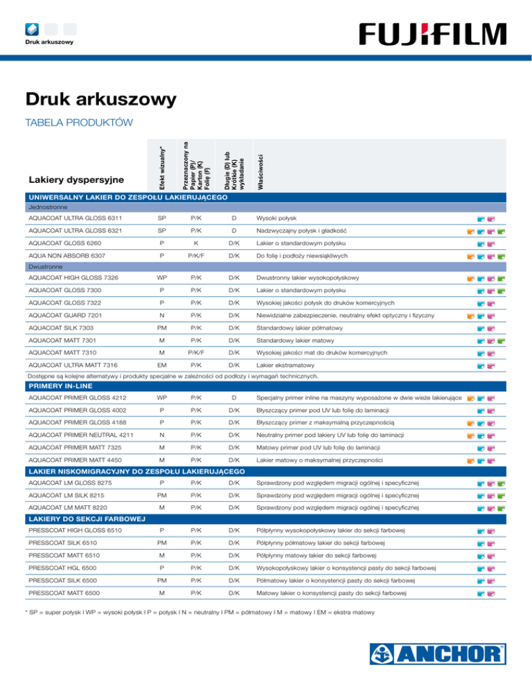 Druk arkuszowy Druk arkuszowy Właściwości Długie (D) lub Krótkie (K) wykładanie Przeznaczony na Papier (P)/ Karton (K) Folię (F) Lakiery dyspersyjne Efekt wizualny* Tabela produktów Uniwersalny lakier do zespołu lakierującego Jednostronne Aquacoat Ultra Gloss 6311 SP P/K D Wysoki połysk Aquacoat Ultra Gloss 6321 SP P/K D Nadzwyczajny połysk i gładkość Aquacoat Gloss 6260 P K D/K Lakier o standardowym połysku Aqua Non Absorb 6307 P P/K/F D/K Do folię i podłoży niewsiąkliwych WP P/K D/K Dwustronny lakier wysokopołyskowy Aquacoat Gloss 7300 P P/K D/K Lakier o standardowym połysku Aquacoat Gloss 7322 P P/K D/K Wysokiej jakości połysk do druków komercyjnych Dwustronne Aquacoat HIGH GLOSS 7326 Aquacoat Guard 7201 N P/K D/K Niewidzialne zabezpieczenie, neutralny efekt optyczny i fizyczny Aquacoat Silk 7303 PM P/K D/K Standardowy lakier półmatowy Aquacoat Matt 7301 M P/K D/K Standardowy lakier matowy Aquacoat Matt 7310 M P/K/F D/K Wysokiej jakości mat do druków komercyjnych EM P/K D/K Lakier ekstramatowy Aquacoat Ultra Matt 7316 Dostępne są kolejne alternatywy i produkty specjalne w zależności od podłoży i wymagań technicznych. Primery in-line Aquacoat Primer GLOSS 4212 WP P/K D Specjalny primer inline na maszyny wyposażone w dwie wieże lakierujące Aquacoat Primer GLOSS 4002 P P/K D/K Błyszczący primer pod UV lub folię do laminacji Aquacoat Primer GLOSS 4188 P P/K D/K Błyszczący primer z maksymalną przyczepnością Aquacoat Primer NEUTRAL 4211 N P/K D/K Neutralny primer pod lakiery UV lub folię do laminacji Aquacoat Primer Matt 7325 M P/K D/K Matowy primer pod UV lub folię do laminacji Aquacoat Primer Matt 4450 M P/K D/K Lakier matowy o maksymalnej przyczepności Lakier niskomigracyjny do zespołu lakierującego Aquacoat LM Gloss 8275 P P/K D/K Sprawdzony pod względem migracji ogólnej i specyficznej Aquacoat LM Silk 8215 PM P/K D/K Sprawdzony pod względem migracji ogólnej i specyficznej Aquacoat LM Matt 8220 M P/K D/K Sprawdzony pod względem migracji ogólnej i specyficznej P P/K D/K Półpłynny wysokopołyskowy lakier do sekcji farbowej Presscoat Silk 6510 PM P/K D/K Półpłynny półmatowy lakier do sekcji farbowej Presscoat Matt 6510 M P/K D/K Półpłynny matowy lakier do sekcji farbowej Presscoat HGL 6500 P P/K D/K Wysokopołyskowy lakier o konsystencji pasty do sekcji farbowej Presscoat Silk 6500 PM P/K D/K Półmatowy lakier o konsystencji pasty do sekcji farbowej Presscoat Matt 6500 M P/K D/K Matowy lakier o konsystencji pasty do sekcji farbowej Lakiery do sekcji farbowej Presscoat High Gloss 6510 * SP = super połysk l WP = wysoki połysk l P = połysk l N = neutralny l PM = półmatowy l M = matowy l EM = ekstra matowy W linii na farby UV In-line lub Off-line Właściwości I/O Uniwersalny P/K/F • I/O Do maszyn wąskowstęgowych WP P/K • I/O Nie żółknący WP P/K • • I/O Możliwe klejenie, hot-stamping, tworzenie efektu TwinSpot M P/K/F • • I/O Uniwersalny I/O Sprawdzony pod względem migracji ogólnej i specyficznej Przeznaczony na Papier (P)/ Karton (K) Folię (F) • Efekt wizualny* Lakiery UV Lakierowanie w linii na farby konwencjonalne + dyspersyjny primer Druk arkuszowy Uniwersalny lakier do zespołu lakierującego UV Coat Gloss 7330 WP P/K/F UV Coat Gloss 6337 WP UV Coat Gloss 7331 UV Coat Gloss 7337 UV Coat Matt 7334 • Lakier niskomigracyjny do zespołu lakierującego UV Coat LM Gloss 8250 WP P/K/F • • Lakiery do sekcji farbowej Presscoat UV High Gloss 7336 PRESSCOAT UV MATT 7351 WP P/K/F • I/O Półpłynny, nadaje się do aplikacji ze standardowej płyty offsetowej M P/K/F • I/O Półpłynny, nadaje się do aplikacji ze standardowej płyty offsetowej Olejowe lakiery efektowe FO-260 TwinSpot Olejowy primer, w połączeniu z kompatybilnym lakierem UV daje efekt skórki pomarańczowej. Punkt zapłonu (°C) Właściwości Farby Hybrydowe Farby UV Zmywacze Farby konwencjonalne * WP = wysoki połysk l M = matowy 100 Odpowiedni do filtracji Odpowiednie dla gumy NBR Niemieszalne z wodą Anchor A 440-F • Mieszalne z wodą Anchor A 209 • 45 Szybkoschnący Anchor A 330 • 64 Do mycia ręcznego i automatycznego Anchor A 460 • 100 Anchor A 360 • 62 Stworzony specjalnie dla szczotkowych automatycznych systemów myjących Anchor A 45 • 42 Szybkoschnący, do mycia ręcznego Anchor A 1300 UV • 68 Do mycia ręcznego i w automatach myjących • Do automatycznych systemów myjących Odpowiednie dla gumy EPDM Mieszalne z wodą Anchor A 1310 UV • • 76 Odpowiedni dla każdego typu wałków Anchor A 1411 UV • • 96 Do niewygrzewanych i bezprocesowych płyt offsetowych, odpowiedni dla gumy NBR i EPDM • 36 Szybkoschnący • 68 Odpowiednie dla gumy NBR Anchor A 1250 UV Anchor A 1300 UV • • Farby konwencjonalne Farby UV/ hybrydowe Druk formularzy 2-3 • • • Emerald Premium 3545 3-4 • • Emerald Premium 3555 ECOdry 3-4 • Emerald Premium 3530 3-4 • • Emerald Premium 3106 3-4 • • Bufory Właściwości Dozowanie (%) Druk arkuszowy Z IPA Emerald 3100 Do każdego rodzaju zespołu zwilżającego Bez IPA • Zawiera suszkę wolną od kobaltu • Odpowiedni dla każdego rodzaju wody Zalecane do użycia podczas lakierowania Do twardej wody, zredukowane brudzenie wałków wodnych Gramatura papieru Pudry Stworzony specjalnie do farb metalizowanych Niepowlekane ECOPowder UC 20 < 150 g ECOPowder UC 30 125 g - 250 g ECOPowder UC 50 > 250 g Powlekane ECOPowder C 5020 < 150 g • ECOPowder C 5030 125 g - 250 g • ECOPowder C 5050 > 250 g • Wszystkie nasze pudry posiadają atest Niemieckeigo „Berufsgenssenschaft” (zrzeszenia drukarzy) Druk arkuszowy Dodatki Środki ochrony płyty Plate Refresh Mleczko do płyt - łagodne Plate Restore Mleczko do płyt - mocne Lithogum Guma arabska - naturalna Dodatki do farb Antiskin Anti-Skin do farb schnących oksydacyjnie Colorstart Spray Odświeżacz do farb GrafoDrY Suszka w paście Ink Control Poprawia balans wodno-farbowy (szczególnie dla małego pokry