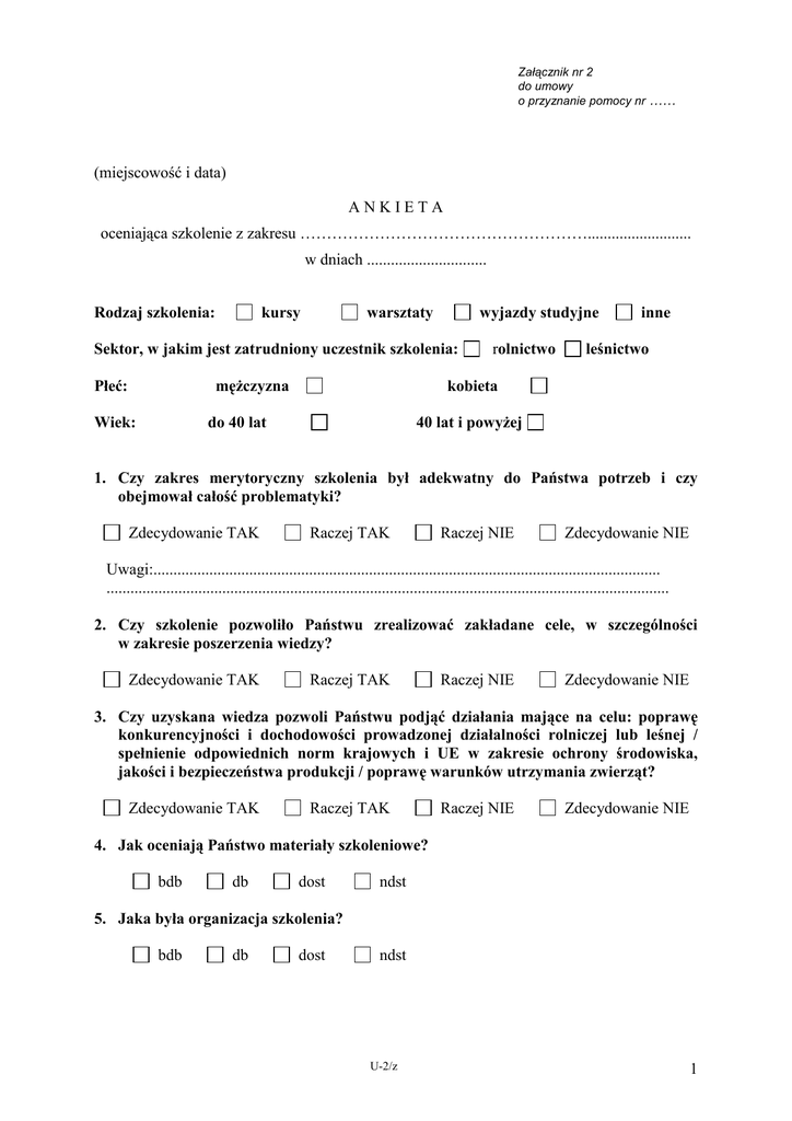 Załącznik nr 2 do umowy o przyznanie pomocy nr …… (miejscowość i data) ANKIETA oceniająca szkolenie z zakresu ……………………………………………….......................... w dniach .............................. Rodzaj szkolenia: kursy warsztaty wyjazdy studyjne Sektor, w jakim jest zatrudniony uczestnik szkolenia: męŜczyzna Płeć: Wiek: rolnictwo inne leśnictwo kobieta do 40 lat 40 lat i powyŜej 1. Czy zakres merytoryczny szkolenia był adekwatny do Państwa potrzeb i czy obejmował całość problematyki? Zdecydowanie TAK Raczej TAK Raczej NIE Zdecydowanie NIE Uwagi:............................................................................................................................... ............................................................................................................................................. 2. Czy szkolenie pozwoliło Państwu zrealizować zakładane cele, w szczególności w zakresie poszerzenia wiedzy? Zdecydowanie TAK Raczej TAK Raczej NIE Zdecydowanie NIE 3. Czy uzyskana wiedza pozwoli Państwu podjąć działania mające na celu: poprawę konkurencyjności i dochodowości prowadzonej działalności rolniczej lub leśnej / spełnienie odpowiednich norm krajowych i UE w zakresie ochrony środowiska, jakości i bezpieczeństwa produkcji / poprawę warunków utrzymania zwierząt? Zdecydowanie TAK Raczej TAK Raczej NIE Zdecydowanie NIE 4. Jak oceniają Państwo materiały szkoleniowe? bdb db dost ndst 5. Jaka była organizacja szkolenia? bdb db dost ndst U-2/z 1 OCENA PROWADZĄCEGO SZKOLENIE 6. FACHOWOŚĆ: bdb db dost ndst 7. KOMUNIKATYWNOŚĆ: bdb db dost ndst 8. ZAANGAśOWANIE: bdb db dost ndst 9. PRACA Z GRUPĄ: bdb db dost ndst 10. Czy odpowiadał Państwu sposób realizacji prezentowanego materiału? Zdecydowanie TAK Raczej TAK Raczej NIE Zdecydowanie NIE 11. Czy informacje przekazywane przez wykładowców były dla Państwa: a) zrozumiałe: tak nie W przypadku odpowiedzi NIE proszę uzasadnić .............................................................. ........................................................................................................................................... b) wyczerpujące: tak nie W przypadku odpowiedzi NIE proszę uzasadnić ................................................................ ............................................................................................................................................ ............................................................................................................................................ 12. Czy brał/a Pan/i udział w innym szkoleniu spośród niŜej wymienionych zakresów tematycznych szkoleń przeprowadzanych w ramach działania „Szkolenia zawodowe dla osób zatrudnionych w rolnictwie i leśnictwie” PROW 2007-2013? • Ekonomika zarządzanie gospodarstwem rolnym lub produkcją leśną. • Zastosowanie mikrokomputerów i programów komputerowych w usprawnieniu zarządzania gospodarstwem rolnym i leśnym. • Upowszechnianie nowoczesnych technologii w rolnictwie i leśnictwie. • Upowszechnianie zasad proekologicznych metod produkcji rolniczej, a w szczególności integrowanej produkcji rolniczej i rolnictwa ekologicznego. • Podejmowanie nowych, rynkowo zorientowanych kierunków produkcji rolnej. • Popularyzacja nowych kierunków działalności rolniczej w celu uzyskania dodatkowych dochodów. • Upowszechnianie standardów jakościowych w produkcji rolniczej i leśnej. • Poprawa jakości i higieny produkcji. • Warunki bezpiecznego wytwarzania i przechowywania pasz w gospodarstwie w kontekście bezpieczeństwa Ŝywnościowego. • Ochrona środowiska w gospodarstwie rolnym, ze szczególnym uwzględnieniem gospodarstw na Obszarach Szczególnie NaraŜonych. • Minimalne wymagania wzajemnej zgodności dla gospodarstw rolnych (tzw. Cross – compliance). • Prawidłowe warunki utrzymywania zwierząt. • Inny (podać tytuł zakresu tematycznego szkolenia) ………………………… ……………………………………………………………………………………. tak nie U-2/z 2 Dziękujemy za wypełnienie ankiety! U-2/z 3