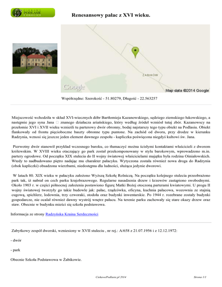 Renesansowy pałac z XVI wieku. Współrzędne: Szerokość - 51.80279, Długość - 22.563257 Miejscowość wchodziła w skład XVI-wiecznych dóbr Bartłomieja Kazanowskiego, sędziego ziemskiego łukowskiego, a następnie jego syna Jana znanego działacza ariańskiego, który według źródeł wzniósł tutaj zbór. Kazanowscy na przełomie XVI i XVII wieku wznieśli tu parterowy dwór obronny, bodaj najstarszy tego typu obiekt na Podlasiu. Obiekt flankowały od frontu pięcioboczne baszty obronne typu puntone. Na zachód od dworu, przy drodze w kierunku Radzynia, wznosi się jeszcze jeden element dawnego zespołu - kapliczka poświęcona niegdyś kultowi św. Jana. Pierwotny dwór stanowił przykład wczesnego baroku, co tłumaczyć można ścisłymi kontaktami właścicieli z dworem królewskim. W XVIII wieku otaczający go park został przekomponowany w stylu barokowym, wprowadzono m.in. partery ogrodowe. Od początku XIX stulecia do II wojny światowej właścicielami majątku była rodzina Ośniałowskich. Wtedy to nadbudowano piętro nadając mu charakter pałacyku. Wytyczona została również nowa droga do Radzynia (obok kapliczki) obsadzona wierzbami, niedostępna dla ludności, służąca jedynie dworowi. W latach 80. XIX wieku w pałacyku założono Wyższą Szkołę Rolniczą. Na początku kolejnego stulecia przeobrażono park tak, iż nabrał on cech parku krajobrazowego. Regularne nasadzenia drzew i krzewów zastąpiono swobodnymi. Około 1903 r. w części północnej założenia postawiono figurę Matki Bożej otoczoną parterami kwiatowymi. U progu II wojny światowej tworzyły go takie budowle jak: pałac, rządcówka, oficyna, kuchnia pałacowa, wozownia ze stajnią cugową, spichlerz, lodownia, trzy czworaki, stodoła oraz budynki inwentarskie. Po 1944 r. rozebrane zostały budynki gospodarcze, nie ocalał również dawny wystrój wnętrz pałacu. Na terenie parku zachowały się stare okazy drzew oraz staw. Obecnie w budynku mieści się szkoła podstawowa. Informacja ze strony Radzyńska Kraina Serdeczności Zabytkowy zespół dworski, wzniesiony w XVII stuleciu , nr rej.: A/658 z 21.07.1956 i z 12.12.1972: - dwór - park Obecnie Szkoła Podstawowa w Żabikowie. CiekawePodlasie.pl 2014 Strona 1/1