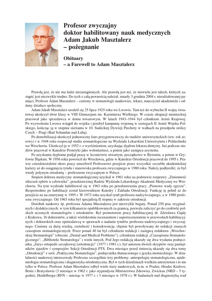 Profesor zwyczajny doktor habilitowany nauk medycznych Adam Jakub Masztalerz – pożegnanie Obituary – a Farewell to Adam Masztalerz Prawdą jest, że nie ma ludzi niezastąpionych. Ale prawdą jest też, że niewielu jest takich, których za− stąpić jest niezwykle trudno. Do tych z całą pewnością należał, zmarły 3 grudnia 2004 r. nieodżałowanej pa− mięci, Profesor Adam Masztalerz – ceniony w stomatologii naukowiec, lekarz, nauczyciel akademicki i od− dany działacz społeczny. Adam Jakub Masztalerz urodził się 25 lipca 1925 roku we Lwowie. Tam też do wybuchu II wojny świa− towej ukończył dwie klasy w VIII Gimnazjum im. Kazimierza Wielkiego. W czasie okupacji niemieckiej pracował jako sprzedawca w domu towarowym. W latach 1943–1944 był członkiem Armii Krajowej. Po wyzwoleniu Lwowa wstąpił do wojska i przebył kampanię wojenną w szeregach II Armii Wojska Pol− skiego, kończąc ją w stopniu sierżanta w 10. Sudeckiej Dywizji Piechoty w walkach na przedpolu stolicy Czech – Pragi (Bad Schandau nad Łabą). Po demobilizacji ukończył jednoroczny kurs przygotowawczy do studiów uniwersyteckich (tzw. rok ze− rowy) i w 1948 roku rozpoczął studia stomatologiczne na Wydziale Lekarskim Uniwersytetu i Politechniki we Wrocławiu. Ukończył je w 1952 r. z wyróżnieniem, uzyskując dyplom lekarza dentysty. Już podczas stu− diów pracował w Katedrze Protetyki jako wolontariusz, a potem jako zastępca asystenta. Po uzyskaniu dyplomu podjął pracę w lecznictwie otwartym, początkowo w Bytomiu, a potem w Gry− fowie Śląskim. W 1956 roku powrócił do Wrocławia, gdzie w Katedrze Ortodoncji pracował do 1995 r. Pra− wie czterdziestoletni okres pracy umożliwił Profesorowi przejście przez wszystkie szczeble akademickiej kariery aż do osiągnięcia tytułu i stanowiska profesora zwyczajnego w 1980 roku. Należy podkreślić, że był wtedy jedynym ortodontą – profesorem zwyczajnym w Polsce. Stopień doktora medycyny stomatologicznej uzyskał w 1961 roku na podstawie rozprawy „Zmienność stłoczeń zębów u człowieka”, przedstawionej Radzie Wydziału Lekarskiego Akademii Medycznej we Wro− cławiu. Na tym wydziale habilitował się w 1963 roku po przedstawieniu pracy „Pionowe wady zgryzu”. Bezpośrednio po habilitacji został kierownikiem Katedry i Zakładu Ortodoncji. Funkcję tę pełnił aż do przejścia na na emeryturę w 1995 r. W 1973 roku uzyskał tytuł profesora nadzywczajnego, a w 1980 profe− sora zwyczajnego. Od 1963 roku był specjalistą II stopnia w zakresie ortodoncji. Dorobek naukowy śp. profesora Adama Masztalerza jest niezwykle bogaty. Ponad 250 prac oryginal− nych i dydaktycznych, w tym kilkanaście opublikowanych za granicą, pozwala zaliczyć go do czołówki pol− skich uczonych stomatologów i ortodontów. Był promotorem pracy habilitacyjnej dr. Zdzisława Gajdy z Krakowa, 16 doktoratów, a także wielokrotnie recenzentem i superrecenzentem w przewodach habilitacyj− nych i doktorskich oraz opiniodawcą w sprawach o nadanie tytułów profesora nadzwyczajnego i zwyczaj− nego. Ceniony za dużą wiedzę, rzetelność i konsekwencję, chętnie był powoływany do redakcji znanych czasopism stomatologicznych. Przez ponad 40 lat był członkiem redakcji i zastępcą redaktora „Wrocław− skiej Stomatologii” (obecnie „Dental and Medical Problems”), członkiem redakcji „Czasopisma Stomatolo− gicznego”, „Biblioteki Stomatologa” i wielu innych. Pod Jego redakcją ukazały się dwa wydania podręcz− nika „Zarys ortopedii szczękowej (ortodoncji)” (1977 i 1981 r.); był autorem dwóch skryptów oraz pamięt− ników zjazdów i sympozjów Sekcji Ortodoncji PTS. Dwa miesiące przed śmiercią ukazały się dwa tomy „Ortodoncji” z serii „Praktyczna Stomatologia”, podręcznika tłumaczonego z języka niemieckiego. W dzia− łalności naukowej interesowały Profesora szczególnie trzy problemy: antropologia stomatologiczna, epide− miologia stomatologiczna i diagnostyka ortodontyczna. Był w tych dziedzinach wielkim autorytetem i to nie tylko w Polsce. Profesor Adam Masztalerz odbył wiele staży naukowych, m.in. w Pradze, Hradec Kralove, Brnie i Bratysławie (3 miesiące w 1962 r. jako stypendysta Ministerstwa Zdrowia), Zwickau (NRD – 5 ty− godni), Heidelbergu (RFN – miesiąc w 1977 r. i 3 miesiące w 1978 r.). W badaniach nad diagnostyką wad 8 Adam Jakub Masztalerz (1925–2004) zgryzu, we współpracy z Zakładem Antropologii PAN, doprowadził do weryfikacji niektórych norm mor− fologicznych w ortodoncji i wprowadził nowe, oryginalne wskaźniki diagnostyczne (wskaźnik nosowo− −szczękowy, logarytmiczny wyróżnik kształtu łuku zębowego). Wykazał również narastanie od neolitu do czasów współczesnych częstości stłoczeń zębowych i ich zależność od nadmiernych stężeń fluoru w wodzie pitnej. Pod Jego kierunkiem opracowano pierwszą w Polsce mapę epidemiologiczną wad zgryzu. Ogromne są osiągnięcia śp. Profesora Adama Masztalerza w długoletniej pracy dydaktyczno−wycho− wawczej. Już w czasie studiów był nauczycielem zawodu w Państwowym Liceum Techniki Dentystycznej, a po rocznym wolontariacie w Katedrze Protetyki uzyskał w 1950 roku etat zastępcy asystenta. Kilkuletnia przerwa w działalności dydaktycznej, spowodowana względami politycznymi, nie zmniejszyła Jego nie− podważalnych osiągnięć. Znalazło to zresztą należne odbicie w w powierzanych Mu funkcjach. Był opie− kunem roku, prodziekanem Wydziału Lekarskiego, prorektorem Akademii Medycznej, kierownikiem Od− działu Stomatologicznego, zastępcą dyrektora Instytutu Stomatologii, członkiem i przewodniczącym wielu komisji senackich, komisji rekrutacyjnych, specjalizacyjnych komisji egzaminacyjnych i wielu innych. Świetny wykładowca, rzetelnie przygotowywał się do każdego wykładu, stosował nowoczesne sposo− by przekazywania wiedzy, a studenci chętnie br