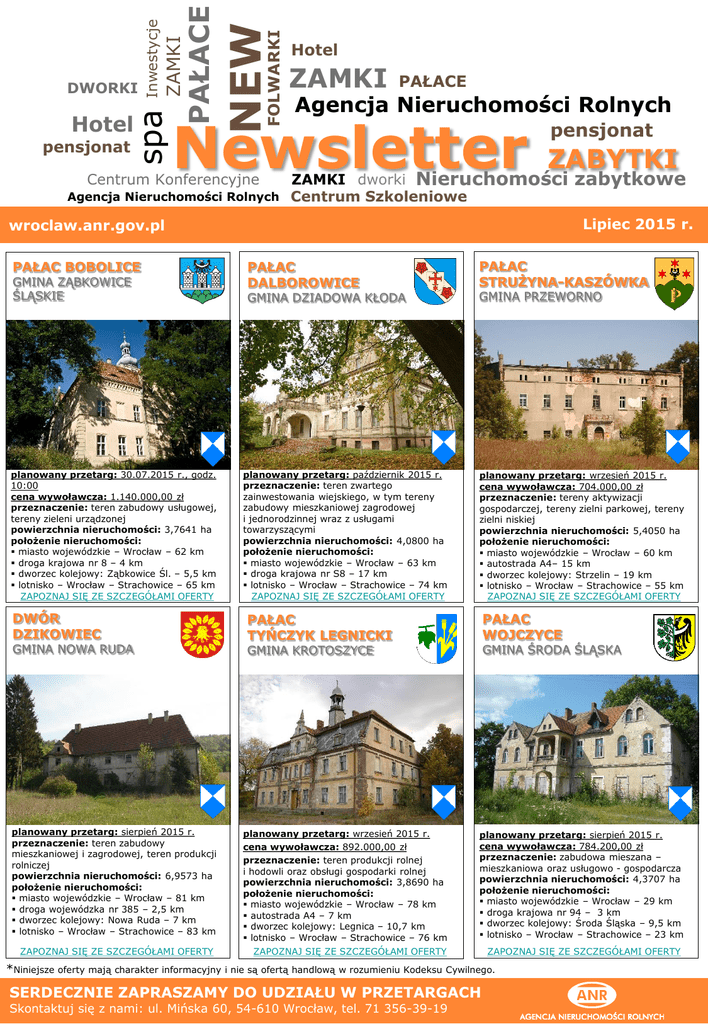 pensjonat FOLWARKI Hotel NEW PAŁACE ZAMKI Inwestycje spa DWORKI Hotel ZAMKI PAŁACE Agencja Nieruchomości Rolnych Newsletter pensjonat ZABYTKI ZAMKI dworki Nieruchomości Agencja Nieruchomości Rolnych Centrum Szkoleniowe Centrum Konferencyjne Lipiec 2015 r. wroclaw.anr.gov.pl PAŁAC BOBOLICE GMINA ZĄBKOWICE ŚLĄSKIE planowany przetarg: 30.07.2015 r., godz. 10:00 cena wywoławcza: 1.140.000,00 zł przeznaczenie: teren zabudowy usługowej, tereny zieleni urządzonej powierzchnia nieruchomości: 3,7641 ha położenie nieruchomości: miasto wojewódzkie – Wrocław – 62 km droga krajowa nr 8 – 4 km dworzec kolejowy: Ząbkowice Śl. – 5,5 km lotnisko – Wrocław – Strachowice – 65 km ZAPOZNAJ SIĘ ZE SZCZEGÓŁAMI OFERTY DWÓR DZIKOWIEC GMINA NOWA RUDA planowany przetarg: sierpień 2015 r. przeznaczenie: teren zabudowy mieszkaniowej i zagrodowej, teren produkcji rolniczej powierzchnia nieruchomości: 6,9573 ha położenie nieruchomości: miasto wojewódzkie – Wrocław – 81 km droga wojewódzka nr 385 – 2,5 km dworzec kolejowy: Nowa Ruda – 7 km lotnisko – Wrocław – Strachowice – 83 km ZAPOZNAJ SIĘ ZE SZCZEGÓŁAMI OFERTY *Niniejsze oferty mają charakter informacyjny zabytkowe PAŁAC DALBOROWICE GMINA DZIADOWA KŁODA planowany przetarg: październik 2015 r. przeznaczenie: teren zwartego zainwestowania wiejskiego, w tym tereny zabudowy mieszkaniowej zagrodowej i jednorodzinnej wraz z usługami towarzyszącymi powierzchnia nieruchomości: 4,0800 ha położenie nieruchomości: miasto wojewódzkie – Wrocław – 63 km droga krajowa nr S8 – 17 km lotnisko – Wrocław – Strachowice – 74 km ZAPOZNAJ SIĘ ZE SZCZEGÓŁAMI OFERTY PAŁAC STRUŻYNA-KASZÓWKA GMINA PRZEWORNO planowany przetarg: wrzesień 2015 r. cena wywoławcza: 704.000,00 zł przeznaczenie: tereny aktywizacji gospodarczej, tereny zielni parkowej, tereny zielni niskiej powierzchnia nieruchomości: 5,4050 ha położenie nieruchomości: miasto wojewódzkie – Wrocław – 60 km autostrada A4– 15 km dworzec kolejowy: Strzelin – 19 km lotnisko – Wrocław – Strachowice – 55 km ZAPOZNAJ SIĘ ZE SZCZEGÓŁAMI OFERTY PAŁAC WOJCZYCE PAŁAC TYŃCZYK LEGNICKI GMINA ŚRODA ŚLĄSKA GMINA KROTOSZYCE planowany przetarg: wrzesień 2015 r. cena wywoławcza: 892.000,00 zł przeznaczenie: teren produkcji rolnej i hodowli oraz obsługi gospodarki rolnej powierzchnia nieruchomości: 3,8690 ha położenie nieruchomości: miasto wojewódzkie – Wrocław – 78 km autostrada A4 – 7 km dworzec kolejowy: Legnica – 10,7 km lotnisko – Wrocław – Strachowice – 76 km planowany przetarg: sierpień 2015 r. cena wywoławcza: 784.200,00 zł przeznaczenie: zabudowa mieszana – mieszkaniowa oraz usługowo - gospodarcza powierzchnia nieruchomości: 4,3707 ha położenie nieruchomości: miasto wojewódzkie – Wrocław – 29 km droga krajowa nr 94 – 3 km dworzec kolejowy: Środa Śląska – 9,5 km lotnisko – Wrocław – Strachowice – 23 km ZAPOZNAJ SIĘ ZE SZCZEGÓŁAMI OFERTY ZAPOZNAJ SIĘ ZE SZCZEGÓŁAMI OFERTY i nie są ofertą handlową w rozumieniu Kodeksu Cywilnego. SERDECZNIE ZAPRASZAMY DO UDZIAŁU W PRZETARGACH Skontaktuj się z nami: ul. Mińska 60, 54-610 Wrocław, tel. 71 356-39-19