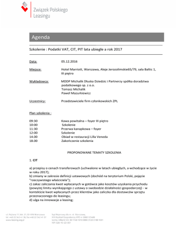 Agenda Szkolenie : Podatki VAT, CIT, PIT lata ubiegłe a rok 2017 Data: 05.12.2016 Miejsce: Hotel Marriott, Warszawa, Aleje Jerozolimskie65/79, sala Baltic 1, III piętro Wykładowca: MDDP Michalik Dłuska Dziedzic i Partnerzy spółka doradztwa podatkowego sp. z o.o. Tomasz Michalik Paweł Mazurkiewicz Uczestnicy: Przedstawiciele firm członkowskich ZPL Plan szkolenia : 09:30 10:00 11:30 12:00 14.00 18.00 Kawa powitalna – foyer III piętro Szkolenie Przerwa kanapkowa – foyer Szkolenie Obiad w restauracji Lilla Veneda Zakończenie szkolenia PROPONOWANE TEMATY SZKOLENIA 1. CIT a) przepisy o cenach transferowych (uchwalone w latach ubiegłych, a wchodzące w życie w roku 2017); b) zmiany w zakresie definicji ustawowych (dochód na terytorium Polski, pojęcie "rzeczywistego właściciela"); c) zakaz zaliczania kwot wpłacanych w gotówce jako kosztów uzyskania przychodu (powyżej limitu wynikającego z ustawy o swobodzie działalności gospodarczej) - w kontekście kwot wpłacanych przez klientów jako zaliczka dla dostawców sprzętu przeznaczonego do leasingu; d) ulga na innowacje a leasing; e) inne zmiany mające związek z opodatkowaniem dochodu (w formie wzmianki): podatek zryczałtowany dla przemysłu stoczniowego, podatek od niektórych instytucji finansowych f)przegląd orzecznictwa sądowego oraz stanowisk organów podatkowych w kwestiach istotnych dla przedsiębiorstw leasingowych, m,in, (i) rozliczanie kosztów w czasie (ii) cesje umów leasingowych (iii)rozpoznawanie przychodów i kosztów z umów kwalifikowanych jako leasing operacyjny (iv)zaliczanie odsetek do kosztów uzyskania przychodu - w tym w przypadku kapitalizacji 2. PIT Przegląd orzecznictwa sądowego i interpretacji (zmiany ustawowe nie powinny mieć istotnego znaczenia dla przedsiębiorstw leasingowych). 3. VAT a) nowe przepisy o VAT wchodzące w życie 1 stycznia 2017 (pakiet obecnie rozpoznawany przez Sejm), m.in.: (i)nowe zasady dotyczące odwrotnego obciążenia i odpowiedzialności solidarnej (ii)sankcje administracyjne i karne - nowe zasady wymiaru (iii)odliczenie i zwrot podatku naliczonego; nowe rozwiązania (iv) rejestracja na VAT - nowe zasady (kaucja, odpowiedzialność pełnomocnika) (v) elementy techniczne - deklaracja, informacje podsumowujące, wykreślenie podatnika, eliminacje rozliczenia kwartalnego b) prewspółczynnik - praktyczne aspekty c) klauzula nadużycia prawa w VAT - zmiana art. 5 d) omówienie kwestii stanowiących kontrowersje - „odwrotne obciążenie”, rozliczenie VAT od dotacji, korekta współczynnika sprzedaży opodatkowanej/zwolnionej, faktury od podatników rozliczających się według metody kasowej) e) inne, przyjęte i planowane zmiany przepisów f) przegląd orzecznictwa sądowego i interpretacji W razie pytań lub wątpliwości, prośba o kontakt. Oczywiście, o ile mielibyście Państwo sugestie co do tematyki szkolenia - będziemy zobowiązani za wskazanie możliwości zmiany/poszerzenia programu. ***