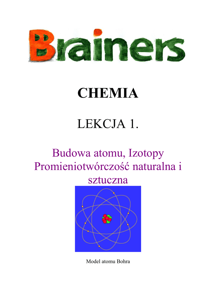 CHEMIA LEKCJA 1. Budowa atomu, Izotopy Promieniotwórczość naturalna i sztuczna Model atomu Bohra SPIS TREŚCI: 1. 2. 3. 4. 5. 6. 7. 8. 9. Modele budowy atomu Thomsona, Rutherforda i Bohra Budowa atomu Liczba atomowa a liczba masowa (przykład zadania) Izotopy Ustalenie masy atomowej danego pierwiastka na podstawie procentowej zawartości izotopów (przykład zadania) Konfiguracja elektronowa (zakaz Pauliego i reguła Hunda) Promieniotwórczość naturalna i sztuczna (przemiana α, β i γ) Okres półtrwania (przykład zadania) Zadania do rozwiązania 1. Modele budowy atomu Thomsona, Rutherforda i Bohra a) Model budowy atomu według Thomsona (1906) 1. model ciasta z rodzynkami 2. atom to kula o promieniu 10-10 m naładowana dodatnim ładunkiem elektrycznym 3. wewnątrz tej kuli rozmieszczone są elektrony (są one ulokowane jak rodzynki w cieście) 4. atom jako całość jest elektrycznie obojętny (dodatni ładunek obojętnego atomu równy jest ujemnemu ładunkowi wszystkich jego elektronów) b) Model budowy atomu według Rutherforda (1911) 1. model planetarny budowy atomu (można go porównać do budowy Układu Słonecznego, gdzie Słońce to jądro atomowe, a planety wokół niego krążące to elektrony) 2. atom składa się z jądra i powłoki elektronowej 3. jądro o ładunku dodatnim skupia w sobie prawie całą masę atomu 4. dookoła jądra po zamkniętych orbitach krążą elektrony tworząc powłokę elektronowa atomu 5. atom jest elektrycznie obojętny (dodatni ładunek obojętnego atomu równy jest ujemnemu ładunkowi wszystkich jego elektronów) 6. jest to model dynamiczny budowy atomu, ponieważ elektrony są w ciągłym ruchu, w przeciwnym wypadku zostałby przyciągnięte przez jądro wskutek działania sił kulombowskich c) Model budowy atomu według Bohra (1913) 1. uzupełnienie teorii Rutherforda 2. postulaty Bohra (dotyczące atomu wodoru) elektron w atomie wodoru porusza się po orbicie kołowej dokoła jądra pod wpływem siły kulombowskiej dozwolone są takie orbity dla których moment pędu krążącego elektronu równy całkowitej wielokrotności stałej Plancka h podzielonej przez 2π elektron poruszający się po dozwolonej orbicie nie wypromieniowuje energii elektromagnetycznej – emisja lub absorpcja promieniowania występuje przy przejściu elektronu z jednej orbity na inną 2. Budowa atomu Atom składa się z jądra atomowego i elektronów, które krążą wokół niego. W skład jądra atomowego wchodzą protony i neutrony, które mają wspólną nazwę – NUKLEONÓW. Natomiast elektrony można podzielić na niewalencyjne, które wraz z jądrem atomowym tworzą ZRĄB ATOMOWY oraz walencyjne, które leżą na ostatniej powłoce atomu i biorą udział w reakcji chemicznej. protony JĄDRO ATOMOWE neutrony ATOM CHMURA ELEKTRONOWA elektrony posiadają ładunek dodatni oznaczane literą p masa 1,674 × 10-27 kg (1,0073 u) nie posiadają ładunku oznaczane literą n masa 1,675 × 10-27 kg (1,0087 u) posiadają ładunek ujemny oznaczane literą e masa jest 1836 razy mniejsza od masy protonu i wynosi około 0,00055 u 3. Liczba atomowa a liczba masowa LICZBA ATOMOWA (Z) – liczba określająca ilość protonów w jądrze atomu, jest ona charakterystyczna i stała dla danego pierwiastka. LICZBA MASOWA (A) – liczba stanowiąca sumę protonów i neutronów (nukleony) w jądrze. liczba protonów = Z liczba elektronów = Z, bo atom jest elektrycznie obojętny liczba neutronów = A - Z Ogólny symbol pierwiastka z zaznaczeniem liczby atomowej i masowej Izotop chloru zawiera: • 17 protonów • 17 elektronów • 18 neutronów Zadanie Podaj skład jądra atomowego oraz ilość elektronów, które występują w podanym izotopie: > Liczba protonów jest równa liczbie atomowej (Z) i wynosi 6. > Liczba elektronów jest równa liczbie protonów, ponieważ atom jest elektrycznie obojętny i wynosi 6. > Liczba neutronów jest równa różnicy liczby masowej i atomowej i wynosi 12 - 6 = 6 4. Izotopy IZOTOPY – są to atomy tego samego pierwiastka różniące się liczba neutronów w jądrze. Izotopy wodoru: Izotop Liczba Liczba Liczba wodoru protonów neutronów elektronów Prot 1 0 1 Deuter 1 1 1 Tryt 1 2 1 Czy wiesz, że chrom posiada 13 izotopów, od 45Cr do 57Cr, z czego trwałe są izotopy 50, 52, 53 i 54. 5. Ustalenie masy atomowej danego pierwiastka na podstawie procentowej zawartości izotopów Wzór na obliczenie masy atomowej danego pierwiastka: Ar – masa atomowa danego pierwiastka %n – procentowa zawartość danego izotopu An – liczba masowa danego izotopu pierwiastka Zadanie Tlen występuje w 8 izotopach w przyrodzie, a najważniejsze z nich to 16O (99,759 %), 17O (0,037 %) i 18O (0,204 %). Oblicz masę atomową tlenu. Ma = 99,759 % × 16 u / 100% + 0,037 % × 17 u / 100% + 0,204 % × 18 u / 100% = 15,96144 + 0,00629 + 0,03672 = 16,00445 u Odp. Masa atomowa tlenu wynosi 16,00445 u. 6. Konfiguracja elektronowa Konfiguracja elektronowa to przyporządkowanie elektronów w atomie określonym stanom kwantowym za pomocą liczb kwantowych. Dla atomu azotu wygląda to następująco: N 1s2 2s2 2p3 11 pełna konfiguracja elektronowa [He] 2s2 2p3 skrócona konfiguracja elektronowa (z gazem szlachetnym) konfiguracja elektronowa w systemie klatkowym Schemat obsadzania elektronami poszczególnych stanów kwantowych w przypadku atomu wieloelektronowego: ZAKAZ PAULIEGO W atomie wieloelektronowym dwa elektrony nie mogą być w stanach o takich samych wartościach wszystkich liczb kwantowych. REGUŁA HUNDA Najkorzystniejsze energetycznie jest takie zapełnianie poziomów energetycznych tak by liczba niesparowanych elektronów w obrębie danej powłoki była największa. Według schematu obsadzania elektronami poszczególnych stanów kwantowych w przypadku atomu wieloelektrodowego najpierw obsadzamy orbitalne w kolejności 1s 2s 2p 3s 3p 4s 3d 4p 5s 4d 5p 6s 4f 5d 6p 7s 5f 6d 7p. Zakaz Pauliego mówi nam o tym, że nie mogą istnieć dwa elektrony o tych samych warto