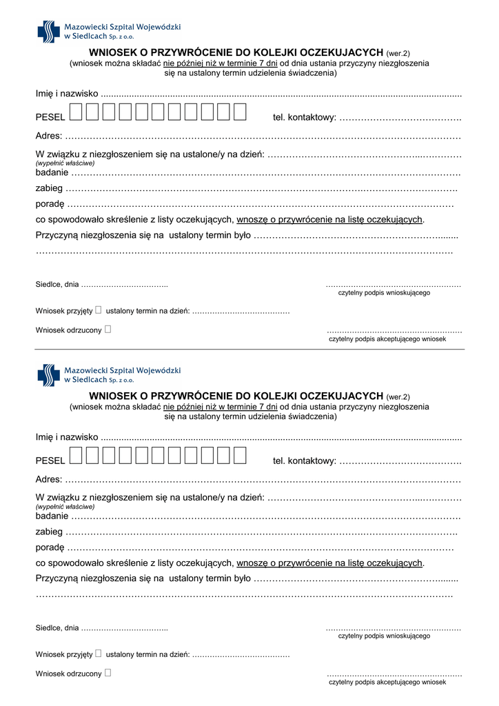 WNIOSEK O PRZYWRÓCENIE DO KOLEJKI OCZEKUJACYCH (wer.2) (wniosek można składać nie później niż w terminie 7 dni od dnia ustania przyczyny niezgłoszenia się na ustalony termin udzielenia świadczenia) Imię i nazwisko ............................................................................................................................................. PESEL tel. kontaktowy: …………………………………. Adres: ………………………………………………………………………………………………………………… W związku z niezgłoszeniem się na ustalone/y na dzień: …………………………………………...….……… (wypełnić właściwe) badanie ………………………………………………………………………………………………………………. zabieg …………………………………………………………………………………….…………………………. poradę ……………………………………………………………………………………………………………… co spowodowało skreślenie z listy oczekujących, wnoszę o przywrócenie na listę oczekujących. Przyczyną niezgłoszenia się na ustalony termin było ……………………………………………………........ ………………………………………………………………………………………………………………………. Siedlce, dnia …………………………….. ……………………………………………… czytelny podpis wnioskującego Wniosek przyjęty ustalony termin na dzień: ………………………………… Wniosek odrzucony ……………………………………………… czytelny podpis akceptującego wniosek WNIOSEK O PRZYWRÓCENIE DO KOLEJKI OCZEKUJACYCH (wer.2) (wniosek można składać nie później niż w terminie 7 dni od dnia ustania przyczyny niezgłoszenia się na ustalony termin udzielenia świadczenia) Imię i nazwisko ............................................................................................................................................. PESEL tel. kontaktowy: …………………………………. Adres: ………………………………………………………………………………………………………………… W związku z niezgłoszeniem się na ustalone/y na dzień: …………………………………………...….……… (wypełnić właściwe) badanie ………………………………………………………………………………………………………………. zabieg …………………………………………………………………………………….…………………………. poradę ……………………………………………………………………………………………………………… co spowodowało skreślenie z listy oczekujących, wnoszę o przywrócenie na listę oczekujących. Przyczyną niezgłoszenia się na ustalony termin było ……………………………………………………........ ………………………………………………………………………………………………………………………. Siedlce, dnia …………………………….. ……………………………………………… czytelny podpis wnioskującego Wniosek przyjęty Wniosek odrzucony ustalony termin na dzień: ………………………………… ……………………………………………… czytelny podpis akceptującego wniosek