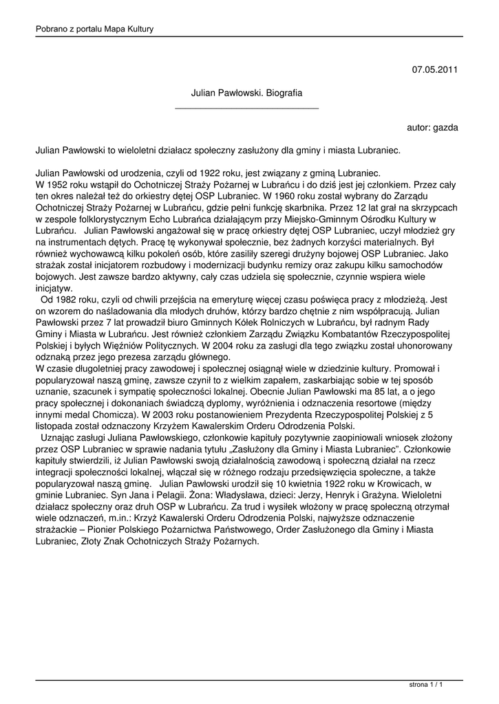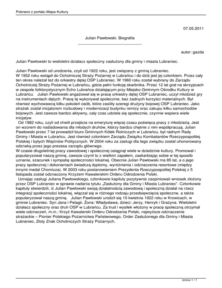 Pobrano z portalu Mapa Kultury 07.05.2011 Julian Pawłowski. Biografia ____________________________ autor: gazda Julian Pawłowski to wieloletni działacz społeczny zasłużony dla gminy i miasta Lubraniec. Julian Pawłowski od urodzenia, czyli od 1922 roku, jest związany z gminą Lubraniec. W 1952 roku wstąpił do Ochotniczej Straży Pożarnej w Lubrańcu i do dziś jest jej członkiem. Przez cały ten okres należał też do orkiestry dętej OSP Lubraniec. W 1960 roku został wybrany do Zarządu Ochotniczej Straży Pożarnej w Lubrańcu, gdzie pełni funkcję skarbnika. Przez 12 lat grał na skrzypcach w zespole folklorystycznym Echo Lubrańca działającym przy Miejsko-Gminnym Ośrodku Kultury w Lubrańcu. Julian Pawłowski angażował się w pracę orkiestry dętej OSP Lubraniec, uczył młodzież gry na instrumentach dętych. Pracę tę wykonywał społecznie, bez żadnych korzyści materialnych. Był również wychowawcą kilku pokoleń osób, które zasiliły szeregi drużyny bojowej OSP Lubraniec. Jako strażak został inicjatorem rozbudowy i modernizacji budynku remizy oraz zakupu kilku samochodów bojowych. Jest zawsze bardzo aktywny, cały czas udziela się społecznie, czynnie wspiera wiele inicjatyw. Od 1982 roku, czyli od chwili przejścia na emeryturę więcej czasu poświęca pracy z młodzieżą. Jest on wzorem do naśladowania dla młodych druhów, którzy bardzo chętnie z nim współpracują. Julian Pawłowski przez 7 lat prowadził biuro Gminnych Kółek Rolniczych w Lubrańcu, był radnym Rady Gminy i Miasta w Lubrańcu. Jest również członkiem Zarządu Związku Kombatantów Rzeczypospolitej Polskiej i byłych Więźniów Politycznych. W 2004 roku za zasługi dla tego związku został uhonorowany odznaką przez jego prezesa zarządu głównego. W czasie długoletniej pracy zawodowej i społecznej osiągnął wiele w dziedzinie kultury. Promował i popularyzował naszą gminę, zawsze czynił to z wielkim zapałem, zaskarbiając sobie w tej sposób uznanie, szacunek i sympatię społeczności lokalnej. Obecnie Julian Pawłowski ma 85 lat, a o jego pracy społecznej i dokonaniach świadczą dyplomy, wyróżnienia i odznaczenia resortowe (między innymi medal Chomicza). W 2003 roku postanowieniem Prezydenta Rzeczypospolitej Polskiej z 5 listopada został odznaczony Krzyżem Kawalerskim Orderu Odrodzenia Polski. Uznając zasługi Juliana Pawłowskiego, członkowie kapituły pozytywnie zaopiniowali wniosek złożony przez OSP Lubraniec w sprawie nadania tytułu „Zasłużony dla Gminy i Miasta Lubraniec”. Członkowie kapituły stwierdzili, iż Julian Pawłowski swoją działalnością zawodową i społeczną działał na rzecz integracji społeczności lokalnej, włączał się w różnego rodzaju przedsięwzięcia społeczne, a także popularyzował naszą gminę. Julian Pawłowski urodził się 10 kwietnia 1922 roku w Krowicach, w gminie Lubraniec. Syn Jana i Pelagii. Żona: Władysława, dzieci: Jerzy, Henryk i Grażyna. Wieloletni działacz społeczny oraz druh OSP w Lubrańcu. Za trud i wysiłek włożony w pracę społeczną otrzymał wiele odznaczeń, m.in.: Krzyż Kawalerski Orderu Odrodzenia Polski, najwyższe odznaczenie strażackie – Pionier Polskiego Pożarnictwa Państwowego, Order Zasłużonego dla Gminy i Miasta Lubraniec, Złoty Znak Ochotniczych Straży Pożarnych. strona 1 / 1