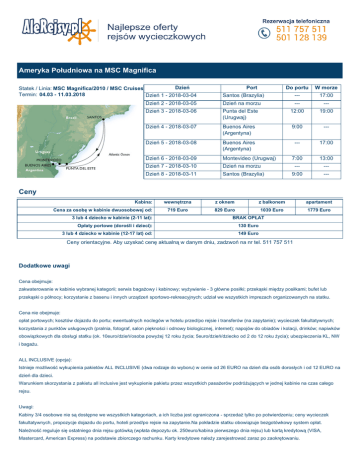 Ameryka Południowa na MSC Magnifica Dzień Statek / Linia: MSC Magnifica/2010 / MSC Cruises Termin: 04.03 - 11.03.2018 Dzień 1 - 2018-03-04 Port Do portu W morze --- 17:00 Santos (Brazylia) Dzień 2 - 2018-03-05 Dzień na morzu --- --- Dzień 3 - 2018-03-06 Punta del Este (Urugwaj) 12:00 19:00 Dzień 4 - 2018-03-07 Buenos Aires (Argentyna) 9:00 --- Dzień 5 - 2018-03-08 Buenos Aires (Argentyna) --- 17:00 Dzień 6 - 2018-03-09 Montevideo (Urugwaj) 7:00 13:00 Dzień 7 - 2018-03-10 Dzień na morzu --- --- Dzień 8 - 2018-03-11 Santos (Brazylia) 9:00 --- Ceny Kabina: Cena za osobę w kabinie dwuosobowej od: 3 lub 4 dziecko w kabinie (2-11 lat): wewnętrzna z oknem z balkonem apartament 719 Euro 829 Euro 1039 Euro 1779 Euro BRAK OPŁAT Opłaty portowe (dorośli i dzieci): 130 Euro 3 lub 4 dziecko w kabinie (12-17 lat) od: 149 Euro Ceny orientacyjne. Aby uzyskać cenę aktualną w danym dniu, zadzwoń na nr tel. 511 757 511 Dodatkowe uwagi Cena obejmuje: zakwaterowanie w kabinie wybranej kategorii; serwis bagażowy i kabinowy; wyżywienie - 3 główne posiłki; przekąski między posiłkami; bufet lub przekąski o północy; korzystanie z basenu i innych urządzeń sportowo-rekreacyjnych; udział we wszystkich imprezach organizowanych na statku. Cena nie obejmuje: opłat portowych; kosztów dojazdu do portu; ewentualnych noclegów w hotelu przed/po rejsie i transferów (na zapytanie); wycieczek fakultatywnych; korzystania z punktów usługowych (pralnia, fotograf, salon piękności i odnowy biologicznej, internet); napojów do obiadów i kolacji, drinków; napiwków obowiązkowych dla obsługi statku (ok. 10euro/dzień/osoba powyżej 12 roku życia; 5euro/dzień/dziecko od 2 do 12 roku życia); ubezpieczenia KL, NW i bagażu. ALL INCLUSIVE (opcja): Istnieje możliwość wykupienia pakietów ALL INCLUSIVE (dwa rodzaje do wyboru) w cenie od 26 EURO na dzień dla osób dorosłych i od 12 EURO na dzień dla dzieci. Warunkiem skorzystania z pakietu all inclusive jest wykupienie pakietu przez wszystkich pasażerów podróżujących w jednej kabinie na czas całego rejsu. Uwagi: Kabiny 3/4 osobowe nie są dostępne we wszystkich kategoriach, a ich liczba jest ograniczona - sprzedaż tylko po potwierdzeniu; ceny wycieczek fakultatywnych, propozycje dojazdu do portu, hoteli przed/po rejsie na zapytanie.Na pokładzie statku obowiązuje bezgotówkowy system opłat. Należność reguluje się ostatniego dnia rejsu gotówką (wpłata depozytu ok. 250euro/kabina pierwszego dnia rejsu) lub kartą kredytową (VISA, Mastercard, American Express) na podstawie zbiorczego rachunku. Karty kredytowe należy zarejestrować zaraz po zaokrętowaniu. MSC Magnifica/2010 MSC Magnifica Tonaż: 93.000 ton Długość: 294 m Szerokość: 32 m Szybkość: 23 węzły Pokłady pasażerskie: 13 Załoga: 1027 Pasażerowie: 2500 (do 3013) Basen: 5 Waluta: EURO Rodzaje kabin Inside Cabins - to kabiny wewnętrzne, których metraż wynosi 14 m2. Na życzenie klientów dwa pojedyncze łóżka mogą zostać połączone w jedno duże, za wyjątkiem kabin dla pasażerów niepełnosprawnych. W kabinach znajduje się telewizor, telefon, sejf, oraz mini bar. Łazienki wyposażone są w umywalkę, prysznic, WC oraz suszarkę do włosów. Pomieszczenia są klimatyzowane. Istnieje możliwość podłączenia w kabinie do internetu przy użyciu własnego laptopa (usługa płatna). Kabiny są dostosowane do potrzeb osób niepełnosprawnych. Outside Cabins - to kabiny wielkości 17,8 m2 posiadające okno. Wyposażone są w dwa pojedyncze łóżka, które na życzenie klientów mogą zostać połączone w jedno duże. W kabinach znajduje się telewizor, telefon, sejf, oraz mini bar. Łazienki posiadają umywalkę, prysznic, WC oraz suszarkę do włosów. Pomieszczenia są klimatyzowane. Istnieje możliwość podłączenia w kabinie do internetu przy użyciu własnego laptopa (usługa płatna). Kabiny są dostosowane do potrzeb osób niepełnosprawnych. Outside Cabins with Balcony - to kabiny wielkości 17,8 m2 z prywatnym balkonem. Na ich wyposażeniu znajdują się dwa pojedyncze łóżka, które na życzenie klientów mogą zostać połączone w jedno duże. Klienci mają do swojej dyspozycji telewizor, telefon oraz mini bar. Łazienki wyposażone są w umywalkę, prysznic, WC oraz suszarkę do włosów. Pomieszczenia są klimatyzowane. Istnieje możliwość podłączenia w kabinie do internetu przy użyciu własnego laptopa (usługa płatna). Kabiny te dostosowane są także dla potrzeb osób niepełnosprawnych. W przypadku kabin przeznaczonych dla osób niepełnosprawnych dostępne są jedynie dwa pojedyncze łóżka. Suites with Balcony - to wygodne apartamenty o powierzchni 25 m2 z prywatnym balkonem. Składają się z sypialni z podwójnym łóżkiem z możliwością rozłączenia na 2 oddzielne łóżka i części wypoczynkowej. Ponadto w apartamencie mieści się przestronna szafa, sejf, mini bar, telewizor i telefon. Łazienka wyposażona jest w umywalkę, wannę, WC oraz suszarkę do włosów. Pomieszczenia są klimatyzowane. Istnieje możliwość podłączenia w kabinie do internetu przy użyciu własnego laptopa (usługa płatna).