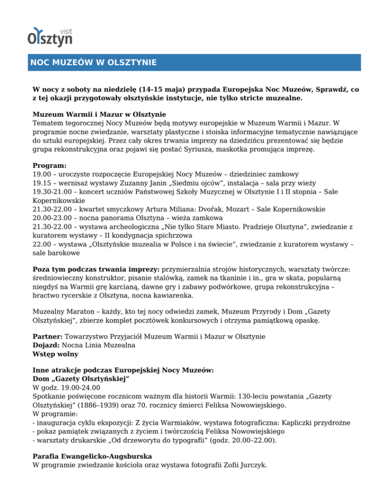 NOC MUZEÓW W OLSZTYNIE W nocy z soboty na niedzielę (14-15 maja) przypada Europejska Noc Muzeów, Sprawdź, co z tej okazji przygotowały olsztyńskie instytucje, nie tylko stricte muzealne. Muzeum Warmii i Mazur w Olsztynie Tematem tegorocznej Nocy Muzeów będą motywy europejskie w Muzeum Warmii i Mazur. W programie nocne zwiedzanie, warsztaty plastyczne i stoiska informacyjne tematycznie nawiązujące do sztuki europejskiej. Przez cały okres trwania imprezy na dziedzińcu prezentować się będzie grupa rekonstrukcyjna oraz pojawi się postać Syriusza, maskotka promująca imprezę. Program: 19.00 – uroczyste rozpoczęcie Europejskiej Nocy Muzeów – dziedziniec zamkowy 19.15 – wernisaż wystawy Zuzanny Janin „Siedmiu ojców”, instalacja – sala przy wieży 19.30-21.00 – koncert uczniów Państwowej Szkoły Muzycznej w Olsztynie I i II stopnia – Sale Kopernikowskie 21.30-22.00 – kwartet smyczkowy Artura Miliana: Dvořak, Mozart – Sale Kopernikowskie 20.00-23.00 – nocna panorama Olsztyna – wieża zamkowa 21.30-22.00 – wystawa archeologiczna „Nie tylko Stare Miasto. Pradzieje Olsztyna”, zwiedzanie z kuratorem wystawy – II kondygnacja spichrzowa 22.00 – wystawa „Olsztyńskie muzealia w Polsce i na świecie”, zwiedzanie z kuratorem wystawy – sale barokowe Poza tym podczas trwania imprezy: przymierzalnia strojów historycznych, warsztaty twórcze: średniowieczny konstruktor, pisanie stalówką, zamek na tkaninie i in., gra w skata, popularną niegdyś na Warmii grę karcianą, dawne gry i zabawy podwórkowe, grupa rekonstrukcyjna – bractwo rycerskie z Olsztyna, nocna kawiarenka. Muzealny Maraton – każdy, kto tej nocy odwiedzi zamek, Muzeum Przyrody i Dom „Gazety Olsztyńskiej”, zbierze komplet pocztówek konkursowych i otrzyma pamiątkową opaskę. Partner: Towarzystwo Przyjaciół Muzeum Warmii i Mazur w Olsztynie Dojazd: Nocna Linia Muzealna Wstęp wolny Inne atrakcje podczas Europejskiej Nocy Muzeów: Dom „Gazety Olsztyńskiej” W godz. 19.00-24.00 Spotkanie poświęcone rocznicom ważnym dla historii Warmii: 130-leciu powstania „Gazety Olsztyńskiej” (1886–1939) oraz 70. rocznicy śmierci Feliksa Nowowiejskiego. W programie: - inauguracja cyklu ekspozycji: Z życia Warmiaków, wystawa fotograficzna: Kapliczki przydrożne - pokaz pamiątek związanych z życiem i twórczością Feliksa Nowowiejskiego - warsztaty drukarskie „Od drzeworytu do typografii” (godz. 20.00–22.00). Parafia Ewangelicko-Augsburska W programie zwiedzanie kościoła oraz wystawa fotografii Zofii Jurczyk. Muzeum Nowoczesności W programie: fascynujące eksperymenty naukowe, doświadczenia z wodą i promieniowaniem, niesamowite zjawiska fizyczne, bliższe spotkania z kauczukiem, druk 3D i roboty. Olsztyńska Galeria Sztuki W godz. 17.00-22.00 W programie wystawa prof. Ludwika Maciąga „Za oknem jest pejzaż” BWA Galeria Sztuki W godz. 18.00-24.00 W programie: Kiermasz wydawnictw BWA Spotkanie z Krzysztofem Millerem, godz. 18.00 Pokaz krótkometrażowego filmu dokumentalnego – „W oku Boga” (2012) Koncert: Maciek Szymczuk (AABZU), godz. 20.00 (pod kopułą Planetarium) Zwiedzanie aktualnych wystaw: Krzysztof Miller „Niedecydujący moment” (fotografia) Grzegorz Klaman „Fear and trembling / Bojaźń i drżenie” Planeta 11 W godz. 18.00-24.00 W programie: wypożyczalnia zbiorów, film, turniej PlayStation3 www.visit.olsztyn.eu