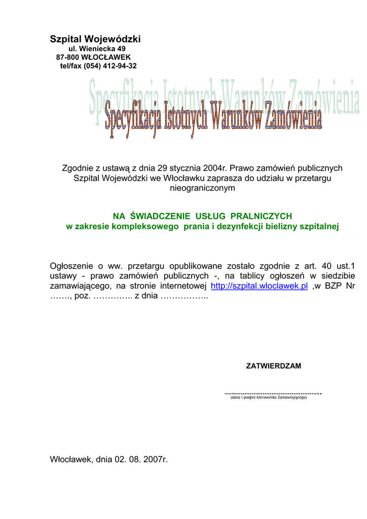 Szpital Wojewódzki ul. Wieniecka 49 87-800 WŁOCŁAWEK tel/fax (054) 412-94-32 Zgodnie z ustawą z dnia 29 stycznia 2004r. Prawo zamówień publicznych Szpital Wojewódzki we Włocławku zaprasza do udziału w przetargu nieograniczonym NA ŚWIADCZENIE USŁUG PRALNICZYCH w zakresie kompleksowego prania i dezynfekcji bielizny szpitalnej Ogłoszenie o ww. przetargu opublikowane zostało zgodnie z art. 40 ust.1 ustawy - prawo zamówień publicznych -, na tablicy ogłoszeń w siedzibie zamawiającego, na stronie internetowej http://szpital.wloclawek.pl ,w BZP Nr ……., poz. ………….. z dnia …………….. ZATWIERDZAM …………………………………………….. (data i podpis kierownika Zamawiającego) Włocławek, dnia 02. 08. 2007r. Spis treści : Str. Część I Rozdział I . Postanowienia ogólne ……………………………………………….………… 3 Rozdział II . Tryb postępowania przetargowego ………………………………………… 3 Rozdział III . Opis przedmiotu zamówienia ……………………………………….………… Termin wykonania zamówienia………………………………………………... Opis warunków udziału w postępowaniu oraz sposobu dokonywania oceny spełnienia tych warunków. …………………………………………… Wykaz oświadczeń i dokumentów jakie mają dostarczyć Wykonawcy w celu potwierdzenia spełnienia warunków udziału w postępowaniu…. Informacje o sposobie porozumiewania się Zamawiającego z Wykonawcami oraz przekazywania oświadczeń i dokumentów, a takŜe wykazanie osób uprawnionych do porozumiewania się z Wykonawcami Informacje dotyczące wadium 3 Rozdział IV . Rozdział V . Rozdział VI . Rozdział VII . Rozdział VIII . Rozdział IX . Rozdział X. Rozdział XI . Rozdział X II. Rozdział X III. 5 5 6 7 7 Termin związania ofertą………………………………………………………… Opis sposobu przygotowania oferty …………………………….…………. 8 Miejsce oraz termin składania i otwarcia ofert……………………………... Opis sposobu obliczenia ceny ……………………………………………….. Opis kryteriów, którymi Zamawiający będzie się kierował przy wyborze oferty wraz z podaniem znaczenia tych kryteriów i sposobu oceny ofert………………………………………………………………………… 9 8 10 10 Rozdział X IV. Informacje o formalnościach jakie powinny zostać dopełnione po wyborze oferty w celu zawarcia umowy w sprawie zamówienia publicznego………………………………………………………………………. 11 Rozdział X V. Wymóg dotyczący zabezpieczenia naleŜytego wykonania umowy. …… Rozdział X VI. Rozdział X VII. Istotne dla stron postanowienia, które zostaną wprowadzone do treści zawartej umowy w sprawie zamówienia publicznego, ogólne warunki umowy. 11 ……………………………………………………………………………. Pouczenie o środkach ochrony prawnej przysługujących Wykonawcy w toku postępowania o udzielenie zamówienia…………………………… 18 11 Część II Rozdział I . Informacje pozostałe. …………………………………………………………. 18 Część III Rozdział I . Wykaz załączników. …………………………………………………………….. 18 2 CZEŚĆ I Rozdział I . Postanowienia ogólne . 1.W niniejszej Specyfikacji Istotnych Warunków Zamówienia oraz we wszystkich dokumentach z nią związanych ( jak niŜej określono) następujące słowa i zwroty winny mieć znaczenie zgodne z niniejszymi objaśnieniami z wyjątkiem przypadków , kiedy kontekst wymaga inaczej . a./ Prawo zamówień publicznych – ustawa z dnia 29 stycznia 2006r. Prawo zamówień publicznych (Dz. U. z 2006 Nr 164, poz. 1163 z późn. zm.) b./ Zamawiający - oznacza Szpital Wojewódzki we Włocławku , 87-800 Włocławek ,ul. Wieniecka 49, tel/fax . (054) 412-94-32, konto bankowe ( dla wpłaty wadium ):PKO BP SA Oddział Włocławek, konto nr 79 1020 5170 0000 1402 0006 1127, NIP: 888 – 24 – 34 -270, REGON: 910859070, KRS: 0000004686 znak postępowania: DIZ / 48 / 2007 Uwaga: w korespondencji kierowanej do Zamawiającego, dotyczącej niniejszego postępowania naleŜy się posługiwać wyłącznie tym znakiem. c./ Wykonawca - oznacza osobę fizyczną, osobę prawną albo jednostkę organizacyjną nie posiadającą osobowości prawnej, która ubiega się o udzielenie zamówienia publicznego, złoŜyła ofertę lub zawarła umowę w sprawie zamówienia publicznego d./ Oferta – oznacza pisemną ofertę wraz z zestawem wszystkich załączników, oświadczeń , wzorów dokumentów Ŝądanych przez Zamawiającego w niniejszej SIWZ , wypełnionych ściśle z ich wymaganiami i na warunkach tam określonych, wraz z wycenioną propozycją Wykonawcy realizacji Przedmiotu Zamówienia ,w wyniku przystąpienia do niniejszego postępowania o udzielenie zamówienia publicznego , f./ Specyfikacja Istotnych Warunków Zamówienia (SIWZ)- oznacza niniejszy dokument oraz wszelkie załączniki , wzory , formularze i inne dokumenty stanowiące jego integralną część, g./ Przedmiot Zamówienia – oznacza kompleksowe pranie i dezynfekcję bielizny szpitalnej. h./ Cena brutto – wartość wyraŜona w jednostkach pienięŜnych, którą kupujący jest obowiązany zapłacić przedsiębiorcy za towar lub usługę; w cenie uwzględnia się podatek od towarów i usług oraz podatek akcyzowy, jeŜeli na podstawie odrębnych przepisów sprzedaŜ towaru (usługi) podlega obciąŜeniu podatkiem od towarów i usług oraz podatkiem akcyzowym, i./ dzień - oznacza dzień kalendarzowy , j./ pisemnie - oznacza wszelkie pismo ręczne , maszynowe lub przy uŜyciu sprzętu komputerowego z własnoręcznym podpisem Wykonawcy i jego pieczęcią firmową , k./ Umowa – oznacza wzór umowy określony w Załączniku nr 5, 2