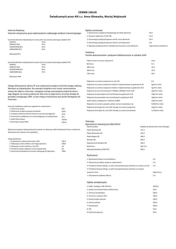 CENNIK USŁUG Świadczonych przez 4IX s.c. Anna Głowacka, Maciej Wojtaszek Internet Radiowy Internet stacjonarny przy wykorzystaniu radiowego medium transmisyjnego: Cennik dla klientów indywidualnych umowa 24m Ceny brutto zawierające podatek VAT. Szybkość Cena 2048/512 Kb/s 49 zł 102400/2048 Kb/s 59 zł 16384/4096 Kb/s 69 zł Opłaty serwisowe: 1. Dostarczenie urządzenia dostępowego do lokalu abonenta 50 zł 2. Strojenie odbiornika TV lub STB- 35 zł 3. Konserwacja przyłącza/naprawa usterki z winy Abonenta- 50 zł 4. Konserwacja przyłącza/naprawa usterki z winy Operatora 0 zł 5. Naprawa przyłącza/usterki uszkodzenie/zniszczenie z winy Abonenta w/g kosztów uszkodzenia Telefonia Cennik abonamentów i połączeń telefonicznych w usłudze VoIP: Aktywacja 99 zł Cennik dla klientów indywidualnych umowa 12m Ceny brutto zawierające podatek VAT. Szybkość Cena 2048/512 Kb/s 59 zł 102400/2048 Kb/s 69 zł 16384/4096 Kb/s 79 zł Pakiet minut na numery stacjonarne Cena 80 minut 9 zł 200 minut 19 zł 360 minut 29 zł 720 minut 49 zł Połączenia na numery stacjonarne w sieci 4IX 0 zł Połączenia na numery stacjonarne lokalne i międzymiastowe w godzinach 8-18 9gr/min netto Połączenia na numery stacjonarne lokalne i międzymiastowe w godzinach 18-8 5gr/min netto Połączenia do sieci komórkowych T-MOBILE, ORANGE, PLUS, PLAY 23gr/min netto Połączenia do pozostałych sieci komórkowych w godzinach 8-18 75gr/min netto Połączenia do pozostałych sieci komórkowych w godzinach 18-8 70gr/min netto Jeden impuls za połączenia z infolinią np 0801- 27gr/min netto Połączenia na numery specjalne, płatne numery rozrywkowe, itp 9,99zł/min netto Połączenia do krajów UE, oraz USA i Kanady na numery stacjonarne 15gr/min netto Połączenia do krajów UE, oraz USA i Kanady na numery komórkowe- 1,27zł/min netto Aktywacja 149zł Usługa aktywowania adresu IP oraz wykonania przyłącza Internetu drogą radiową. Montaże są indywidualne. Na zewnątrz budynku musi zostać zamontowana antena do odbioru Internetu, następnie zostaje wprowadzony kabel do domu. Jego długość nie może przekraczać 10m oraz na jego końcu musi być dostęp do gniazdka zasilającego 230V. w tym miejscu montowany jest punkt dostępowy do Internetu. Czynności dodatkowe, płatne po uzgodnieniu z abonentem: 1. Techniczna wizyta 2. Wykonanie przyłącza powyżej standardu3. Instalacja telefoniczna/internetowa na tej samej kondygnacji 50zł 5zł/m 30 zł 4. Przeniesienie podłączenia na inną kondygnację, za każdy poziom 30 z 5. Kabel Ethernetowy 3zł/mb 6. Zaciśnięcie wtyczki RJ45 5zł/szt Wykonanie przyłącza wdług powyższych opisów nie obejmuje robót budowlanych (kucia, malowania, demontażu szaf i boazerii oraz wykopów). Usługi dodatkowe: 1. Użytkowanie modemu/terminala z WiFi 2. Aktywacja numeru telefonu od innego operatora 3. Aktywacja numeru telefonu z sieci 4IX 4. Przesłanie wykazu połączeń w wersji papierowej5. Zniszczenie/uszkodzenie terminalu należącego do Operatora 100 zł 100zł 1zł 5zł 700zł Telewizja Operatorem telewizji jest MetroPort Pakiet kanałów Dopłata do abonamentu internetowego Pakiet Startowy HD +37 zł Pakiet Optymalny HD +64 zł Pakiet Bogaty HD +80 zł Dekoder HD 300 zł Wypożyczenie dekodera SD 100 zł Multiroom 10zł /m-c Aktywacja dekodera (STB IPTV) 100 zł Rozliczenia 1. Wystawienie faktury oraz ekoFaktury 0 zł 2. Wezwanie do zapłaty związane z płatnościami 5 zł 3. Przesłanie listowne bilingu, na adres korespondencyjny określony w umowie, do 3str 5 zł 4. Przesłanie listowne bilingu, na adres korespondencyjny określony w umowie, powyżej 3 stron 62gr/strona 5. Wystawienie duplikatu faktury 5 zł Opłaty windykacyjne 1. Kable- zasilające, USB, Ethernet 20zł/szt. 2. Zasilacz terminala/modemu/PoE/routera 50 zł 3. Terminal standardowy 500 zł 4. Terminal z routerem WiFi 700 zł 5. Router/modem kliencki 100 zł 6. Antena radiowa 100 zł 7. Routerboard 400 zł 8. PoE 50 zł 9. Patchcord optyczny 30 zł