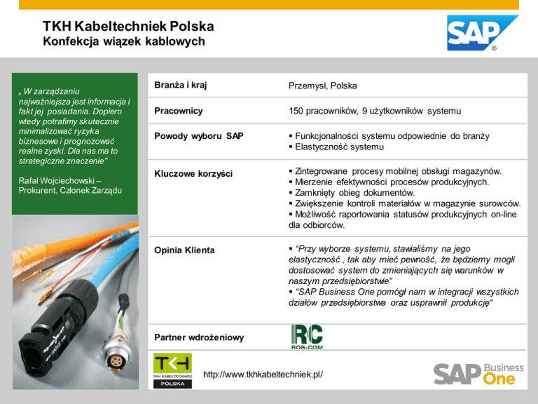 TKH Kabeltechniek Polska Konfekcja wiązek kablowych „ W zarządzaniu najważniejsza jest informacja i fakt jej posiadania. Dopiero wtedy potrafimy skutecznie minimalizować ryzyka biznesowe i prognozować realne zyski. Dla nas ma to strategiczne znaczenie” Rafał Wojciechowski – Prokurent, Członek Zarządu Branża i kraj Przemysł, Polska Pracownicy 150 pracowników, 9 użytkowników systemu Powody wyboru SAP  Funkcjonalności systemu odpowiednie do branży  Elastyczność systemu Kluczowe korzyści  Zintegrowane procesy mobilnej obsługi magazynów.  Mierzenie efektywności procesów produkcyjnych.  Zamknięty obieg dokumentów.  Zwiększenie kontroli materiałów w magazynie surowców.  Możliwość raportowania statusów produkcyjnych on-line dla odbiorców. Opinia Klienta  “Przy wyborze systemu, stawialiśmy na jego elastyczność , tak aby mieć pewność, że będziemy mogli dostosować system do zmieniających się warunków w naszym przedsiębiorstwie”  “SAP Business One pomógł nam w integracji wszystkich działów przedsiębiorstwa oraz usprawnił produkcję“ Partner wdrożeniowy http://www.tkhkabeltechniek.pl/ © 2011 SAP AG. All rights reserved. 1