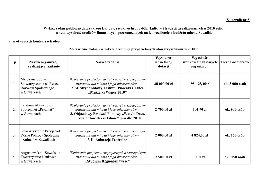 Załącznik nr 5. Wykaz zadań publicznych z zakresu kultury, sztuki