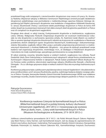 342 Kronika naukowa przedstawił krąg osób związanych z sieciechowskim skryptorium oraz owoce ich pracy. Ks. Anastazy Nadolny (Najstarsze rękopisy w Bibliotece Seminarium Pelplińskiego) omówił początki działalności skryptorium pelplińskiego oraz pochodzenie z meklemburskiego opactwa Doberan (którego dependencją był Pelplin) pierwszych skryptorów oraz kodeksów z księgozbioru biblioteki klasztornej. O. Janusz Zbudniewek (Twórcy i zachowane dzieła paulińskiego skryptorium w Polsce do końca XVII wieku) skupił się na prezentacji nieznanych lub słabo znanych dzieł skryptoriów paulińskich w Polsce oraz ich związkach ze skryptoriami węgierskimi. Drugiego dnia obrad, w sekcji trzeciej, Funkcjonowanie skryptoriów w średniowieczu, wygłoszono cztery referaty. Małgorzata Fiedurek (Organizacja skryptoriów we wczesnym średniowieczu) wskazała na rolę skryptoriów w zachowaniu spuścizny antyku. Ks. Kazimierz Łatak (Razem czy osobno? Głos w sprawie typologii skryptoriów klasztornych) odniósł się krytycznie do wydzielania w literaturze przedmiotu dwóch odrębnych typów skryptoriów klasztornych, kodeksowego i dokumentowego. Jolanta Marszalska wygłosiła referat Kilka uwag o potrzebie pragmatycznej piśmienności w średniowiecznych klasztorach, a Andrzej Wałkówski (Skryptoria – trzy grosze do dyskusji) przedstawił swoje badania nad organizacją skryptoriów, stwierdzając m.in., że działające w klasztorach skryptorium i kancelaria nie miały wydzielonego, specjalnego pomieszczenia na swoją działalność. W sekcji ostatniej, czwartej, Sylwetka kopisty w wiekach średnich, wygłoszono trzy referaty. Paweł Dudziński (Herb Ziemi Dobrzyńskiej w średniowiecznych rękopisach) ukazał formy przedstawiania na iluminacjach i blazonowania herbów w rękopisach. Patryk Szatan przedstawił referat Atrybucje Piotra Postawy wobec problemu rekonstrukcji zaginionego rękopisu Modlitewnika Nawojki, a Bartłomiej Dźwigała – Po co i dla kogo spisywano dzieje w wiekach średnich? Rzut oka na prologi średniowiecznych kronik. Konferencja połączona była z jubileuszem pięćdziesięciolecia święceń kapłańskich i dwudziestolecia pracy profesorskiej o. prof. Janusza Zbudniewka, paulina, wybitnego badacza dziejów swojego zakonu w Polsce i Europie, kierownika Katedry Historii Kościoła Średniowiecznego UKSW oraz redaktora naczelnego rocznika „Studia Claromontana”, poświęconego dziejom paulinów w Polsce i na świecie. Patrycja GĄSIOROWSKA Polski Słownik Biograficzny Instytut Historii PAN w Krakowie Konferencja naukowa Czterysta lat karmelitanek bosych w Polsce. Wkład karmelitanek bosych w polską historię, kulturę i duchowość (Uniwersytet Jagielloński, 28 V 2012 r.) i towarzysząca jej wystawa Mam ja skarb, mam... Cztery wieki karmelitanek bosych w Polsce (Muzeum Archeologiczne w Krakowie, 27 V–30 IX 2012 r.) Jubileusz czterechsetlecia sprowadzenia 26 V 1612 r. do Polski Mniszek Bosych Zakonu Najświętszej Marii Panny z Góry Karmel, czyli karmelitanek bosych, stał się okazją do zaprezentowania ich historii oraz kultury duchowej i materialnej. Pod auspicjami Katedry Historii Literatury Staropolskiej Wydziału Polonistyki UJ, Katedry Historii Zakonów KUL, Karmelitańskiego Instytutu Duchowości Kronika naukowa 343 w Krakowie, działającego w strukturach Papieskiego Wydziału Teologicznego „Teresianum” w Rzymie, oraz Wyższego Seminarium Duchownego Karmelitów Bosych w Krakowie, w Auli Collegium Novum UJ odbyło się jednodniowe sympozjum poświęcone dziejom i dorobkowi polskich karmelitanek. Otwarcia sympozjum dokonali: Jacek Popiel, dziekan Wydziału Polonistyki UJ, oraz o. Andrzej Ruszała OCD, prowincjał Krakowskiej Prowincji Karmelitów Bosych. Wystąpienia referentów zostały podzielone na dwa bloki tematyczne: przed południem dotyczyły historii zakonu, po południu spuścizny kulturowej i duchowej. Na wstępie obrad s. Małgorzata Borkowska OSB (Polski krajobraz zakonny w roku 1612) przedstawiła panoramę zgromadzeń żeńskich istniejących w granicach Rzeczypospolitej Obojga Narodów na początku XVII w., omawiając ich funkcjonowanie, podstawy prawne, ekonomiczne, obyczajowość i tradycje na tle sytuacji politycznej, religijnej i gospodarczej kraju. Najwięcej uwagi referentka poświęciła sprawie wprowadzanej w nich stopniowo reformy trydenckiej i związanego z tym zaostrzenia norm, szczególnie tych dotyczących klauzury oraz obserwancji. Wystąpienie o. Benignusa Józefa Wanata OCD (Zarys rozwoju klasztorów karmelitanek bosych w Rzeczpospolitej Obojga Narodów (1612–1782)) ukazało okoliczności fundacji oraz dalsze funkcjonowanie klasztorów bosaczek w Krakowie (fundacja w 1612 r., kościół klasztorny pw. św. św. Marcina i Józefa), Lublinie (1624 r., św. Józefa), Wilnie (1638 r., św. św. Józefa i Teresy z Ávila), Lwowie (1642 r., NMP Loretańskiej), drugiego w Lublinie (1645–1646 r., Niepokalanego Poczęcia NMP), Warszawie (1649 r., Ducha Świętego), Poznaniu (1665 r., Najświętszego Imienia NMP) i drugiego w Krakowie (1725 r., na Wesołej, św. św. Teresy od Jezusa i Jana od Krzyża). Początkowo należały one do Prowincji Świętego Ducha, grupującej wszystkie zakony karmelitańskie (męskie i żeńskie) na ziemiach Rzeczypospolitej Obojga Narodów. Gdy w 1734 r. powstała odrębna karmelitańska prowincja litewska św. Kazimierza, trafiły do niej klasztory w Wilnie oraz, na krótko, w Lublinie, Poznaniu i Warszawie. Kres istnieniu krakowskiego klasztoru (przy ul. Grodzkiej, 1787 r.) położył dekret biskupa Michała Jerzego Poniatowskiego, administratora diecezji krakowskiej, a we Lwowie i Lublinie – kasaty józefińskie. Losy pozostałych klasztorów polskich bosaczek w XIX i pierwszej połowie XX w. omówił o. Piotr Neumann OCD (Karmelitanki bose w dobie zaborów i w Polsce odrodzonej (1772–1939)). XIX-wieczne kasaty objęły klasztory w Warszawie (1819 r.), Poznaniu (1823 r.) i Wi