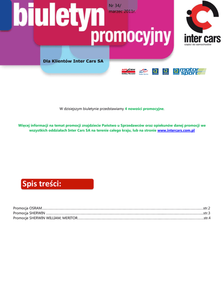 Nr 34/ marzec 2011r. Dla Klientów Inter Cars SA W dzisiejszym biuletynie przedstawiamy 4 nowości promocyjne. Więcej informacji na temat promocji znajdziecie Państwo u Sprzedawców oraz opiekunów danej promocji we wszystkich oddziałach Inter Cars SA na terenie całego kraju, lub na stronie www.intercars.com.pl Spis treści: Promocja OSRAM………………………………………………………………………………………………………………………….…………………..……………….str.2 Promocja SHERWIN …………………………..…………………………………………………….…………………………….…..………………………….…………..str.3 Promocje SHERWIN WILLIAM, MERITOR………………………………………………………………………………...………….………………….…………..str.4 OSRAM OSRAM Promocja trwa od 1 lutego br. do wyczerpania zapasów. Indeks: OSR510175 Kontakt: Małgorzata Tomczyk, tel.: 22 714 19 77, e-mail: [email protected] 2 SHERWIN SHERWIN Promocja trwa do 30 kwietnia br. Kontakt: Marcin Giersz, tel.: 22 714 10 41, e-mail: [email protected] 3 SHERWIN, MERITOR SHERWIN WILLIAM W dniach od 1 lutego do 30 kwietnia br. kupując produkty Sherwin Williams 6 najlepszych klientów otrzyma atrakcyjne narzędzia. MERITOR Promocja zaczyna się 1 kwietnia. Kupując produkty MERITOR i TRUCK TECHNIC możesz wygrać rejs po Morzu Śródziemnym… Więcej informacji już w kwietniowym biuletynie. Więcej informacji na temat promocji znajdziecie Państwo u Sprzedawców oraz opiekunów danej promocji we wszystkich oddziałach Inter Cars SA na terenie całego kraju, lub na stronie www.intercars.com.pl 4
