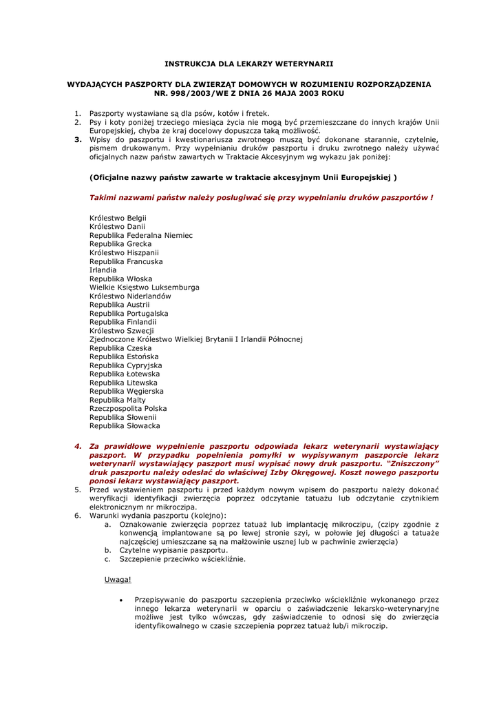 INSTRUKCJA DLA LEKARZY WETERYNARII WYDAJĄCYCH PASZPORTY DLA ZWIERZĄT DOMOWYCH W ROZUMIENIU ROZPORZĄDZENIA NR. 998/2003/WE Z DNIA 26 MAJA 2003 ROKU 1. 2. 3. Paszporty wystawiane są dla psów, kotów i fretek. Psy i koty poniżej trzeciego miesiąca życia nie mogą być przemieszczane do innych krajów Unii Europejskiej, chyba że kraj docelowy dopuszcza taką możliwość. Wpisy do paszportu i kwestionariusza zwrotnego muszą być dokonane starannie, czytelnie, pismem drukowanym. Przy wypełnianiu druków paszportu i druku zwrotnego należy używać oficjalnych nazw państw zawartych w Traktacie Akcesyjnym wg wykazu jak poniżej: (Oficjalne nazwy państw zawarte w traktacie akcesyjnym Unii Europejskiej ) Takimi nazwami państw należy posługiwać się przy wypełnianiu druków paszportów ! Królestwo Belgii Królestwo Danii Republika Federalna Niemiec Republika Grecka Królestwo Hiszpanii Republika Francuska Irlandia Republika Włoska Wielkie Księstwo Luksemburga Królestwo Niderlandów Republika Austrii Republika Portugalska Republika Finlandii Królestwo Szwecji Zjednoczone Królestwo Wielkiej Brytanii I Irlandii Północnej Republika Czeska Republika Estońska Republika Cypryjska Republika Łotewska Republika Litewska Republika Węgierska Republika Malty Rzeczpospolita Polska Republika Słowenii Republika Słowacka 4. 5. 6. Za prawidłowe wypełnienie paszportu odpowiada lekarz weterynarii wystawiający paszport. W przypadku popełnienia pomyłki w wypisywanym paszporcie lekarz weterynarii wystawiający paszport musi wypisać nowy druk paszportu. “Zniszczony” druk paszportu należy odesłać do właściwej Izby Okręgowej. Koszt nowego paszportu ponosi lekarz wystawiający paszport. Przed wystawieniem paszportu i przed każdym nowym wpisem do paszportu należy dokonać weryfikacji identyfikacji zwierzęcia poprzez odczytanie tatuażu lub odczytanie czytnikiem elektronicznym nr mikroczipa. Warunki wydania paszportu (kolejno): a. Oznakowanie zwierzęcia poprzez tatuaż lub implantację mikroczipu, (czipy zgodnie z konwencją implantowane są po lewej stronie szyi, w połowie jej długości a tatuaże najczęściej umieszczane są na małżowinie usznej lub w pachwinie zwierzęcia) b. Czytelne wypisanie paszportu. c. Szczepienie przeciwko wściekliźnie. Uwaga! Przepisywanie do paszportu szczepienia przeciwko wściekliźnie wykonanego przez innego lekarza weterynarii w oparciu o zaświadczenie lekarsko-weterynaryjne możliwe jest tylko wówczas, gdy zaświadczenie to odnosi się do zwierzęcia identyfikowalnego w czasie szczepienia poprzez tatuaż lub/i mikroczip. Obowiązkowemu ochronnemu szczepieniu przeciwko wściekliźnie podlegają psy powyżej 3 miesiąca życia. Jeżeli kraj docelowy UE nie wymaga badań serologicznych potwierdzających odpowiedni poziom przeciwciał, zwierzę można przewozić najwcześniej po upływie 21 dni od daty szczepienia przeciwko wściekliźnie i przed upływem terminu ważności szczepienia. 7. 8. 9. 10. 11. 12. 13. 14. Warunki wyjazdu zwierzęcia do Wielkiej Brytanii, Irlandii, Szwecji, Norwegii i na Maltę wymaga przeprowadzenia u zwierzęcia dodatkowego badania serologicznego krwi celem określenia poziomu przeciwciał neutralizujących wirus wścieklizny w laboratorium zatwierdzonym przez Unię Europejską. Dane z wyniku przepisuje się do działu V paszportu. Jeżeli zwierzę posiada lub wykonujemy inne szczepienia to fakt ten odnotowuje się w dziale VIII paszportu. Jeżeli zwierzę zostało poddane leczeniu lub profilaktyce wobec kleszczy dane te wpisuje się w dziale VI. Jeżeli zwierzę zostało poddane leczeniu i profilaktyce echinokokozy dane te wpisujemy w dziale VII. Dział IX i X są wypełniane w przypadku gdy zwierzę wyjeżdża do Irlandii, Wielkiej Brytanii, Szwecji i na Maltę oraz do kraju trzeciego (kraju spoza Unii Europejskiej). Wpisu w dziale IX i X dokonuje uprawniony lekarz weterynarii. Kwestionariusz zwrotny należy przesłać w ciągu 7 dni do Okręgowej Izby Lekarsko Weterynaryjnej, która wydała druk paszportu. Wystawiający paszport pobiera opłatę za wystawienie paszportu w wysokości 51 PLN brutto. Opłata za wydanie paszportu nie zawiera opłaty za oznakowanie zwierzęcia i za szczepienie przeciw wściekliźnie.