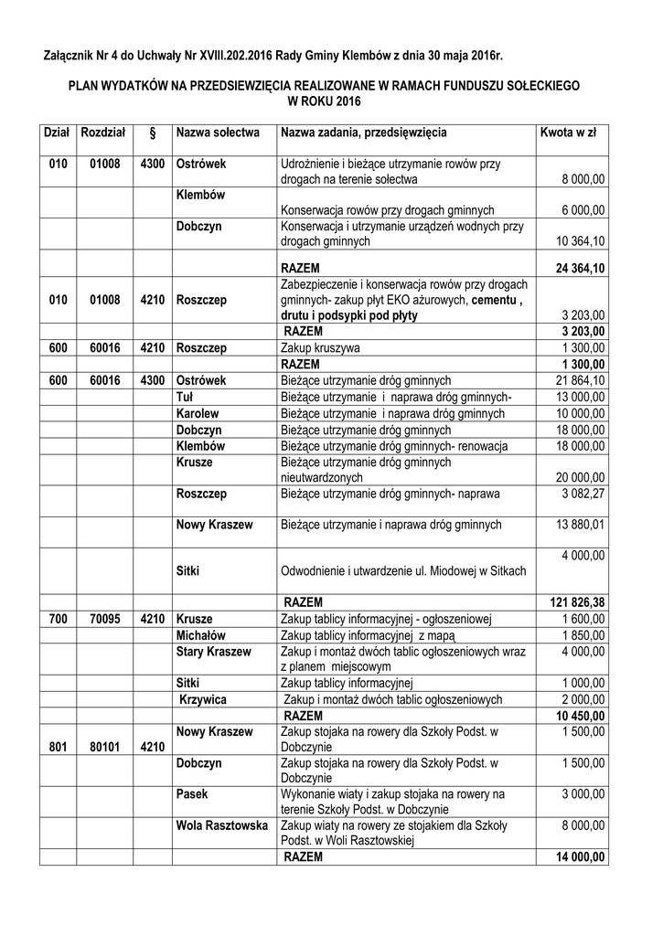 Załącznik Nr 4 do Uchwały Nr XVIII.202.2016 Rady Gminy Klembów z dnia 30 maja 2016r. PLAN WYDATKÓW NA PRZEDSIEWZIĘCIA REALIZOWANE W RAMACH FUNDUSZU SOŁECKIEGO W ROKU 2016 Dział Rozdział 010 01008 § Nazwa sołectwa 4300 Ostrówek Nazwa zadania, przedsięwzięcia Udrożnienie i bieżące utrzymanie rowów przy drogach na terenie sołectwa Kwota w zł 8 000,00 Klembów Dobczyn 010 01008 Konserwacja rowów przy drogach gminnych Konserwacja i utrzymanie urządzeń wodnych przy drogach gminnych 6 000,00 10 364,10 24 364,10 Roszczep RAZEM Zabezpieczenie i konserwacja rowów przy drogach gminnych- zakup płyt EKO ażurowych, cementu , drutu i podsypki pod płyty RAZEM Zakup kruszywa RAZEM Bieżące utrzymanie dróg gminnych Bieżące utrzymanie i naprawa dróg gminnychBieżące utrzymanie i naprawa dróg gminnych Bieżące utrzymanie dróg gminnych Bieżące utrzymanie dróg gminnych- renowacja Bieżące utrzymanie dróg gminnych nieutwardzonych Bieżące utrzymanie dróg gminnych- naprawa Nowy Kraszew Bieżące utrzymanie i naprawa dróg gminnych 13 880,01 4210 Roszczep 600 60016 4210 Roszczep 600 60016 4300 Ostrówek Tuł Karolew Dobczyn Klembów Krusze 3 203,00 3 203,00 1 300,00 1 300,00 21 864,10 13 000,00 10 000,00 18 000,00 18 000,00 20 000,00 3 082,27 4 000,00 Sitki 700 801 70095 80101 Odwodnienie i utwardzenie ul. Miodowej w Sitkach RAZEM 4210 Krusze Zakup tablicy informacyjnej - ogłoszeniowej Michałów Zakup tablicy informacyjnej z mapą Stary Kraszew Zakup i montaż dwóch tablic ogłoszeniowych wraz z planem miejscowym Sitki Zakup tablicy informacyjnej Krzywica Zakup i montaż dwóch tablic ogłoszeniowych RAZEM Nowy Kraszew Zakup stojaka na rowery dla Szkoły Podst. w 4210 Dobczynie Dobczyn Zakup stojaka na rowery dla Szkoły Podst. w Dobczynie Pasek Wykonanie wiaty i zakup stojaka na rowery na terenie Szkoły Podst. w Dobczynie Wola Rasztowska Zakup wiaty na rowery ze stojakiem dla Szkoły Podst. w Woli Rasztowskiej RAZEM 121 826,38 1 600,00 1 850,00 4 000,00 1 000,00 2 000,00 10 450,00 1 500,00 1 500,00 3 000,00 8 000,00 14 000,00 801 900 80101 90004 6050 Wola Rasztowska Budowa boiska do piłki nożnej na działce nr 46 w Woli Rasztowskiej RAZEM 4210 Stary Kraszew 900 90015 4300 Krzywica Michałów 921 92195 4210 Krusze Rasztów Rasztów Stary Kraszew Stary Kraszew Pasek Sitki Klembów Roszczep Roszczep Roszczep Michałów Lipka Tuł Karolew Pieńki Zagospodarowanie centrum wsi poprzez nasadzenia zieleni RAZEM 21 864,10 21 864,10 2 000,00 2 000,00 Zakup i montaż lamp oświetleniowych Oświetlenie placu zabaw RAZEM Organizacja dnia dziecka Doposażenie placu zabaw Organizacja imprezy z okazji dnia Dziecka Zakup flag i uchwytów Wykonanie ogólnodostępnej siłowni zewnętrznej Budowa placu zabaw z elementami siłowni Zakup sprzętu rehabilitacyjnego dla dorosłych Zakup ławek Remont i renowacja placu zabaw, Doposażenie placu zabaw Organizacja zajęć kulturalnych i rekreacyjnych Wykonanie sceny i WC na placu zabaw Doposażenie placu zabaw dla dzieci, zakup huśtawki, namiotu , grilla, materiałów do konserwacji zabawek oraz organizacja dnia dziecka 12 484,09 6 000,00 18 484,09 1 723,86 11 931,16 1 000,00 1 171,86 10 000,00 17 606,23 7 722 11 5 864,10 4 497,00 Budowa placu zabaw wraz z ogrodzeniem Zakup urządzeń do organizacji imprez edukacyjnych -kulturowo-sportowych w sołectwie Tuł – nagłośnienie Zakup urządzeń do organizacji imprez edukacyjnych -kulturowo-sportowych w sołectwie Karolew – zakup namiotu, 3 komplety stołów + ławki i projektor Rozbudowa placu zabaw – doposażenie i budowa ogrodzenia RAZEM OGÓŁEM 12 751,97 2 947,43 2 000,00 3 000,00 4 752,65 2 990,88 7 824 ,39 97 783,64 315 275,31
