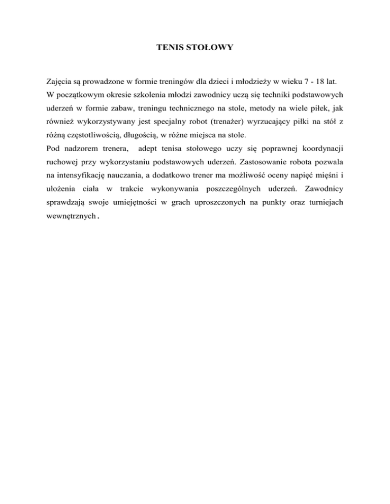 TENIS STOŁOWY Zajęcia są prowadzone w formie treningów dla dzieci i młodzieży w wieku 7 - 18 lat. W początkowym okresie szkolenia młodzi zawodnicy uczą się techniki podstawowych uderzeń w formie zabaw, treningu technicznego na stole, metody na wiele piłek, jak również wykorzystywany jest specjalny robot (trenażer) wyrzucający piłki na stół z różną częstotliwością, długością, w różne miejsca na stole. Pod nadzorem trenera, adept tenisa stołowego uczy się poprawnej koordynacji ruchowej przy wykorzystaniu podstawowych uderzeń. Zastosowanie robota pozwala na intensyfikację nauczania, a dodatkowo trener ma możliwość oceny napięć mięśni i ułożenia ciała w trakcie wykonywania poszczególnych uderzeń. Zawodnicy sprawdzają swoje umiejętności w grach uproszczonych na punkty oraz turniejach wewnętrznych.