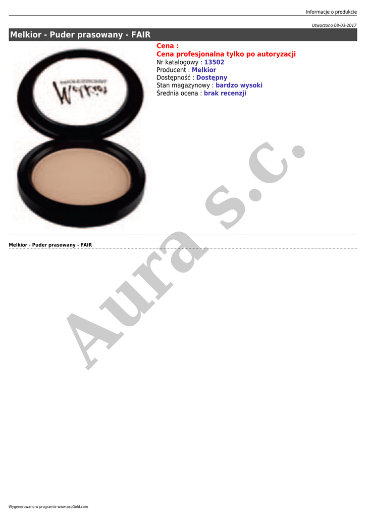 Informacje o produkcie Utworzono 08-03-2017 Melkior - Puder prasowany - FAIR Cena : Cena profesjonalna tylko po autoryzacji s. c. Nr katalogowy : 13502 Producent : Melkior Dostępność : Dostępny Stan magazynowy : bardzo wysoki Średnia ocena : brak recenzji Au r a Melkior - Puder prasowany - FAIR Wygenerowano w programie www.oscGold.com