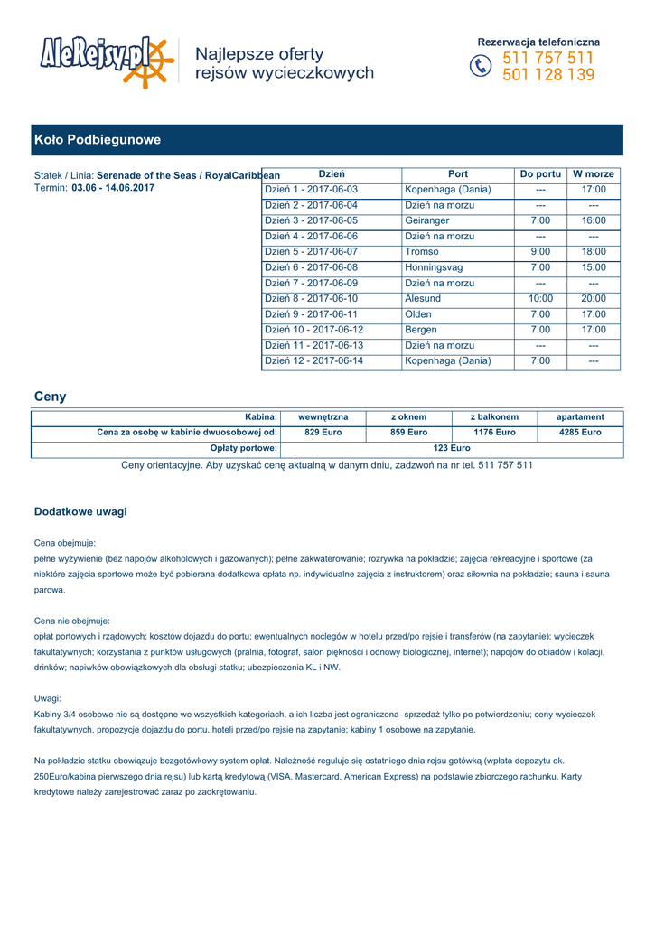Koło Podbiegunowe Dzień Statek / Linia: Serenade of the Seas / RoyalCaribbean Termin: 03.06 - 14.06.2017 Dzień 1 - 2017-06-03 Port Do portu W morze --- 17:00 Kopenhaga (Dania) Dzień 2 - 2017-06-04 Dzień na morzu Dzień 3 - 2017-06-05 Geiranger --- --- 7:00 16:00 Dzień 4 - 2017-06-06 Dzień na morzu --- --- Dzień 5 - 2017-06-07 Dzień 6 - 2017-06-08 Tromso 9:00 18:00 Honningsvag 7:00 15:00 Dzień 7 - 2017-06-09 Dzień na morzu --- --- Dzień 8 - 2017-06-10 Alesund 10:00 20:00 Dzień 9 - 2017-06-11 Olden 7:00 17:00 Dzień 10 - 2017-06-12 Bergen 7:00 17:00 Dzień 11 - 2017-06-13 Dzień na morzu --- --- Dzień 12 - 2017-06-14 Kopenhaga (Dania) 7:00 --- Ceny Kabina: Cena za osobę w kabinie dwuosobowej od: wewnętrzna z oknem 829 Euro 859 Euro Opłaty portowe: z balkonem apartament 1176 Euro 4285 Euro 123 Euro Ceny orientacyjne. Aby uzyskać cenę aktualną w danym dniu, zadzwoń na nr tel. 511 757 511 Dodatkowe uwagi Cena obejmuje: pełne wyżywienie (bez napojów alkoholowych i gazowanych); pełne zakwaterowanie; rozrywka na pokładzie; zajęcia rekreacyjne i sportowe (za niektóre zajęcia sportowe może być pobierana dodatkowa opłata np. indywidualne zajęcia z instruktorem) oraz siłownia na pokładzie; sauna i sauna parowa. Cena nie obejmuje: opłat portowych i rządowych; kosztów dojazdu do portu; ewentualnych noclegów w hotelu przed/po rejsie i transferów (na zapytanie); wycieczek fakultatywnych; korzystania z punktów usługowych (pralnia, fotograf, salon piękności i odnowy biologicznej, internet); napojów do obiadów i kolacji, drinków; napiwków obowiązkowych dla obsługi statku; ubezpieczenia KL i NW. Uwagi: Kabiny 3/4 osobowe nie są dostępne we wszystkich kategoriach, a ich liczba jest ograniczona- sprzedaż tylko po potwierdzeniu; ceny wycieczek fakultatywnych, propozycje dojazdu do portu, hoteli przed/po rejsie na zapytanie; kabiny 1 osobowe na zapytanie. Na pokładzie statku obowiązuje bezgotówkowy system opłat. Należność reguluje się ostatniego dnia rejsu gotówką (wpłata depozytu ok. 250Euro/kabina pierwszego dnia rejsu) lub kartą kredytową (VISA, Mastercard, American Express) na podstawie zbiorczego rachunku. Karty kredytowe należy zarejestrować zaraz po zaokrętowaniu. Serenade of the Seas Rok budowy 2003Liczba pokładów 12Liczba kabin 1050Udział balkonów 54%Liczba pasażerów 2100 osóbLiczba załogi 859 osóbSzerokość 32 metrówDługość 293 metrówWyporność 90090 ton Statki klasy Radiance, a wśród nich Serenade of the Seas, zostały zaprojektowane na wzór eleganckich jachtów. Mimo iż są to statki mniejsze, ich wnętrza są bardziej obszerne i przeszklone, dzięki czemu statki są pełne światła. Serenade of the Seas to jeden z najnowszych statków floty Royal Caribbean, jest połączeniem luksusu, komfortu i wspaniałej zabawy. Na pokładzie tego statku czeka na Państwa wiele atrakcji, spośród których każdy pasażer znajdzie coś dla siebie: osoby aktywne fizycznie mają możliwość podziwiania morskiego pejzażu ze szczytu ściany wspinaczkowej, natomiast osoby pragnące relaksu i spokoju mogą udać się do centrum SPA. Statkiem Serenade of the Seas bardzo często podróżują rodziny z dziećmi i młode osoby. Główne atrakcje na statku:restauracje i barykawiarnietematyczne sale klubowedyskoteki2 baseny i 4 jacuzzikinoteatrkasyno Royaleściana wspinaczkowaboisko sportowetrasa do bieganiasymulator do gry w golfacentrum dziecięco-młodzieżoweAdventure Ocean - program dla dziecigaleria sklepówbibliotekacentrum odnowy biologicznej - fitness center, siłownia, aerobic, sauna, salon pięknościcentrum konferencyjne, które może pomieścić 425 osób - do dyspozycji fax, ksero, drukarki, dostęp do Internetusala multimedialna dla 60 osób - wyposażona w najnowszy sprzęt konferencyjnysala wykładowa dla 22 osób - do dyspozycji projektory, ekrany, mikrofony.