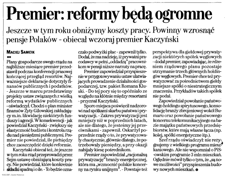 Premier: reformy będą ogromne Jeszcze w tym roku obniżymy koszty pracy. Powinny wzrosnąć pensje Polaków - obiecał wczoraj premier Kaczyński MACIEJ SAMCIK •• czało podwyżki plac - zapewnił tylko. Dodał, że ma nadzieję, iż prywatni praPlany gospodarcze swego rządu na codawcy wpełni „oddadzą" pracowninajbliższe miesiące premier przed- kom w pensji niższe narzuty na pracę. Premier zapowiedział przyspieszestawi] podczas konferencji prasowej kończącej przegląd resortów. Naj- nie w przygotowywaniu ustaw ułatwiaważniejsze deklaracje dotyczyły fi- jących prowadzenie działalności gosnansów publicznych i podatków. podarczej, tzw. pakiet Romana Klu- Jeszcze w marcu przedstawimy ski. - Do tej pory się to opóźniało ze projekty ustaw związanych z wielką względu na kłótnie między resortami reformą wydatków publicznych - przyznał Kaczyński. Sporo miejsca poświęcił nadzoro- oświadczył. Chodzi o plan minister finansów Zyty Gilowstóej zakładają- wi nad spółkami skarbu państwa i prycy m.in. likwidację niektórych fun- watyzacji. - Zakres prywatyzacji jest duszy i agencji. W konsekwencji -jak mniejszy niż w poprzednich latach, powiedział Kaczyński - zwiększy się ale nie dlatego, żejesteśmyjej przeelastyczność budżetu i kontrola rzą- ciwnikami - zapewnił. Oskarżył podu nad pieniędzmi publicznymi. Pre- przednie rządy o to, że prywatyzowamier nie powiedział, ile pieniędzy ły chaotycznie, głównie dlatego, że pochce zaoszczędzić dzięki reformie. trzebowały pieniędzy, a przy okazji Kaczyński obiecał też, że jeszcze nabijały kiesę pośrednikom. w tym roku rząd przeprowadzi przez Premier zapowiedział „racjonalną Sejm ustawę obniżającą koszty pra- prywatyzację" branży energetycznej, cy. Nie powiedział, które konkretnie która ma „wzmocnić polskie koncerskładki spadną i o ile. - To będzie ozna- ny na rynku unijnym". - Powstaje też 16-02-2007, Gazeta Wybo perspektywa dla giełdowej prywatyzacji niektórych spółek węglowych - dodał premier, zapowiadając, że rdzeniem rządowego planu pozostaje utrzymanie trzech głównych holdingów węglowych. Premier chce też prywatyzować za pośrednictwem giełdy mniejsze spółki o niestrategicznym znaczeniu. Przykładów takich spółek nie podał. Zapowiedział powołanie państwowego holdingu spirytusowego, konsolidację branży zbrojeniowej wokół Bumaru oraz powołanie państwowego koncernu telekomunikacyjnego na bazie majątku państwowych przedsiębiorstw, które mają własne łącza (np. kolej, spółki energetyczne itp.). Szef rządu oświadczył: nie rezygnujemy z wielkiego programu mieszkaniowego. Ale nie wspomniał o PiS-owskim programie 3 min mieszkań. Oględnie mówił tylko o tym, że „są nowe możliwości" przyspieszenia budowy nowych mieszkań, o