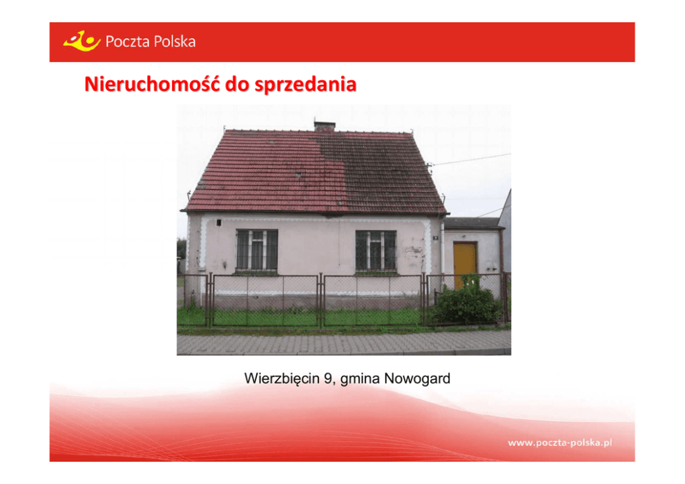 Nieruchomość do sprzedania Wierzbięcin 9, gmina Nowogard Przedmiot sprzedaży: Lokal użytkowy nr 1 o powierzchni użytkowej 38,32 m2 usytuowany na parterze budynku pomieszczenia o biurowo-mieszkalnego, łącznej powierzchni do którego przynależą dwa użytkowej 11,02 m2 znajdujące się w piwnicach tegoż budynku oraz dwa pomieszczenia o łącznej powierzchni użytkowej 89,58 m2 zlokalizowane w budynku gospodarczym wraz ze związanym z tym lokalem udziałem w wysokości 0,704 w częściach wspólnych budynków i w prawie użytkowania wieczystego działki gruntu oznaczonego w ewidencji gruntów numerem 54/2 o powierzchni 163 m2 oraz numerem 56 o powierzchni 212 m2 w miejscowości Wierzbięcin nr 9, gmina Nowogard, powiat goleniowski. Przedmiot sprzedaży: Miejscowość Wierzbięcin, woj. zachodniopomorskie Gmina / Powiat Nowogard / goleniowski Nr budynku i lokalu Wicimice nr 9, lokal nr 1 Powierzchnia użytkowa lokalu Lokal użytkowy o powierzchni użytkowej 38,32 m kw. zlokalizowany na parterze budynku biurowo-mieszkalnego, do którego przynależą dwa pomieszczenia o łącznej powierzchni użytkowej 11,02 m kw. znajdujące się w piwnicach tegoż budynku oraz dwa pomieszczenia o łącznej powierzchni użytkowej 89,58 m kw. zlokalizowane w budynku gospodarczym. Działka ewidencyjna 54/2 o obszarze 163 m kw. oraz 56 o powierzchni 212 m kw. w obrębie 0039 Wierzbięcin. Księga wieczysta Sąd Rejonowy w Goleniowie V Wydział Ksiąg Wieczystych prowadzi księgę wieczystą Kw. Nr SZ1O / 00020107 /5 Źródło: Geoportal 2_iMap Grunt Teren sprzedawanej nieruchomości składa się z: • działki nr 56/2 oraz działki nr 56 o kształcie regularnym prostokątnym, konfiguracja terenu płaska. • Nieruchomość zabudowana budynkiem biurowo-mieszkalnym oraz budynkiem gospodarczym. • Teren działki ogrodzony siatką stalową. • Zgodnie z Zaświadczeniem Urzędu Gminy Nowogard dla działek brak jest aktualnego planu zagospodarowania przestrzennego. • Zgodnie ze Studium Uwarunkowań i Kierunków Zagospodarowania Przestrzennego Miasta i Gminy Nowogard, uchwalonym Uchwałą Nr XLIV/345/02 Rady Miejskiej w Nowogardzie z dnia 27 czerwca 2002 r. zmienionego Uchwałą Nr XLIII/362/10 Rady Miejskiej w Nowogardzie z dnia 29 września 2010 r.: - działka nr 56 w obrębie Wierzbięcin oznaczona jest w studium symbolem graficznym w części jako tereny zabudowy usługowej (sklepy) - działka 54/2 w obrębie Wierzbięcin oznaczona jest w studium symbolem graficznym - tereny mieszkaniowe z dopuszczeniem funkcji uzupełniającej (usługi, rekreacja, komunikacja wew. itp.). Zespół budynków W tabeli zamieszczono zestawienie powierzchni obiektów znajdujących się na terenie nieruchomości. Obiekt 1 Budynek biurowo-mieszkalny 2 Budynek gospodarczy PU (m kw) 61,96 109,35 Razem: 171,31 Dostępność komunikacyjna • Nieruchomość zlokalizowana jest w środkowej części wsi Wierzbięcin przy drodze biegnącej przez wieś z Dobrej do Nowogardu, o średnim natężeniu ruchu drogowego. • Sąsiedztwo działki stanowi zabudowa mieszkaniowa wraz z towarzyszącymi zabudowaniami gospodarczymi, siedliska gospodarcze, a w dalszej odległości tereny rolne. • Dojazd i dostęp do nieruchomości o nawierzchni asfaltowej. dobry z drogi Otoczenie nieruchomości Nieruchomość graniczy: • od strony północnej – budynek gospodarczy dalej tereny rolne; • od strony południowej - droga relacji Dobra – Nowogard, dalej zabudowania gospodarcze oraz zabudowa mieszkaniowa zagrodowa z budynkami gospodarczymi; • od strony zachodniej – zabudowa mieszkaniowa zagrodowa z budynkami gospodarczymi oraz grunty rolne; • od strony wschodniej – droga gruntowa wewnętrzna, dalej zabudowa mieszkaniowa zagrodowa z budynkami gospodarczymi. Dane kontaktowe Prowadzący przetarg: Poczta Polska S.A. Pion Infrastruktury 70 – 940 Szczecin Al. Niepodległości 41/42 Bliższe informacje o nieruchomości można uzyskać: pod numerem tel. 91 440 14 64 Zastrzeżenia: Niniejsza broszura została sporządzona i udostępniona jedynie w celu ogólno informacyjnym i nie stanowi ze strony Poczty Polskiej S.A. oferty w rozumieniu prawa cywilnego, oświadczenia woli ani wiedzy, jak również jakiegokolwiek zapewnienia odnośnie nieruchomości, jej stanu lub poszczególnych treści objętych broszurą, wobec czego nabywca powinien na własną rękę przeprowadzić odpowiednie badania, zlecić dodatkowe ekspertyzy lub zaakceptować stan nieruchomości jako stan taki, w jakim nieruchomość znajduje się w dacie oględzin / sprzedaży.