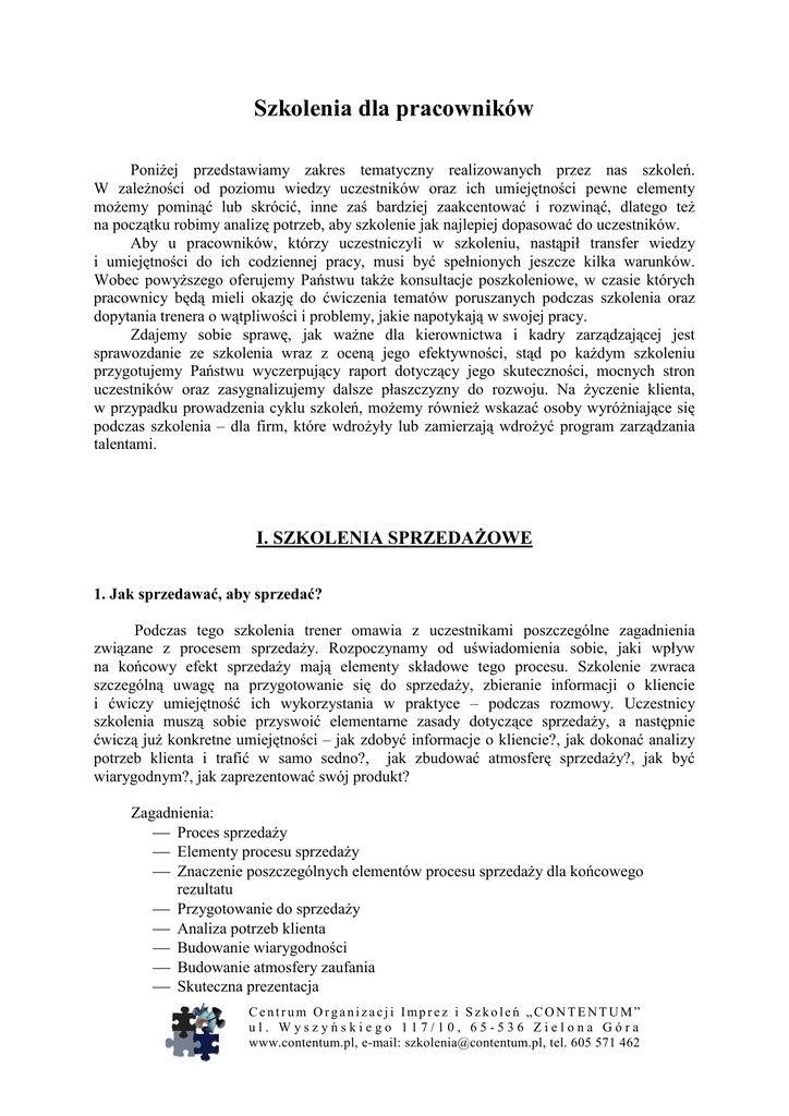 Szkolenia dla pracowników Poniżej przedstawiamy zakres tematyczny realizowanych przez nas szkoleń. W zależności od poziomu wiedzy uczestników oraz ich umiejętności pewne elementy możemy pominąć lub skrócić, inne zaś bardziej zaakcentować i rozwinąć, dlatego też na początku robimy analizę potrzeb, aby szkolenie jak najlepiej dopasować do uczestników. Aby u pracowników, którzy uczestniczyli w szkoleniu, nastąpił transfer wiedzy i umiejętności do ich codziennej pracy, musi być spełnionych jeszcze kilka warunków. Wobec powyższego oferujemy Państwu także konsultacje poszkoleniowe, w czasie których pracownicy będą mieli okazję do ćwiczenia tematów poruszanych podczas szkolenia oraz dopytania trenera o wątpliwości i problemy, jakie napotykają w swojej pracy. Zdajemy sobie sprawę, jak ważne dla kierownictwa i kadry zarządzającej jest sprawozdanie ze szkolenia wraz z oceną jego efektywności, stąd po każdym szkoleniu przygotujemy Państwu wyczerpujący raport dotyczący jego skuteczności, mocnych stron uczestników oraz zasygnalizujemy dalsze płaszczyzny do rozwoju. Na życzenie klienta, w przypadku prowadzenia cyklu szkoleń, możemy również wskazać osoby wyróżniające się podczas szkolenia – dla firm, które wdrożyły lub zamierzają wdrożyć program zarządzania talentami. I. SZKOLENIA SPRZEDAŻOWE 1. Jak sprzedawać, aby sprzedać? Podczas tego szkolenia trener omawia z uczestnikami poszczególne zagadnienia związane z procesem sprzedaży. Rozpoczynamy od uświadomienia sobie, jaki wpływ na końcowy efekt sprzedaży mają elementy składowe tego procesu. Szkolenie zwraca szczególną uwagę na przygotowanie się do sprzedaży, zbieranie informacji o kliencie i ćwiczy umiejętność ich wykorzystania w praktyce – podczas rozmowy. Uczestnicy szkolenia muszą sobie przyswoić elementarne zasady dotyczące sprzedaży, a następnie ćwiczą już konkretne umiejętności – jak zdobyć informacje o kliencie?, jak dokonać analizy potrzeb klienta i trafić w samo sedno?, jak zbudować atmosferę sprzedaży?, jak być wiarygodnym?, jak zaprezentować swój produkt? Zagadnienia: Proces sprzedaży Elementy procesu sprzedaży Znaczenie poszczególnych elementów procesu sprzedaży dla końcowego rezultatu Przygotowanie do sprzedaży Analiza potrzeb klienta Budowanie wiarygodności Budowanie atmosfery zaufania Skuteczna prezentacja Centrum Organizacji Imprez i Szkoleń „CONTENTUM” ul. Wyszyńskiego 117/10, 65-536 Zielona Góra www.contentum.pl, e-mail: [email protected], tel. 605 571 462 2. Trudny klient Szkolenie ma charakter typowo warsztatowy. Trener wraz z uczestnikami buduje typologię klientów i dostosowuje ćwiczenia do każdego z tych przypadków. W odróżnieniu od większości tego typu szkoleń, typologia wypracowywana jest na podstawie doświadczeń pracowników, ze szczególnym uwzględnieniem sytuacji dla nich trudnych. Ćwiczymy więc głównie te przypadki, które uczestnikom szkolenia nastręczają najwięcej trudności. Dodatkowym atutem szkolenia jest uwzględnienie relacji z klientami - jak je budować w przypadku różnych typów klientów i jak je utrzymywać. Zagadnienia: Typologia klientów Ćwiczenia praktyczne – jak sobie radzić gdy klient… Przezwyciężanie zastrzeżeń klientów Trudny klient Budowanie relacji Podtrzymywanie relacji 3. Przechwytywanie klientów konkurencji Szkolenie skierowane jest do osób, które mają za sobą podstawy sprzedaży. Dotyczy bowiem sytuacji najtrudniejszych, gdzie najczęściej spotykamy się z odmową – sytuacji, kiedy trafiamy na klienta konkurencji, na tę część rynku, która jest już zajęta. Jak sobie radzić w takich sytuacjach? Jak budować relację i przekonywać o zaletach współpracy z nami? Podczas szkolenia pokazujemy kilka zasad rządzących rozmową z klientem konkurencji, zasad prezentacji poprzez porównanie, ale przede wszystkim ćwiczymy umiejętności uczestników szkolenia – ich postawy w sytuacji odmowy, nieustępliwość i konsekwencję. Zagadnienia: Czym możemy konkurować – rozpoznanie konkurencji Nasze atuty – jak zwracać na nie uwagę Dotarcie do klienta – jak sprawić, by zechciał nas wysłuchać Aktywne słuchanie Zadawanie pytań Sztuka argumentowania Sztuka prezentacji Cechy, zalety, korzyści, opis Przezwyciężanie zastrzeżeń Kontakt po sprzedaży – zasada 333 Jak reaguję, kiedy ktoś mi odmawia – o postawie sprzedającego Centrum Organizacji Imprez i Szkoleń „CONTENTUM” ul. Wyszyńskiego 117/10, 65-536 Zielona Góra www.contentum.pl, e-mail: [email protected], tel. 605 571 462 4. Rozmowa przez telefon Kontakt bezpośredni z punktu widzenia sprzedającego jest znacznie prostszy. Bazując na kontakcie niewerbalnym, czytając mowę ciała swojego rozmówcy, a także kontrolując stopień jego rozproszenia, mamy więcej możliwości, aby osiągnąć swój cel. W przypadku rozmowy telefonicznej trudniej odczytać intencje naszego rozmówcy. Szczególne znaczenie ma tutaj ton głosu, konkret, czyli przekazywanie tylko tych informacji, które potrzebuje nasz rozmówca, aby nie zdążył znudzić się ani zainteresować czymś innym. Dlatego podczas szkolenia bardzo dużo czasu poświęca się na rozmowę i omawianie przypadków. Zagadnienia: Początek rozmowy – jak sprawić, żeby rozmówca nie odłożył słuchawki Sondowanie klienta Jak mówić – ton głosu Co mówić – czyli, czego oczekuje klient Prezentacja – fakty i konkrety Sztuka opowiadania Podtrzymanie kontaktu, czyli żelazna zasada rozmowy telefonicznej 5. 5S Szkolenie z 5S to często początek drogi firm produkcyjnych, które w bliższej bądź dalszej przyszłości zamierzają wdrożyć KANBAN, TPM itp. 5S jest jednym z najsympatyczniejszych szkoleń dla pracowników – nie tylko ułatwia i usprawnia ich pracę, eliminuje straty, ale także czyni miejsce ich pracy znacznie przyjemniejszym. Ład i porządek to te elementy, o których częst