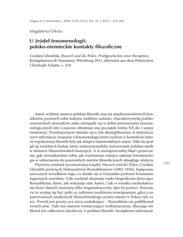 Lingua ac Communitas | ISSN 1230-3143| Vol. 22 | 2012 | 253-264 Magdalena Gilicka U źródeł fenomenologii: polsko-niemieckie kontakty filozoficzne Czesław Głombik, Husserl und die Polen. Frühgeschichte einer Rezeption, Königshausen & Neumann, Würzburg 2011, übersetzt aus dem Polnischen Christoph Schatte, s. 210 Autor, wybitny znawca polskiej filozofii oraz jej międzynarodowych kontekstów, postawił sobie kolejne ambitne zadanie: charakterystykę polsko-niemieckich stosunków, jakie zawiązały się w dobie powstawania fenomenologicznych idei (czasowo obejmuje ona początek wieku XX do I wojny światowej). Przedsięwzięcie okazało się o tyle skomplikowane, iż dotychczasowe informacje związane z fenomenologicznym ruchem w kontekście historii współczesnej filozofii były jak dotąd w katastrofalnym stanie. Nikt nie podjął się rzetelnych badań, które zrelacjonowałyby usytuowanie polskiej myśli w obszarze Husserlowskich koncepcji. A to niezaprzeczalny błąd i przeoczenie, gdy uświadomimy sobie, jak wyróżnione miejsce zajmuje fenomenologia w odniesieniu do pozostałych nurtów filozoficznych ubiegłego stulecia. Pierwszy rozdział recenzowanej książki: Husserl und die Polen, Czesław Głombik poświęcił Aleksandrowi Rozenblumowi (1883-1950), będącemu naocznym świadkiem tego, co działo się w Getyndze podczas fenomenologicznych narodzin. Cały rozdział obejmuje wątki biograficzne dotyczące Rozenbluma, które, jak wskazuje sam Autor, i tak w wyniku niedostatecznej ilości danych stanowią tylko fragmentaryczny opis tej postaci. Posunięcie to wydaje się być, póki co, jedynym możliwym rozwiązaniem, gdyż o zapatrywaniach naukowych Husserlowskiego ucznia wiemy w Polsce tyle co nic. Powód jest prosty, acz nieco zaskakujący – Rozenblum nie publikował swoich prac. Fakt ten stanowi wystarczające wytłumaczenie, dlaczego ów filozof jest całkowicie nieobecny w polskiej filozofii. Szczątkowe informacje |253 Magdalena Gilicka 254| na temat obszarów badawczych, jakie interesowały Rozenbluma, dostarcza nam, jako jeden z nielicznych, Roman Ingarden (Wspomnienia z Getyngi, Moi Koledzy getyngeńczycy). Ingarden podkreśla gruntowne przygotowanie filozoficzne Rozenbluma, kompetentną znajomość założeń fenomenologicznej metody. Wspomina także mnóstwo czasu wspólnie spędzonego na filozoficznych dysputach, podczas których, jak podaje twórca Sporu o istnienie świata, wiele od Rozenbluma zaczerpnął. Rozenblum przybył do „stolicy fenomenologii” w 1905 r. Jak podają archiwalia uniwersyteckie, studiował tam, choć z przerwami, przez 10 semestrów. Wnioskując za E. Stein, Rozenblum przebywał w kręgu fenomenologów w okresie najbardziej sprzyjającym rozwojowi ich myśli. Wtedy też, w 1907 r., powstało z inicjatywy T. Conrada Göttinger Philosophische Gesellschaft. Wzmianka ta jest o tyle istotna, iż Rozenblum należał do współzałożycieli tego Towarzystwa, co w otoczce stagnacji jego naukowej działalności stanowi dość ważny czynnik. Jak wyglądał pobyt tego filozofa w Getyndze? Otóż, po ukazaniu się Idei Husserla, uczęszczał on na prowadzone przez niego seminarium, które przeznaczone było dla najbardziej zaawansowanych studentów. Podczas tychże spotkań analizowano najtrudniejsze wątki dzieła. Brał także udział, wraz z R. Ingardenem i K. Ajdukiewiczem, w zajęciach prowadzonych przez A. Reinacha. Podczas tychże zajęć debatowano nad paradoksami Zenona z Elei oraz zagadnieniem ruchu. Tuż po śmierci Reinacha, który zginął na froncie w 1917 r., jego seminarzyści wykazali się inicjatywą uczczenia pamięci swojego profesora. Owocem tych starań miała być pamiątkowa księga złożona z poświęconych poległemu nauczycielowi artykułów. Najwięcej trudu inicjatywy jej powstania wykazała E. Stein, a swoją „cegiełkę” miał dołożyć również Rozenblum. Ten, początkowo odnoszący się z aprobatą do wydania księgi, w późniejszym czasie, w liście do Stein stwierdził, iż napisanie czegoś z jego strony jest rzeczą niewykonalną. Mimo ogromnych starań Stein, nie doszło do wydania księgi (ostatecznie ukazał się tom poświęcony Reinachowi Pisma zebrane, obejmujący dzieła samego myśliciela). Przeszkody wiązały się z uroczystościami, jakie uczniowie Husserla postanowili przedsięwziąć na okoliczność 60. urodzin twórcy fenomenologii. W tej sytuacji również postanowiono wydać tom prac poświęconych jubilatowi. Swoje publikacje przedłożyli m.in.: H. Lipps, A. Pfänder, E. Stein, H. Conars-Martius i R. Ingarden. Nadesłanie tekstu przez Rozenbluma znalazło taki sam finał, jak w przypadku księgi dla Reinacha – pomimo wcześniejszych deklaracji, już w końcowej fazie powstawania zbioru nie dołączył swojego artykułu. Zainteresowania naukowo-badawcze Rozenbluma koncentrują się nie tylko wokół fenomenologii. W polskim środowisku akademickim dał się Lingua ac Communitas | ISSN 1230-3143| Vol. 22 | 2012 | 253-264 poznać przede wszystkim jako wykładowca psychologii w Państwowej Wyższej Szkole Higieny Psychicznej w Warszawie. Z racji wspomnianego już braku dorobku naukowego, z którym wiąże się trud pieczołowitego ustalenia naukowych priorytetów Rozenbluma, jedynymi źródłami, które donoszą o zainteresowaniach tego uczonego, są dwa stowarzyszenia: Polskie Towarzystwo Psychologiczne (polityczne pobudki zadecydowały, iż nie można było nazwać go „filozoficznym”) oraz Warszawski Instytut Filozoficzny. Na posiedzeniach tego pierwszego Rozenblum wystąpił jako prelegent referatu O metodzie fenomenologicznej. Husserlowska metoda była kompletnie nieznana słuchaczom Towarzystwa, a Rozenblum był pierwszym warszawskim popularyzatorem fenomenologii. Jeśli chodzi o działalność Rozenbluma w Warszawskim Instytucie Filozoficznym – wyglądała ona nieco inaczej niż w przypadku pierwszej organizacji. Współpracował on z Instytutem, lecz nie należał do