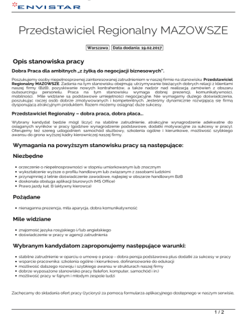 Oferta pracy Przedstawiciel Regionalny MAZOWSZE Warszawa Data dodania: 19.02.2017 Opis stanowiska pracy Dobra Praca dla ambitnych „z żyłką do negocjacji biznesowych”. Poszukujemy osoby niepełnosprawnej zainteresowanej zatrudnieniem w naszej firmie na stanowisku Przedstawiciel Regionalny MAZOWSZE. Zadania na tym stanowisku obejmują: utrzymywanie bieżących dobrych relacji z klientami naszej firmy (B2B), pozyskiwanie nowych kontrahentów, a także nadzór nad realizacją zamówień z obszaru outsourcingu personelu. Praca na tym stanowisku wymaga dobrej prezencji, komunikatywności, mobilności. Mile widziane są podstawowe umiejętności negocjacyjne. Nie wymagamy dużego doświadczenia, poszukując raczej osób dobrze zmotywowanych i kompetentnych. Jesteśmy dynamicznie rozwijającą się firmą dysponującą atrakcyjnym produktem. Razem możemy osiągnąć duże sukcesy. Przedstawiciel Regionalny – dobra praca, dobra płaca… Wybrany kandydat będzie mógł liczyć na stabilne zatrudnienie, atrakcyjne wynagrodzenie adekwatne do osiąganych wyników w pracy (godziwe wynagrodzenie podstawowe, dodatki motywacyjne za sukcesy w pracy). Oferujemy też szereg udogodnień: samochód służbowy, szkolenia ogólne i kierunkowe, możliwość szybkiego awansu do grona wyższej kadry kierowniczej naszej firmy. Wymagania na powyższym stanowisku pracy są następujące: Niezbędne orzeczenie o niepełnosprawności w stopniu umiarkowanym lub znacznym wykształcenie wyższe o profilu handlowym lub związanym z zasobami ludzkimi przynajmniej 2 letnie doświadczenie zawodowe, najlepiej w obszarze handlowym B2B doskonała obsługa aplikacji biurowych (MS Office) Prawo jazdy kat. B (aktywny kierowca) Pożądane nienaganna prezencja, miła aparycja, dobra komunikatywność Mile widziane znajomość języka rosyjskiego i/lub angielskiego doświadczenie w pracy w agencji zatrudnienia Wybranym kandydatom zaproponujemy następujące warunki: stabilne zatrudnienie w oparciu o umowę o pracę - dobra pensja podstawowa plus dodatki za sukcesy w pracy wsparcie pracownika: szkolenia ogólne i kierunkowe, dofinansowanie do edukacji możliwość dalszego rozwoju i szybkiego awansu w strukturach naszej firmy dobrze wyposażone stanowisko pracy (telefon, komputer, samochód i in.) możliwość pracy w fajnym i młodym zespole ludzi Zachęcamy do składania ofert pracy (życiorys) za pomocą formularza aplikacyjnego dostępnego w naszym serwisie, 1/2 Oferta pracy lub pocztą elektroniczną na adres [email protected] Rekrutacja jest prowadzona w trybie ciągłym aż do odwołania, tj. do momentu zatrudnienia pasującej nam osoby. Więcej informacji o ofercie można uzyskać pod numerem telefonu 531 092 995. Zapraszamy do składania ofert! Envistar Sp. z o.o. zastrzega sobie prawo skontaktowania się jedynie z wybranymi kandydatami. Nadesłane oferty nie podlegają zwrotowi. Po zakończonym procesie rekrutacji są niszczone. Kandydaci zobowiązani są zamieścić na nadsyłanych ofertach następującą klauzulę: „Wyrażam zgodę na przetwarzanie moich danych osobowych dla potrzeb niezbędnych dla realizacji procesu rekrutacji (zgodnie z ustawą z dn. 29.08.97 roku o Ochronie Danych Osobowych Dz. Ust Nr 133 poz. 883).” 2/2 Powered by TCPDF (www.tcpdf.org)