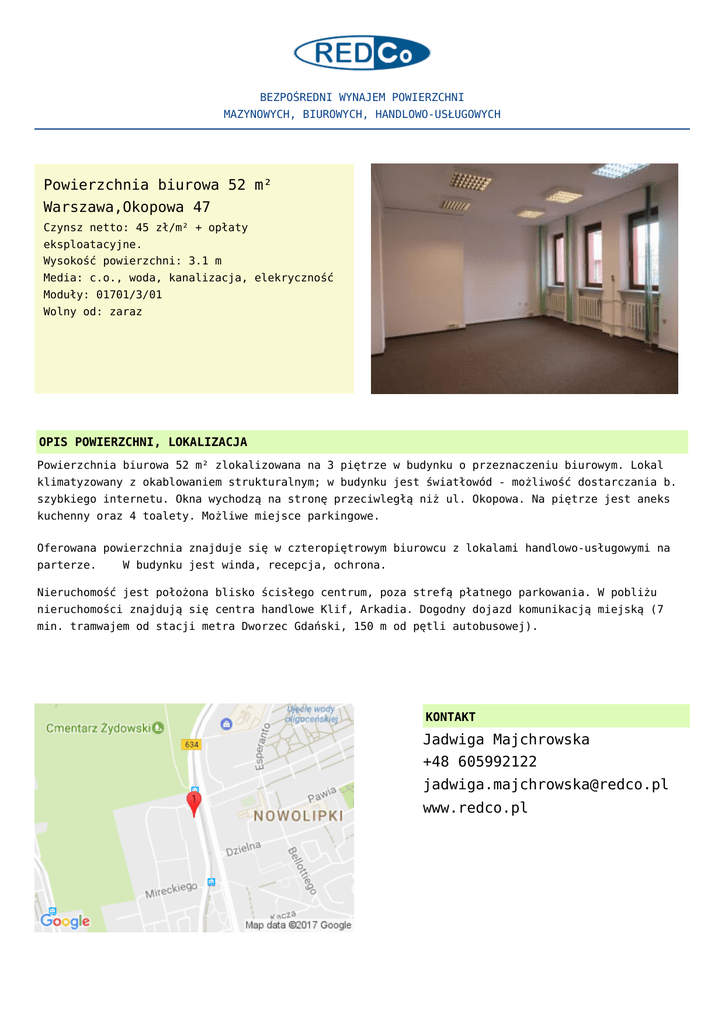 BEZPOŚREDNI WYNAJEM POWIERZCHNI MAZYNOWYCH, BIUROWYCH, HANDLOWO-USŁUGOWYCH Powierzchnia biurowa 52 m² Warszawa,Okopowa 47 Czynsz netto: 45 zł/m² + opłaty eksploatacyjne. Wysokość powierzchni: 3.1 m Media: c.o., woda, kanalizacja, elekryczność Moduły: 01701/3/01 Wolny od: zaraz OPIS POWIERZCHNI, LOKALIZACJA Powierzchnia biurowa 52 m² zlokalizowana na 3 piętrze w budynku o przeznaczeniu biurowym. Lokal klimatyzowany z okablowaniem strukturalnym; w budynku jest światłowód - możliwość dostarczania b. szybkiego internetu. Okna wychodzą na stronę przeciwległą niż ul. Okopowa. Na piętrze jest aneks kuchenny oraz 4 toalety. Możliwe miejsce parkingowe. Oferowana powierzchnia znajduje się w czteropiętrowym biurowcu z lokalami handlowo-usługowymi na parterze. W budynku jest winda, recepcja, ochrona. Nieruchomość jest położona blisko ścisłego centrum, poza strefą płatnego parkowania. W pobliżu nieruchomości znajdują się centra handlowe Klif, Arkadia. Dogodny dojazd komunikacją miejską (7 min. tramwajem od stacji metra Dworzec Gdański, 150 m od pętli autobusowej). KONTAKT Jadwiga Majchrowska +48 605992122 [email protected] www.redco.pl