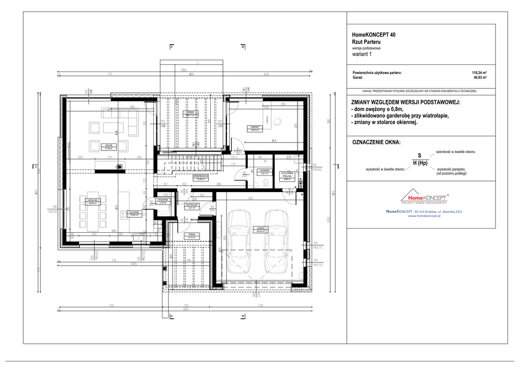 HomeKONCEPT 40 Rzut Parteru B A wersja podstawowa wariant 1 Powierzchnia użytkowa parteru: Garaż: 110,24 m² 40,93 m² UWAGA: PREZENTOWANY RYSUNEK SZCZEGÓŁOWY NIE STANOWI DOKUMENTACJI TECHNICZNEJ ZMIANY WZGLĘDEM WERSJI PODSTAWOWEJ: - dom zwężony o 0,8m, - zlikwidowano garderobę przy wiatrołapie, - zmiany w stolarce okiennej. TARAS 26,77 m² GABINET 18,81 m² OZNACZENIE OKNA: SALON 31,52m² S H (Hp) C ŁAZIENKA 4,41 m² KOMUNIKACJA 12,38 m² SPIŻARNIA 2,18 m² JADALNIA 20,94 m² wysokość w świetle otworu szerokość w świetle otworu wysokość parapetu (od poziomu podłogi) KOTŁOWNIA PRALNIA 4,88 m² WIATROŁAP 4,51 m² HomeKONCEPT 30-314 Kraków, ul. Dworska 23/1 www.homekoncept.pl KUCHNIA 10,62 m² GARAŻ 40,93 m² TARAS 13,12 m² B A HomeKONCEPT 40 Rzut Piętra wersja podstawowa A B wariant 1 Powierzchnia użytkowa piętra: Taras: 137,55 m² 16,57 m² UWAGA: PREZENTOWANY RYSUNEK SZCZEGÓŁOWY NIE STANOWI DOKUMENTACJI TECHNICZNEJ ZMIANY WZGLĘDEM WERSJI PODSTAWOWEJ: - dom zwężony o 0,8m, - zlikwidowano garderobę przy wiatrołapie, - zmiany w stolarce okiennej. TARAS 16,58 m² GARDEROBA 5,66 m² SYPIALNIA 16,89 m² OZNACZENIE OKNA: C GARDEROBA 5,87 m² S H (Hp) C wysokość w świetle otworu szerokość w świetle otworu wysokość parapetu (od poziomu podłogi) KOMUNIKACJA 14,46 m² SYPIALNIA 28,54 m² ŁAZIENKA 10,72 m² SYPIALNIA 17,59 m² HomeKONCEPT 30-314 Kraków, ul. Dworska 23/1 www.homekoncept.pl GABINET 10,91 m² GARDEROBA 9,58 m² ŁAZIENKA 17,33 m² B A