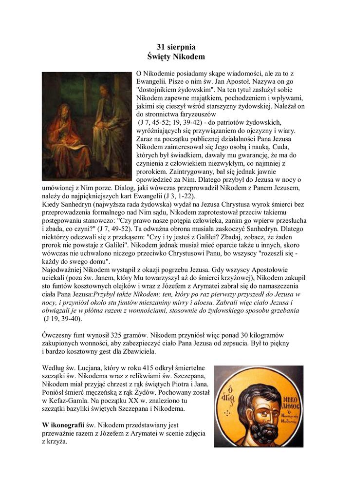 31 sierpnia Święty Nikodem O Nikodemie posiadamy skąpe wiadomości, ale za to z Ewangelii. Pisze o nim św. Jan Apostoł. Nazywa on go "dostojnikiem żydowskim". Na ten tytuł zasłużył sobie Nikodem zapewne majątkiem, pochodzeniem i wpływami, jakimi się cieszył wśród starszyzny żydowskiej. Należał on do stronnictwa faryzeuszów (J 7, 45-52; 19, 39-42) - do patriotów żydowskich, wyróżniających się przywiązaniem do ojczyzny i wiary. Zaraz na początku publicznej działalności Pana Jezusa Nikodem zainteresował się Jego osobą i nauką. Cuda, których był świadkiem, dawały mu gwarancję, że ma do czynienia z człowiekiem niezwykłym, co najmniej z prorokiem. Zaintrygowany, bał się jednak jawnie opowiedzieć za Nim. Dlatego przybył do Jezusa w nocy o umówionej z Nim porze. Dialog, jaki wówczas przeprowadził Nikodem z Panem Jezusem, należy do najpiękniejszych kart Ewangelii (J 3, 1-22). Kiedy Sanhedryn (najwyższa rada żydowska) wydał na Jezusa Chrystusa wyrok śmierci bez przeprowadzenia formalnego nad Nim sądu, Nikodem zaprotestował przeciw takiemu postępowaniu stanowczo: "Czy prawo nasze potępia człowieka, zanim go wpierw przesłucha i zbada, co czyni?" (J 7, 49-52). Ta odważna obrona musiała zaskoczyć Sanhedryn. Dlatego niektórzy odezwali się z przekąsem: "Czy i ty jesteś z Galilei? Zbadaj, zobacz, że żaden prorok nie powstaje z Galilei". Nikodem jednak musiał mieć oparcie także u innych, skoro wówczas nie uchwalono niczego przeciwko Chrystusowi Panu, bo wszyscy "rozeszli się każdy do swego domu". Najodważniej Nikodem wystąpił z okazji pogrzebu Jezusa. Gdy wszyscy Apostołowie uciekali (poza św. Janem, który Mu towarzyszył aż do śmierci krzyżowej), Nikodem zakupił sto funtów kosztownych olejków i wraz z Józefem z Arymatei zabrał się do namaszczenia ciała Pana Jezusa:Przybył także Nikodem; ten, który po raz pierwszy przyszedł do Jezusa w nocy, i przyniósł około stu funtów mieszaniny mirry i aloesu. Zabrali więc ciało Jezusa i obwiązali je w płótna razem z wonnościami, stosownie do żydowskiego sposobu grzebania (J 19, 39-40). Ówczesny funt wynosił 325 gramów. Nikodem przyniósł więc ponad 30 kilogramów zakupionych wonności, aby zabezpieczyć ciało Pana Jezusa od zepsucia. Był to piękny i bardzo kosztowny gest dla Zbawiciela. Według św. Lucjana, który w roku 415 odkrył śmiertelne szczątki św. Nikodema wraz z relikwiami św. Szczepana, Nikodem miał przyjąć chrzest z rąk świętych Piotra i Jana. Poniósł śmierć męczeńską z rąk Żydów. Pochowany został w Kefaz-Gamla. Na początku XX w. znaleziono tu szczątki bazyliki świętych Szczepana i Nikodema. W ikonografii św. Nikodem przedstawiany jest przeważnie razem z Józefem z Arymatei w scenie zdjęcia z krzyża. 11 lipca Św. Olga Mądra Księżna kijowska Olga, zwana Mądrą, jest jedyną świętą o tym imieniu. Była żoną księcia Igora z rodu Rurykowiczów, dynastii wywodzonej od Ruryka, legendarnego wodza Normanów. Swojej wielkiej mądrości i dalekowzroczności dowiodła przez zainicjowanie dzieła chrystianizacji pogańskiej Rusi nie tylko w oparciu o wschodnie cesarstwo, ale i o Rzym. Dała się poznać z twardej ręki, zwłaszcza wobec wszelkich buntowników, ale sławiona jest także za swe wielkie miłosierdzie. Urodziła się ok. 890 roku w Wybuti, kilkanaście kilometrów od Pskowa. Około 903 roku poślubiła księcia Igora, a kiedy w 945 roku małżonek zginął na wojnie, została sama z trzyletnim synkiem Światosławem. Objęła wówczas regencję i zaczęła sprawować rządy. Rychło dowiodła swego zmysłu administracyjnego, kładąc fundamenty pod stabilizację wielkiego księstwa kijowskiego. Chrzest przyjęła, prawdopodobnie, w 955 roku, a uczyniła to za pośrednictwem wysłanników Bizancjum. Dwa lata później, w towarzystwie popa Grzegorza, udała się osobiście do Konstantynopola, gdzie powitał ją cesarz. Ale w 959 roku zwróciła się na Zachód do Ottona I, z prośbą o przysłanie na Ruś biskupa misyjnego - cesarz wyznaczył Adalberta, benedyktyna z Trewiru - oraz kapłanów. Krzewiła wiarę, otaczając się prawie wyłącznie chrześcijanami, a także wznosząc świątynie: Świętej Trójcy w Pskowie i Świętej Zofii w Kijowie. Po objęciu tronu kijowskiego przez Świętosława nastąpił powrót do pogaństwa, a w 961 r. biskup łaciński został zamordowany. Olga, oddana wówczas modlitwie i uczynkom miłosierdzia, prosiła Boga o nawrócenie syna. Zmarła w 969 roku. Kiedy metropolita Hilarion wygłaszał pochwałę na cześć jej wnuka, św. Włodzimierza - pierwszego chrześcijańskiego władcy Rusi - nie zapomniał o zasługach babki. Ciało św. Olgi zostało wtedy przeniesione do kościoła św. Zofii, a w XVIII wieku relikwie zaginęły.