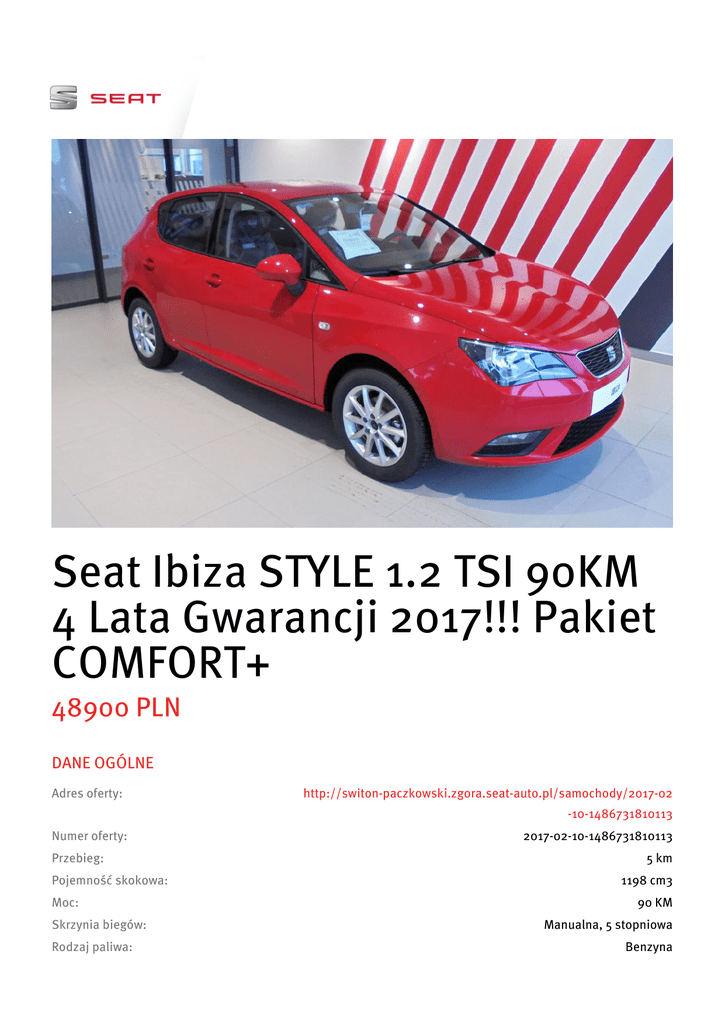 Seat Ibiza STYLE 1.2 TSI 90KM 4 Lata Gwarancji 2017!!! Pakiet COMFORT+ 48900 PLN DANE OGÓLNE Adres oferty: http://switon-paczkowski.zgora.seat-auto.pl/samochody/2017-02 -10-1486731810113 Numer oferty: Przebieg: Pojemność skokowa: Moc: Skrzynia biegów: Rodzaj paliwa: 2017-02-10-1486731810113 5 km 1198 cm3 90 KM Manualna, 5 stopniowa Benzyna Nadwozie: Hatchback Liczba drzwi: 5 Liczba miejsc: 5 Kolor: Emocion Ret Rok produkcji: 2017 WYPOSAŻENIE / ABS / Bluetooth / Centralny zamek / Czujniki parkowania tylne / Elektryczne szyby przednie / Elektrycznie ustawiane lusterka / ESP (stabilizacja toru jazdy) / Gniazdo AUX / Gniazdo SD / Gniazdo USB / Immobilizer / Isofix / Klimatyzacja manualna / MP3 / Poduszka powietrzna kierowcy / Poduszka powietrzna pasażera / Radio fabryczne / Światła do jazdy dziennej / Wielofunkcyjna kierownica / Wspomaganie kierownicy OPIS Autoryzowany Dealer SEAT oferuje MODEL: IBIZA WERSJA: STYLE SILNIK: 1.2 TSI 90 KM ROK PRODUKCJI: 2017 Podana cena dotyczy zakupu na Firmę lub Grupę Zawodową - leasing lub płatność gotówką. Pakiet COMFORT+ dla wersji Style- Czujniki parkowania z tyłu- 15-calowe felgi aluminiowe IBIA- Pakiet LED: Podwójne reflektory ze światłami do jazdy dziennej LED i tylne światła LED WYPOSAŻENIE STANDARDOWE Ibiza 5D 1.2 TSI 90KM - STYLE: Wnętrze - Oświetlenie wnętrza z lampkami do czytania + oświetlenie bagażnika - 2 uchwyty na napoje z przodu- Uchwyt na napoje z tyłu- Gniazdo 12 V z przodu- Kieszenie w oparciach przednich foteliSchowki w panelach drzwi przednich- Osłony przeciwsłoneczne dla kierowcy i pasażera z zamykanymi lusterkami- Zamykany i podświetlany schowek o pojemności 10.7 l w desce rozdzielczej- Kolumna kierownicy z regulacją w pionie i poziomie- Wielofunkcyjna kierownica, gałka dźwigni zmiany biegów i dźwignia hamulca ręcznego obszyte skórą- Panel drzwi przednich z tkaniny- Chromowane elementy dekoracyjne deski rozdzielczej- Zagłówki z regulacją wysokości w przednich i tylnych (zewnętrznych) fotelach- Centralny zagłówek z tyłu- Składana i dzielona tylna kanapa- Fotel kierowcy z regulacją wysokości- Fotele Comfort - czarna, czarne elementy dekoracyjne. Elektronika- Reflektory przeciwmgielne z przodu z funkcją doświetlania zakrętówŚwiatła do jazdy dziennej- Pojedyncze reflektory jednoogniskowe- Media System Colour: 5-calowy kolorowy ekran dotykowy,Radio,Złącza USB, SD, Aux-in, 6 głośników, Bluetooth, Wielofunkcyjna kierownica ze sterowaniem radiem i telefonem, Komputer pokładowy- Komputer pokładowy- Klimatyzacja manualna Climatic. Nadwozie- Zawieszenie COMFORT- Koło zapasowe- Tylny spoiler z dodatkowym światłem- STOP;Błyszczące, czarne słupki B i C- Zderzaki w kolorze nadwozia- Klamki i lusterka lakierowane w kolorze nadwozia Bezpieczeństwo- Centralny zamek z pilotem- Elektrycznie regulowane i podgrzewane lusterka boczneElektrycznie sterowane szyby z przodu- 4 lata Ochrony Gwarancji SEAT- Boczne poduszki powietrzne dla kierowcy i pasażera- Przednie poduszki powietrzne dla kierowcy i pasażera- System przypominający o konieczności zapięcia pasów na 2 fotelach- Trzypunktowe pasy bezpieczeństwa przy tylnych siedzeniach- Aktywacja układu ostrzegania o gwałtownym hamowaniu (światła awaryjne + migające światła „STOP”)Zaczepy iSOFIX i Top Tether przy siedzeniach tylnej kanapy (1+1)- Automatyczny hamulec pokolizyjny ograniczający skutki kolejnych kolizji (Multi Collision Brake)- System kontroli ciśnienia w ogumieniu ze wskaźnikiem ostrzegawczym- ABS, ESC, ASR i EBA- Asystent Podjazdu Kolor samochodu: Emotion Red 4 LATA GWARANCJI SEAT to przyjemne uczucie, wiedzieć że Twój samochód jest zabezpieczony przed kosztami niespodziewanych napraw. Nowe samochody SEAT objęte są gwarancją przez 4 lata lub do 120 000 kilometrów przebiegu (w tym pierwsze dwa lata bez limitu przebiegu). Gwarancja nie ma ograniczeń terytorialnych.ZAPRASZAMY DO SALONU NA JAZDĘ PRÓBNĄ! W ofercie posiadamy bardzo atrakcyjne formy finansowania:- dla klientów indywidualnych Moc Trzech ZER - dla firm Leasing 101,99% oraz Leasing z wysoką wartością końcową. Szczegóły u doradców handlowych – Zapraszamy! W ROZUMIENIU ART. 71 KODEKSU CYWILNEGO POWYŻSZA OFERTA NIE STANOWI OFERTY HANDLOWEJ/ Kontakt z doradcą: Adam Stolarski; 660 618 041/ [email protected]