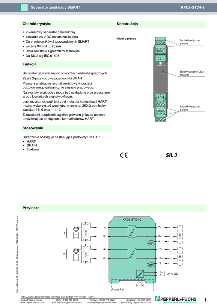 Separator zasilający SMART KFD2-STC4-2 Konstrukcja Charakterystyka • • • • • • 2-kanałowy separator galwaniczny zasilanie 24 V DC (szyna zasilająca) Do przetworników 2-przewodowych SMART wyjżcie 0/4 mA ... 20 mA Bloki zacisków z gniazdami testowymi Do SIL 2 wg IEC 61508 Widok z przodu Zaciski rozłączne zielone 3 6 1 2 4 5 Funkcja KFD2-STC4-2 Separator galwaniczny do obwodów nieiskrobezpiecznych. Zielony wskaźnik LED: zasilanie PWR Zasila 2-przewodowe przetworniki SMART. Przesyła analogowy sygnał wejściowy w postaci odizolowanego galwanicznie sygnału prądowego. Na sygnały analogowe mogą być nakładane oraz przesyłane w obu kierunkach sygnały cyfrowe. 7 8 9 10 11 12 13 14 15 Jeśli rezystancja pętli jest zbyt mała dla komunikacji HART, można wykorzystać wewnętrzny rezystor 250 Ω pomiędzy zaciskami 8, 9 oraz 11 i 12. Zaciski rozłączne zielone Z zaciskami urządzenia są zintegrowane gniazda testowe umożliwiające podłączenie komunikatorów HART. Stosowanie Urządzenie obsługuje następujące protokoły SMART: • HART • BRAIN • Foxboro 3 Data publikacji 2016-08-08 11:11 7- 3- 8+ 250 Ω II 9 4+ 10- 6- 11+ 250 Ω HART 1+ HART I HART KFD2-STC4-2 HART Data wydania 2016-08-08 228753_pol.xml Przyłącze 12 14+ 15- 24 V DC 24 V DC Power Rail Patrz „Uwagi ogólne dotyczące informacji o produktach firmy Pepperl+Fuchs”. Grupa Pepperl+Fuchs USA: +1 330 486 0002 Niemcy: +49 621 776 2222 www.pepperl-fuchs.com [email protected] [email protected] Singapur: +65 6779 9091 [email protected] 1 Dane techniczne KFD2-STC4-2 Dane ogólne typ sygnału Wejżcie analogowe Zasilanie Przyłącze Napięcie znamionowe tętnienie prądu szyna zasilająca lub zaciski 14+, 15Un 20 ... 35 V DC w granicach tolerancji zasilania Strata mocy 1,8 W Pobór mocy ≤ 2,7 W wejście Przyłącze zaciski 1+, 3-; 4+, 6- sygnał wejściowy 0/4 ... 20 mA Napięcie pracy jałowej / prąd zwarcia zaciski 1+, 3-; 4+, 6-: 22,1 V / 38 mA Dostępne napięcie zaciski 1+, 3: ≥ 16 V przy 20 mA Wyjście Przyłącze zaciski 7-, 8+; 10-, 11+ Obciążenie 0 ... 550 Ω przy 20 mA Sygnał wyjżciowy 4 ... 20 mA (przeciążenie > 25 mA) tętnienie prądu ≤ 50 µA eff właściwości transmisji odchylenie Wpływ temperatury otoczenia zakres częstotliwości czas ustalania się Czas narastania/zanikania przy temperaturze 20°C (68 °F), 0/4 ... 20 mA ≤ 10 µ A, obejmując kalibrację, liniowość, histerezę, obciążenia, wahania napięcia zasilania 0,25 µA/K wejście do wyjścia: pasmo przenoszenia dla sygnału 1 Vpp 0 ... 7,5 kHz (-3 dB) wyjście do wejścia: pasmo przenoszenia dla sygnału 1 Vpp 0,3 ... 7,5 kHz (-3 dB) 200 µs 20 µs Izolacja elektryczna wejście / wyjście wejście / zasilanie izolacja podstawowa zgodna z IEC 61010-1, napięcie znamionowe izolacji 300 Veff izolacja podstawowa zgodna z IEC 61010-1, napięcie znamionowe izolacji 300 Veff Wyjżcie / zasilanie izolacja robocza, napięcie znamionowe izolacji 50 V AC wejście / wejście izolacja podstawowa zgodna z IEC 61010-1, napięcie znamionowe izolacji 300 Veff Wyjżcie / wyjżcie izolacja robocza, napięcie znamionowe izolacji 50 V AC Zgodność z dyrektywami Kompatybilność elektromagnetyczna Dyrektywa 2014/30/UE EN 61326-1:2013 (lokalizacja ośrodków przemysłowych) Zgodnożć Kompatybilność elektromagnetyczna NE 21:2011 Stopień ochrony IEC 60529:2001 zabezpieczenie przed porażeniem elektrycznym EN 61010-1:2010 Warunki otoczenia Temperatura otoczenia -20 ... 60 °C (-4 ... 140 °F) Stopień ochrony IP 20 Masa ok. 150 g Wymiary 20 × 124 × 115 mm , typ obudowy B2 Montaż montaż na szynie znormalizowanej 35 mm wg EN 60715:2001 Informacje ogólne Informacja uzupełniająca Stosownie do wymagań należy przestrzegać informacji na temat zgodności, deklaracji zgodności, atestów zgodności i instrukcji. Aby uzyskać więcej informacji, zob. www.pepperl-fuchs.com. Data publikacji 2016-08-08 11:11 Data wydania 2016-08-08 228753_pol.xml Specyfikacja mechaniczna Patrz „Uwagi ogólne dotyczące informacji o produktach firmy Pepperl+Fuchs”. Grupa Pepperl+Fuchs USA: +1 330 486 0002 Niemcy: +49 621 776 2222 www.pepperl-fuchs.com [email protected] [email protected] Singapur: +65 6779 9091 [email protected] 2 Dane techniczne KFD2-STC4-2 Akcesoria Moduł dostarczania prądu stałego KFD2-EB2 Ten moduł dostarczania prądu stałego jest wykorzystywany do łączenia urządzeń 24 V DC za pomocą szyny zasilania. Wyposażony w bezpiecznik moduł dostarczania prądu stałego może obsługiwać do 150 pojedynczych urządzeń, w zależności od poziomu zużycia energii przez poszczególne urządzenia. Styki mechaniczne z galwaniczną izolacją używają szyny zasilania do przekazywania zebranych komunikatów błędów. Szyna zasilania UPR-03 (Power Rail) Szyna zasilania UPR-03 to kompletna jednostka składająca się z gniazd elektrycznych i szyny profilu aluminiowego o wymiarach 35 mm x 15 mm. Aby działała, wystarczy po prostu podłączyć urządzenia. Szyna profilowa K-DUCT z szyną zasilania Szyna profilowa K-DUCT to profil aluminiowy z umieszczoną w nim szyną zasilania i dwoma zintegrowanymi kanałami kablowymi do kabli systemowych i połączeniowych. Zestaw ten nie wymaga zatem użycia żadnych dodatkowych kabli. Data publikacji 2016-08-08 11:11 Data wydania 2016-08-08 228753_pol.xml Szyna zasilania i szyna profilowa nie musz¹ byæ pod³¹czone za pomoc¹ zacisków do poszczególnych urz¹dzeñ! Patrz „Uwagi ogólne dotyczące informacji o produktach firmy Pepperl+Fuchs”. Grupa Pepperl+Fuchs USA: +1 330 486 0002 Niemcy: +49 621 776 2222 www.pepperl-fuchs.com [email protected] [email protected] Singapur: +65 6779 9091 [email protected] 3
