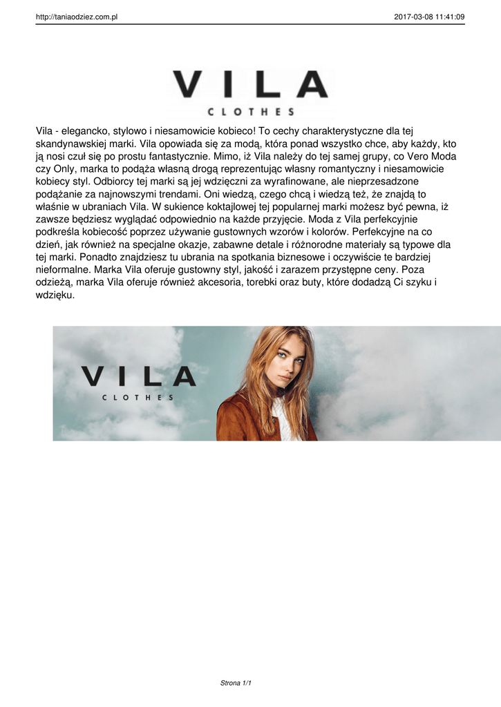 http://taniaodziez.com.pl 2017-03-08 11:41:09 Vila - elegancko, stylowo i niesamowicie kobieco! To cechy charakterystyczne dla tej skandynawskiej marki. Vila opowiada się za modą, która ponad wszystko chce, aby każdy, kto ją nosi czuł się po prostu fantastycznie. Mimo, iż Vila należy do tej samej grupy, co Vero Moda czy Only, marka to podąża własną drogą reprezentując własny romantyczny i niesamowicie kobiecy styl. Odbiorcy tej marki są jej wdzięczni za wyrafinowane, ale nieprzesadzone podążanie za najnowszymi trendami. Oni wiedzą, czego chcą i wiedzą też, że znajdą to właśnie w ubraniach Vila. W sukience koktajlowej tej popularnej marki możesz być pewna, iż zawsze będziesz wyglądać odpowiednio na każde przyjęcie. Moda z Vila perfekcyjnie podkreśla kobiecość poprzez używanie gustownych wzorów i kolorów. Perfekcyjne na co dzień, jak również na specjalne okazje, zabawne detale i różnorodne materiały są typowe dla tej marki. Ponadto znajdziesz tu ubrania na spotkania biznesowe i oczywiście te bardziej nieformalne. Marka Vila oferuje gustowny styl, jakość i zarazem przystępne ceny. Poza odzieżą, marka Vila oferuje również akcesoria, torebki oraz buty, które dodadzą Ci szyku i wdzięku. Strona 1/1
